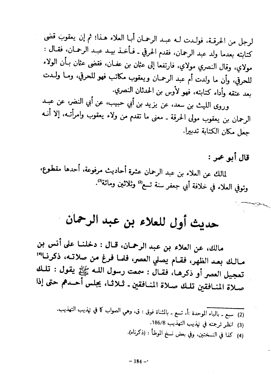 لرجل من الحرقة فولدت له عبد الرحمان أَبَا الْعَلَاءِ هَذَا ثُمَّ إِنَّ يَعْقُوبَ قَضَى كتابته بعدما ولد عبد الرحمان فقدم الحرقي فأخذ بيد عبد الرحمان فَقَالَ مَوْلَايَ وَقَالَ النَّصْرِيُّ مَوْلَايَ فَارْتَفَعَا إِلَى عُثْمَانَ بْنِ عَفَّانَ فَقَضَى عُثْمَانُ بِأَنَّ الْوَلَاءَ للحرقي وأن ما ولدت أم عبد الرحمان ويعقوب مكاتب فهو للحدقي وَمَا وَلَدَتْ بَعْدَ عِتْقِهِ وَأَدَاءِ كِتَابَتِهِ فَهُوَ لِأَوْسِ بْنِ الْحَدَثَانِ النَّصْرِيِّ وَرَوَى اللَّيْثُ بْنُ سَعْدٍ عَنْ يَزِيدَ بْنِ أَبِي حَبِيبٍ عَنْ أَبِي النضر عن عبد الرحمان بْنِ يَعْقُوبَ مَوْلَى الْحُرْقَةِ مَعْنَى مَا تَقَدَّمَ مِنْ وَلَاءِ يَعْقُوبَ وَامْرَأَتِهِ إِلَّا أَنَّهُ جَعَلَ مَكَانَ الْكِتَابَةِ تَدْبِيرًا قَالَ أَبُو عُمَرَ لِمَالِكٍ عن العلاء بن عبد الرحمان عَشَرَةُ أَحَادِيثَ مَرْفُوعَةٍ أَحَدُهَا مَقْطُوعٌ وَتُوُفِّيَ الْعَلَاءُ فِي خِلَافَةِ أَبِي جَعْفَرٍ سَنَةَ تِسْعٍ وَثَلَاثِينَ وَمِائَةٍ