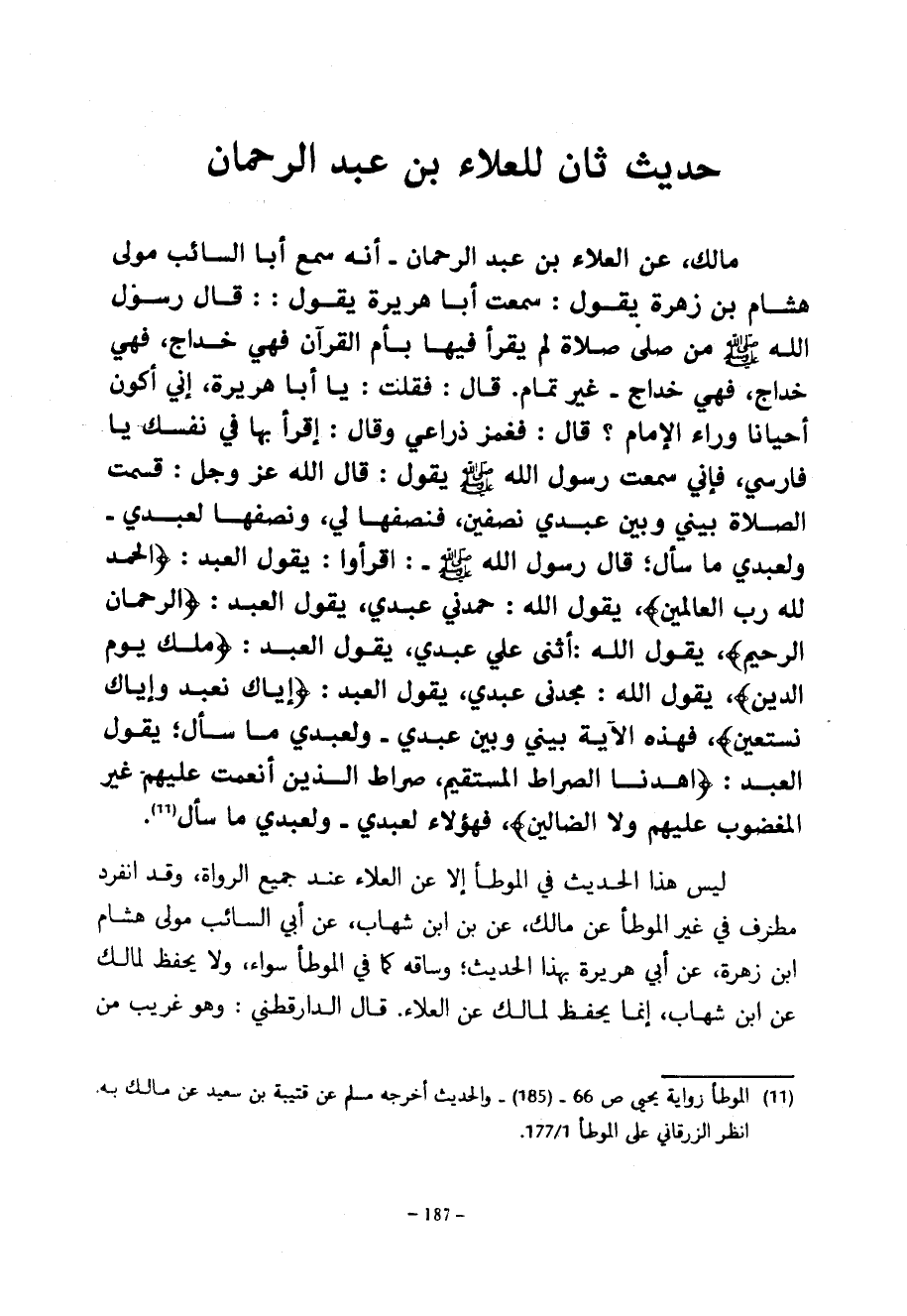حديث ثان للعلاء بن عبد الرحمان مالك عن العلاء بن عبد الرحمان أَنَّهُ سَمِعَ أَبَا السَّائِبِ مَوْلَى هِشَامِ بْنِ زُهْرَةَ يَقُولُ سَمِعْتُ أَبَا هُرَيْرَةَ يَقُولُ قَالَ رَسُولُ اللَّهِ صَلَّى اللَّهُ عَلَيْهِ وَسَلَّمَ مَنْ صَلَّى صَلَاةً لَمْ يَقْرَأْ فِيهَا بِأُمِّ الْقُرْآنِ فَهِيَ خِدَاجٌ فَهِيَ خِدَاجٌ فَهِيَ خِدَاجٌ غَيْرُ تَمَامٍ قَالَ فَقُلْتُ يَا أَبَا هُرَيْرَةَ إِنِّي أَكُونُ أَحْيَانًا وَرَاءَ الْإِمَامِ قَالَ فَغَمَزَ ذِرَاعِي وَقَالَ اقْرَأْ بِهَا فِي نَفْسِكَ يَا فَارِسِيُّ فَإِنِّي سَمِعْتُ رَسُولَ اللَّهِ صَلَّى اللَّهُ عَلَيْهِ وَسَلَّمَ يَقُولُ قَالَ اللَّهُ عَزَّ وَجَلَّ قَسَمْتُ الصَّلَاةَ بَيْنِي وَبَيْنَ عَبْدِي نِصْفَيْنِ فَنِصْفُهَا لِي وَنِصْفُهَا لِعَبْدِي وَلِعَبْدِي مَا سَأَلَ قَالَ رَسُولُ اللَّهِ صَلَّى اللَّهُ عَلَيْهِ وَسَلَّمَ اقرأوا يَقُولُ الْعَبْدُ الْحَمْدُ لِلَّهِ رَبِّ الْعَالَمِينَ يَقُولُ الله حمدني عبدي يقول العبد الرحمان الرَّحِيمِ يَقُولُ اللَّهُ أَثْنَى عَلَيَّ عَبْدِي يَقُولُ العبد ملك يَوْمِ الدِّينِ يَقُولُ اللَّهُ مَجَّدَنِي عَبْدِي يَقُولُ الْعَبْدُ إِيَّاكَ نَعْبُدُ وَإِيَّاكَ نَسْتَعِينُ فَهَذِهِ الْآيَةُ بَيْنِي وَبَيْنَ عَبْدِي وَلِعَبْدِي مَا سَأَلَ يَقُولُ الْعَبْدُ اهْدِنَا الصِّرَاطَ الْمُسْتَقِيمَ صِرَاطَ الَّذِينَ أَنْعَمْتَ عَلَيْهِمْ غَيْرِ الْمَغْضُوبِ عَلَيْهِمْ وَلَا الضَّالِّينَ فَهَؤُلَاءِ لِعَبْدِي وَلِعَبْدِي مَا سَأَلَ لَيْسَ هَذَا الْحَدِيثُ فِي الْمُوَطَّإِ إِلَّا عَنِ الْعَلَاءِ عِنْدَ جَمِيعِ الرُّوَاةِ وَقَدِ انْفَرَدَ مُطَرِّفٌ فِي غَيْرِ الْمُوَطَّأِ عَنْ مَالِكٍ عَنِ ابْنِ شِهَابٍ عَنْ أَبِي السائب مولى هشام ابن زُهْرَةَ عَنْ أَبِي هُرَيْرَةَ بِهَذَا الْحَدِيثِ وَسَاقَهُ في الموطأ سواء ولا يحفظ لمالك عن ابن شهاب إنما يحفظ لمالك عَنِ الْعَلَاءِ قَالَ الدَّارَقُطْنِيُّ وَهُوَ غَرِيبٌ مِنْ