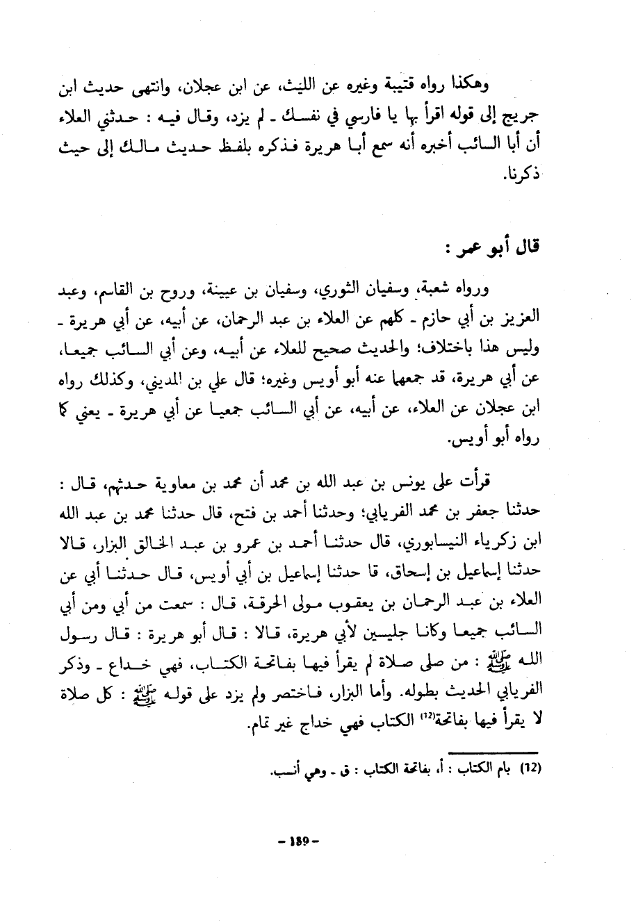 وَهَكَذَا رَوَاهُ قُتَيْبَةُ وَغَيْرُهُ عَنِ اللَّيْثِ عَنِ ابن عجلان وانتهى حديث أبو جُرَيْجٍ إِلَى قَوْلِهِ اقْرَأْ بِهَا يَا فَارِسِيُّ فِي نَفْسِكَ لَمْ يَزِدْ وَقَالَ فِيهِ حَدَّثَنِي الْعَلَاءُ أَنَّ أَبَا السَّائِبِ أَخْبَرَهُ أَنَّهُ سَمِعَ أَبَا هُرَيْرَةَ فَذَكَرَهُ بِلَفْظِ حَدِيثِ مَالِكٍ إِلَى حَيْثُ ذَكَرْنَا قَالَ أَبُو عُمَرَ وَرَوَاهُ شُعْبَةُ وَسُفْيَانُ الثَّوْرِيُّ وَسُفْيَانُ بْنُ عُيَيْنَةَ وَرَوْحُ بْنُ الْقَاسِمِ وَعَبْدُ الْعَزِيزِ بْنُ أَبِي حَازِمٍ كُلُّهُمْ عن العلاء بن عبد الرحمان عَنْ أَبِيهِ عَنْ أَبِي هُرَيْرَةَ وَلَيْسَ هَذَا بِاخْتِلَافٍ وَالْحَدِيثُ صَحِيحٌ لِلْعَلَاءِ عَنْ أَبِيهِ وَعَنْ أَبِي السَّائِبِ جَمِيعًا عَنْ أَبِي هُرَيْرَةَ قَدْ جَمَعَهُمَا عَنْهُ أَبُو أُوَيْسٍ وَغَيْرُهُ قَالَ عَلِيُّ بْنُ الْمَدِينِيِّ وَكَذَلِكَ رَوَاهُ ابْنُ عَجْلَانَ عَنِ الْعَلَاءِ عَنْ أَبِيهِ عَنْ أَبِي السَّائِبِ جَمِيعًا عن أبي هيررة يَعْنِي كَمَا رَوَاهُ أَبُو أُوَيْسٍ قَرَأْتُ عَلَى يُونُسَ بْنِ عَبْدِ اللَّهِ بْنِ مُحَمَّدٍ أَنَّ مُحَمَّدَ بْنَ مُعَاوِيَةَ حَدَّثَهُمْ قَالَ حَدَّثَنَا جَعْفَرُ بْنُ مُحَمَّدٍ الْفِرْيَابِيُّ وَحَدَّثَنَا أَحْمَدُ بْنُ فَتْحٍ قَالَ حَدَّثَنَا مُحَمَّدُ بْنُ عبد الله ابن زكرياء النيسابروي قَالَ حَدَّثَنَا أَحْمَدُ بْنُ عَمْرِو بْنِ عَبْدِ الْخَالِقِ الْبَزَّارُ قَالَا حَدَّثَنَا إِسْمَاعِيلُ بْنُ إِسْحَاقَ قَالَ حَدَّثَنَا إِسْمَاعِيلُ بْنُ أَبِي أُوَيْسٍ قَالَ حدثنا أبي عن العلاء بن عبد الرحمان بْنِ يَعْقُوبَ مَوْلَى الْحُرْقَةِ قَالَ سَمِعْتُ مِنْ أبي ومن أبي السائب جمعيا وَكَانَا جَلِيسَيْنِ لِأَبِي هُرَيْرَةَ قَالَا قَالَ أَبُو هُرَيْرَةَ قَالَ رَسُولُ اللَّهِ صَلَّى اللَّهُ عَلَيْهِ وَسَلَّمَ مَنْ صَلَّى صَلَاةً لَمْ يَقْرَأْ فِيهَا بفاتحة الكتاب فهي خداع وَذَكَرَ الْفِرْيَابِيُّ الْحَدِيثَ بِطُولِهِ وَأَمَّا الْبَزَّارُ فَاخْتَصَرَ وَلَمْ يَزِدْ عَلَى قَوْلِهِ صَلَّى اللَّهُ عَلَيْهِ وَسَلَّمَ كُلُّ صَلَاةٍ لَا يُقْرَأُ فِيهَا بِفَاتِحَةِ الْكِتَابِ فَهِيَ خِدَاجٌ غَيْرُ تَمَامٍ