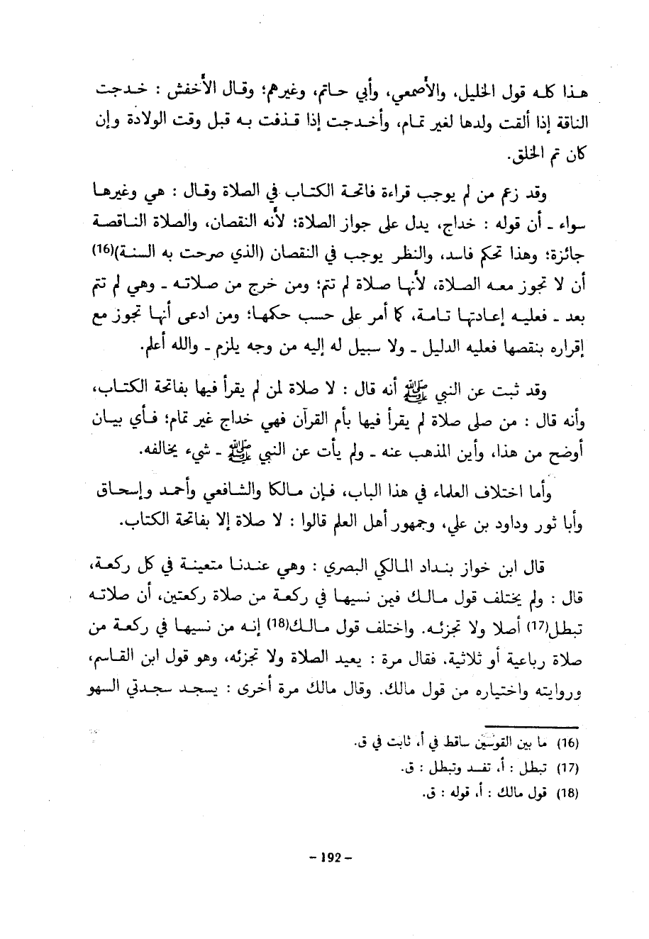 هَذَا كُلُّهُ قَوْلُ الْخَلِيلِ وَالْأَصْمَعِيِّ وَأَبِي حَاتِمٍ وَغَيْرِهِمْ وَقَالَ الْأَخْفَشُ خَدَجَتِ النَّاقَةُ إِذَا أَلْقَتْ وَلَدَهَا لِغَيْرِ تَمَامٍ وَأَخْدَجَتْ إِذَا قَذَفَتْ بِهِ قَبْلَ وَقْتِ الْوِلَادَةِ وَإِنْ كَانَ تَمَّ الْخَلْقُ وَقَدْ زَعَمَ مَنْ لَمْ يُوجِبْ قِرَاءَةَ فَاتِحَةِ الْكِتَابِ فِي الصَّلَاةِ وَقَالَ هِيَ وَغَيْرُهَا سَوَاءٌ أَنَّ قَوْلَهُ خِدَاجٌ يَدُلُّ عَلَى جَوَازِ الصَّلَاةِ لِأَنَّهُ النُّقْصَانُ وَالصَّلَاةُ النَّاقِصَةُ جَائِزَةٌ وَهَذَا تَحَكُّمٌ فَاسِدٌ وَالنَّظَرُ يُوجِبُ فِي النُّقْصَانِ (الَّذِي صَرَّحَتْ بِهِ السُّنَّةُ) أَنْ لَا تَجُوزَ مَعَهُ الصَّلَاةُ لِأَنَّهَا صَلَاةٌ لَمْ تَتِمَّ وَمَنْ خَرَجَ مِنْ صَلَاتِهِ وَهِيَ لَمْ تَتِمَّ بَعْدُ فَعَلَيْهِ إِعَادَتُهَا تَامَّةً كَمَا أُمِرَ عَلَى حَسَبِ حُكْمِهَا وَمَنِ ادَّعَى أَنَّهَا تَجُوزُ مَعَ إِقْرَارِهِ بِنَقْصِهَا فَعَلَيْهِ الدَّلِيلُ وَلَا سَبِيلَ لَهُ إِلَيْهِ مِنْ وَجْهٍ يُلْزِمُ وَاللَّهُ أَعْلَمُ وَقَدْ ثَبَتَ عَنِ النَّبِيِّ صَلَّى اللَّهُ عَلَيْهِ وَسَلَّمَ أَنَّهُ قَالَ لَا صَلَاةَ لِمَنْ لَمْ يَقْرَأْ فِيهَا بِفَاتِحَةِ الْكِتَابِ وَأَنَّهُ قَالَ مَنْ صَلَّى صَلَاةً لَمْ يَقْرَأْ فِيهَا بِأُمِّ الْقُرْآنِ فَهِيَ خِدَاجٌ غَيْرُ تَمَامٍ فَأَيُّ بَيَانٍ أَوْضَحَ مِنْ هَذَا وَأَيْنَ الْمَذْهَبُ عَنْهُ وَلَمْ يَأْتِ عَنِ النَّبِيِّ صَلَّى اللَّهُ عَلَيْهِ وَسَلَّمَ شَيْءٌ يُخَالِفُهُ وَأَمَّا اخْتِلَافُ الْعُلَمَاءِ فِي هَذَا الْبَابِ فَإِنَّ مَالِكًا وَالشَّافِعِيَّ وَأَحْمَدَ وَإِسْحَاقَ وَأَبَا ثَوْرٍ وداودَ بْنَ عَلِيٍّ وَجُمْهُورَ أَهْلِ الْعِلْمِ قَالُوا لَا صَلَاةَ إِلَّا بِفَاتِحَةِ الكتاب قال ابن خواز بنداد الْمَالِكِيُّ الْبَصْرِيُّ وَهِيَ عِنْدَنَا مُتَعَيِّنَةٌ فِي كُلِّ رَكْعَةٍ قَالَ وَلَمْ يَخْتَلِفْ قَوْلُ مَالِكٍ فِيمَنْ نَسِيَهَا فِي رَكْعَةٍ مِنْ صَلَاةِ رَكْعَتَيْنِ أَنَّ صَلَاتَهُ تَبْطُلُ أَصْلًا وَلَا تُجْزِئُهُ وَاخْتَلَفَ قَوْلُ مَالِكٍ إِنَّهُ مَنْ نَسِيَهَا فِي رَكْعَةٍ مِنْ صَلَاةٍ رُبَاعِيَّةٍ أَوْ ثُلَاثِيَّةٍ فَقَالَ مَرَّةً يُعِيدُ الصَّلَاةَ وَلَا تُجْزِئُهُ وَهُوَ قَوْلُ ابْنِ الْقَاسِمِ وَرِوَايَتُهُ وَاخْتِيَارُهُ مِنْ قَوْلِ مَالِكٍ وَقَالَ مَالِكٌ مَرَّةً أُخْرَى يَسْجُدُ سَجْدَتَيِ السَّهْوِ