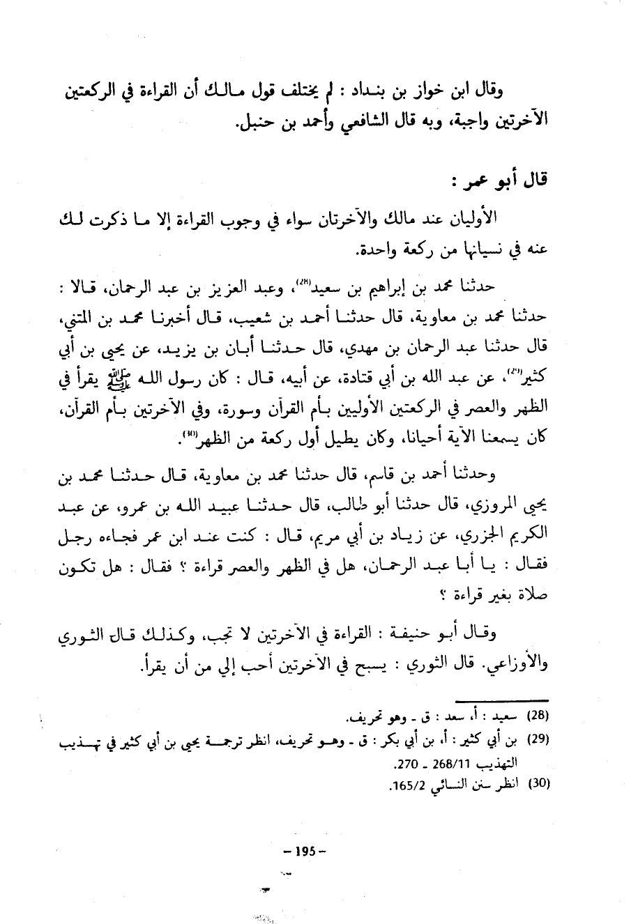 وقال ابن خواز بن بنداد لَمْ يَخْتَلِفْ قَوْلُ مَالِكٍ أَنَّ الْقِرَاءَةَ فِي الرَّكْعَتَيْنِ الْآخِرَتَيْنِ وَاجِبَةٌ وَبِهِ قَالَ الشَّافِعِيُّ وَأَحْمَدُ بْنُ حَنْبَلٍ قَالَ أَبُو عُمَرَ الْأُولَيَانِ عِنْدَ مَالِكٍ وَالْآخِرَتَانِ سَوَاءٌ فِي وُجُوبِ الْقِرَاءَةِ إِلَّا مَا ذَكَرْتُ لَكَ عَنْهُ فِي نِسْيَانِهَا مِنْ رَكْعَةٍ وَاحِدَةٍ حَدَّثَنَا مُحَمَّدُ بْنُ إِبْرَاهِيمَ بْنِ سَعِيدٍ وَعَبْدُ الْعَزِيزِ بْنِ عَبْدِ الرَّحْمَنِ قَالَا حَدَّثَنَا مُحَمَّدُ بْنُ مُعَاوِيَةَ قَالَ حَدَّثَنَا أَحْمَدُ بْنُ شُعَيْبٍ قَالَ أَخْبَرَنَا مُحَمَّدُ بْنُ المتني قال حدثنا عبد الرحمان بْنُ مَهْدِيٍّ قَالَ حَدَّثَنَا أَبَانُ بْنُ يَزِيدَ عَنْ يَحْيَى بْنُ أَبِي كَثِيرٍ عَنْ عَبْدُ اللَّهِ بْنُ أَبِي قَتَادَةَ عَنْ أَبِيهِ قَالَ كَانَ رَسُولُ اللَّهِ صَلَّى اللَّهُ عَلَيْهِ وَسَلَّمَ يَقْرَأُ فِي الظُّهْرِ وَالْعَصْرِ فِي الرَّكْعَتَيْنِ الْأُولَيَيْنِ بِأُمِّ الْقُرْآنِ وَسُورَةٍ وَفِي الْآخِرَتَيْنِ بِأُمِّ الْقُرْآنِ كَانَ يُسْمِعُنَا الْآيَةَ أَحْيَانًا وَكَانَ يُطِيلُ أَوَّلَ رَكْعَةٍ مِنَ الظُّهْرِ وَحَدَّثَنَا أَحْمَدُ بْنُ قَاسِمٍ قَالَ حَدَّثَنَا مُحَمَّدُ بْنُ مُعَاوِيَةَ قَالَ حَدَّثَنَا مُحَمَّدُ بْنُ يَحْيَى الْمَرْوَزِيُّ قَالَ حَدَّثَنَا أَبُو طَالِبٍ قَالَ حَدَّثَنَا عُبَيْدُ اللَّهِ بْنُ عَمْرٍو عَنْ عَبْدِ الْكَرِيمِ الْجَزَرِيِّ عَنْ زِيَادِ بْنِ أَبِي مَرْيَمَ قَالَ كُنْتُ عِنْدَ ابْنِ عُمَرَ فَجَاءَهُ رَجُلٌ فقال يا أبا عبد الرحمان هَلْ فِي الظُّهْرِ وَالْعَصْرِ قِرَاءَةٌ فَقَالَ هَلْ تَكُونُ صَلَاةٌ بِغَيْرِ قِرَاءَةٍ وَقَالَ أَبُو حَنِيفَةَ الْقِرَاءَةُ فِي الْآخِرَتَيْنِ لَا تَجِبُ وَكَذَلِكَ قَالَ الثَّوْرِيُّ وَالْأَوْزَاعِيُّ قَالَ الثَّوْرِيُّ يُسَبِّحُ فِي الْآخِرَتَيْنِ أَحَبُّ إِلَيَّ مِنْ أَنْ يَقْرَأَ