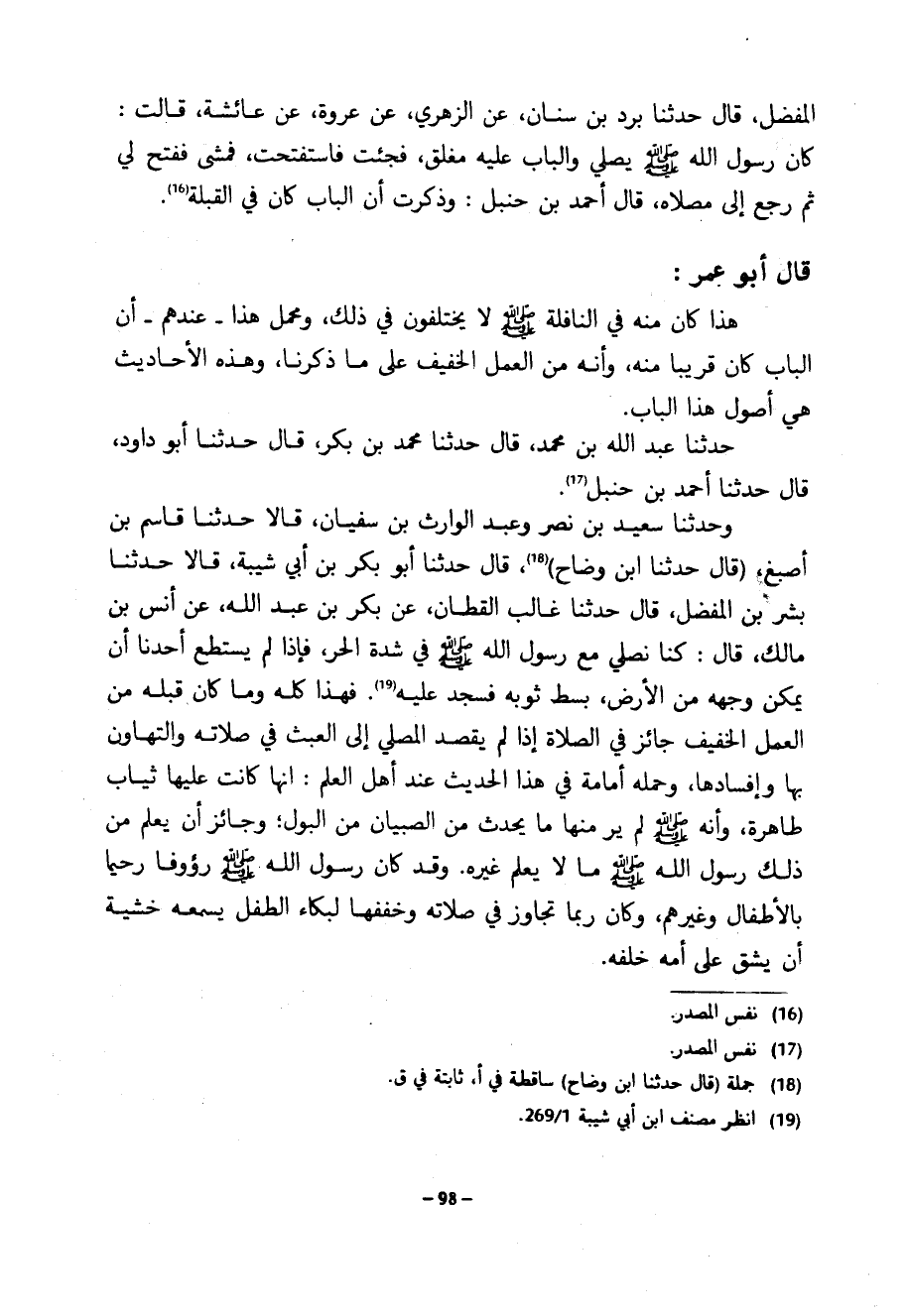 الْمُفَضَّلِ قَالَ حَدَّثَنَا بُرْدُ بْنُ سِنَانٍ عَنِ الزُّهْرِيِّ عَنْ عُرْوَةَ عَنْ عَائِشَةَ قَالَتْ كَانَ رَسُولُ اللَّهِ صَلَّى اللَّهُ عَلَيْهِ وَسَلَّمَ يُصَلِّي وَالْبَابُ عَلَيْهِ مُغْلَقٌ فَجِئْتُ فَاسْتَفْتَحْتُ فَمَشَى فَفَتَحَ لِي ثُمَّ رَجَعَ إِلَى مُصَلَّاهُ قَالَ أَحْمَدُ بْنُ حَنْبَلٍ وَذَكَرَتْ أَنَّ الْبَابَ كَانَ فِي الْقِبْلَةِ قَالَ أَبُو عُمَرَ هَذَا كَانَ مِنْهُ فِي النَّافِلَةِ صَلَّى اللَّهُ عَلَيْهِ وَسَلَّمَ لَا يَخْتَلِفُونَ فِي ذَلِكَ وَمَحْمَلَ هَذَا عِنْدَهُمْ أَنَّ الْبَابَ كَانَ قَرِيبًا مِنْهُ وَأَنَّهُ مِنَ الْعَمَلِ الْخَفِيفِ عَلَى مَا ذَكَرْنَا وَهَذِهِ الْأَحَادِيثُ هِيَ أُصُولُ هَذَا الْبَابِ حَدَّثَنَا عَبْدُ اللَّهِ بْنُ مُحَمَّدٍ قَالَ حَدَّثَنَا مُحَمَّدُ بْنُ بَكْرٍ قَالَ حَدَّثَنَا أَبُو دَاوُدَ قَالَ حَدَّثَنَا أَحْمَدُ بْنُ حَنْبَلٍ وَحَدَّثَنَا سَعِيدُ بْنُ نَصْرٍ وَعَبْدُ الْوَارِثِ بْنُ سفيان قالا حثدنا قَاسِمُ بْنُ أَصْبَغَ (قَالَ حَدَّثَنَا ابْنُ وَضَّاحٍ) قَالَ حَدَّثَنَا أَبُو بَكْرِ بْنُ أَبِي شَيْبَةَ قَالَا حَدَّثَنَا بِشْرُ بْنُ الْمُفَضَّلِ قَالَ حَدَّثَنَا غَالِبٌ الْقَطَّانُ عَنْ بَكْرِ بْنِ عَبْدِ اللَّهِ عَنْ أَنَسِ بْنِ مَالِكٍ قَالَ كُنَّا نُصَلِّي مَعَ رَسُولِ اللَّهِ صَلَّى اللَّهُ عَلَيْهِ وَسَلَّمَ فِي شِدَّةِ الْحَرِّ فَإِذَا لَمْ يَسْتَطِعْ أَحَدُنَا أَنْ يُمَكِّنَ وَجْهَهُ مِنَ الْأَرْضِ بَسَطَ ثَوْبَهُ فَسَجَدَ عَلَيْهِ فَهَذَا كُلُّهُ وَمَا كَانَ قَبْلَهُ مِنَ الْعَمَلِ الْخَفِيفِ جَائِزٌ فِي الصَّلَاةِ إِذَا لَمْ يَقْصِدِ الْمُصَلِّي إِلَى الْعَبَثِ فِي صَلَاتِهِ والتهاون بها وإفاسدها وَحَمْلُهُ أُمَامَةَ فِي هَذَا الْحَدِيثِ عِنْدَ أَهْلِ الْعِلْمِ أَنَّهَا كَانَتْ عَلَيْهَا ثِيَابٌ طَاهِرَةٌ وَأَنَّهُ صَلَّى اللَّهُ عَلَيْهِ وَسَلَّمَ لَمْ يَرَ مِنْهَا ما يحدث من الصبيان مِنَ الْبَوْلِ وَجَائِزٌ أَنْ يَعْلَمَ مِنْ ذَلِكَ رَسُولُ اللَّهِ صَلَّى اللَّهُ عَلَيْهِ وَسَلَّمَ ما لَا يَعْلَمُ غَيْرُهُ وَقَدْ كَانَ رَسُولُ اللَّهِ صَلَّى اللَّهُ عَلَيْهِ وَسَلَّمَ رؤوفا رَحِيمًا بِالْأَطْفَالِ وَغَيْرِهِمْ وَكَانَ رُبَّمَا تَجَاوَزَ فِي صلاته وخففها لبكاء الطفل يسمعه خشية أن يشق عَلَى أُمِّهِ خَلْفَهُ