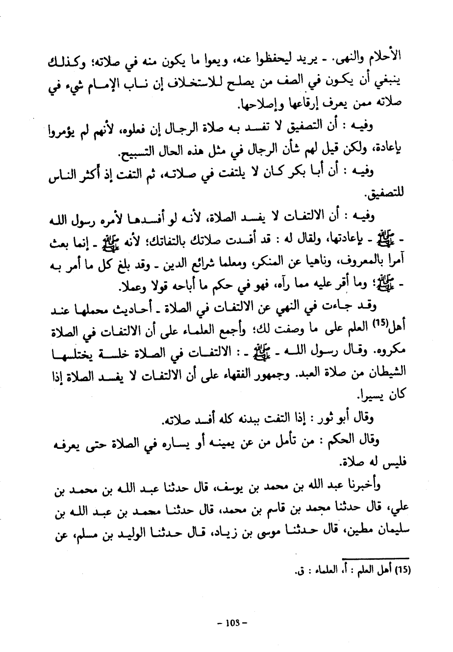 الْأَحْلَامِ وَالنُّهَى يُرِيدُ لِيَحْفَظُوا عَنْهُ وَيَعُوا مَا يَكُونُ مِنْهُ فِي صَلَاتِهِ وَكَذَلِكَ يَنْبَغِي أَنْ يَكُونَ فِي الصَّفِّ مَنْ يَصْلُحُ لِلِاسْتِخْلَافِ إِنْ نَابَ الْإِمَامَ شَيْءٌ فِي صَلَاتِهِ مِمَّنْ يَعْرِفُ إِرْقَاعَهَا وَإِصْلَاحَهَا وَفِيهِ أَنَّ التَّصْفِيقَ لَا تَفْسُدُ بِهِ صَلَاةُ الرِّجَالِ إِنْ فَعَلُوهُ لِأَنَّهُمْ لَمْ يُؤْمَرُوا بِإِعَادَةٍ وَلَكِنْ قِيلَ لَهُمْ شَأْنُ الرِّجَالِ فِي مِثْلِ هَذِهِ الْحَالِ التَّسْبِيحُ وَفِيهِ أَنَّ أَبَا بَكْرٍ كَانَ لَا يَلْتَفِتُ فِي صَلَاتِهِ ثُمَّ الْتَفَتَ إِذْ أَكْثَرَ النَّاسُ لِلتَّصْفِيقِ وَفِيهِ أَنَّ الِالْتِفَاتَ لَا يُفْسِدُ الصَّلَاةَ لِأَنَّهُ لَوْ أَفْسَدَهَا لَأَمَرَهُ رَسُولُ اللَّهِ صَلَّى اللَّهُ عَلَيْهِ وَسَلَّمَ بِإِعَادَتِهَا وَلَقَالَ لَهُ قَدْ أَفْسَدْتَ صَلَاتَكَ بِالْتِفَاتِكَ لِأَنَّهُ صَلَّى اللَّهُ عَلَيْهِ وَسَلَّمَ إِنَّمَا بعث آمرا بالمعروف وناهيا عن المنكر ومعلما شَرَائِعَ الدِّينِ وَقَدْ بَلَّغَ كُلَّ مَا أُمِرَ بِهِ صَلَّى اللَّهُ عَلَيْهِ وَسَلَّمَ وَمَا أَقَرَّ عَلَيْهِ مِمَّا رَآهُ فَهُوَ فِي حُكْمِ مَا أَبَاحَهُ قَوْلًا وَعَمَلًا وَقَدْ جَاءَتْ فِي النَّهْيِ عَنِ الِالْتِفَاتِ فِي الصَّلَاةِ أَحَادِيثُ مَحْمَلُهَا عِنْدَ أَهْلِ الْعِلْمِ عَلَى مَا وَصَفْتُ لَكَ وَأَجْمَعَ الْعُلَمَاءُ عَلَى أَنَّ الِالْتِفَاتَ فِي الصَّلَاةِ مَكْرُوهٌ وَقَالَ رَسُولُ اللَّهِ صَلَّى اللَّهُ عَلَيْهِ وَسَلَّمَ الِالْتِفَاتُ فِي الصَّلَاةِ خِلْسَةٌ يَخْتَلِسُهَا الشَّيْطَانُ مِنْ صَلَاةِ الْعَبْدِ وَجُمْهُورُ الْفُقَهَاءِ عَلَى أَنَّ الِالْتِفَاتَ لَا يُفْسِدُ الصَّلَاةَ إِذَا كَانَ يَسِيرًا وَقَالَ أَبُو ثَوْرٍ إِذَا الْتَفَتَ بِبَدَنِهِ كُلِّهِ أَفْسَدَ صَلَاتَهُ وَقَالَ الْحَكَمُ مَنْ تَأَمَّلَ مَنْ عَنْ يمينه أو يساره في الصلاة حتى يعرفه فَلَيْسَ لَهُ صَلَاةٌ وَأَخْبَرَنَا عَبْدُ اللَّهِ بْنُ مُحَمَّدِ بْنِ يُوسُفَ قَالَ حَدَّثَنَا عَبْدُ اللَّهِ بْنُ مُحَمَّدِ بْنِ عَلِيٍّ قَالَ حَدَّثَنَا مُحَمَّدُ بْنُ قَاسِمِ بْنِ مُحَمَّدٍ قَالَ حَدَّثَنَا مُحَمَّدُ بْنُ عَبْدِ اللَّهِ بْنِ سُلَيْمَانَ مُطَيَّنٌ قَالَ حَدَّثَنَا مُوسَى بْنُ زِيَادٍ قَالَ حَدَّثَنَا الْوَلِيدُ بْنُ مُسْلِمٍ عَنِ