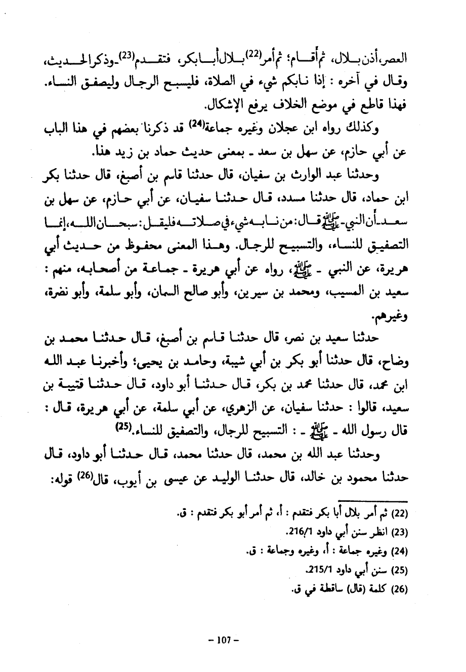 الْعَصْرِ أَذَّنَ بِلَالٌ ثُمَّ أَقَامَ ثُمَّ أَمَرَ بِلَالٌ أَبَا بَكْرٍ فَتَقَدَّمَ وَذَكَرَ الْحَدِيثَ وَقَالَ فِي آخِرِهِ إِذَا نَابَكُمْ شَيْءٌ فِي الصَّلَاةِ فَلْيُسَبِّحِ الرِّجَالُ وَلِيُصَفِّقِ النِّسَاءُ فَهَذَا قَاطِعٌ فِي مَوْضِعِ الْخِلَافِ يَرْفَعُ الْإِشْكَالَ وَكَذَلِكَ رَوَاهُ ابْنُ عَجْلَانَ وَغَيْرُهُ جَمَاعَةٌ قَدْ ذَكَرْنَا بَعْضَهُمْ فِي هَذَا الْبَابِ عَنْ أَبِي حَازِمٍ عَنْ سَهْلِ بْنِ سَعْدٍ بِمَعْنَى حَدِيثِ حَمَّادِ بْنِ زَيْدٍ هَذَا وَحَدَّثَنَا عَبْدُ الْوَارِثِ بْنُ سُفْيَانَ قَالَ حَدَّثَنَا قَاسِمُ بْنُ أَصْبَغَ قَالَ حَدَّثَنَا بَكْرُ ابن حَمَّادٍ قَالَ حَدَّثَنَا مُسَدَّدٌ قَالَ حَدَّثَنَا سُفْيَانُ عَنْ أَبِي حَازِمٍ عَنْ سَهْلِ بْنِ سَعْدٍ أَنَّ النَّبِيَّ صَلَّى اللَّهُ عَلَيْهِ وَسَلَّمَ قَالَ مَنْ نَابَهُ شَيْءٌ فِي صَلَاتِهِ فَلْيَقُلْ سُبْحَانَ اللَّهِ إِنَّمَا التَّصْفِيقُ لِلنِّسَاءِ وَالتَّسْبِيحُ لِلرِّجَالِ وَهَذَا الْمَعْنَى مَحْفُوظٌ مِنْ حَدِيثِ أَبِي هُرَيْرَةَ عَنِ النَّبِيِّ صَلَّى اللَّهُ عَلَيْهِ وَسَلَّمَ رَوَاهُ عَنْ أَبِي هُرَيْرَةَ جَمَاعَةٌ مِنْ أَصْحَابِهِ مِنْهُمْ سَعِيدُ بْنُ الْمُسَيَّبِ وَمُحَمَّدُ بْنُ سِيرِينَ وَأَبُو صَالِحٍ السَّمَّانُ وَأَبُو سَلَمَةَ وَأَبُو نَضْرَةَ وَغَيْرُهُمْ حَدَّثَنَا سَعِيدُ بْنُ نَصْرٍ قَالَ حَدَّثَنَا قَاسِمُ بْنُ أَصْبَغَ قَالَ حَدَّثَنَا مُحَمَّدُ بْنُ وَضَّاحٍ قَالَ حَدَّثَنَا أَبُو بَكْرِ بْنُ أَبِي شَيْبَةَ وَحَامِدُ بن يحيى وأخبرنا عبد الله ابن مُحَمَّدٍ قَالَ حَدَّثَنَا مُحَمَّدُ بْنُ بَكْرٍ قَالَ حَدَّثَنَا أَبُو دَاوُدَ قَالَ حَدَّثَنَا قُتَيْبَةُ بْنُ سَعِيدٍ قَالُوا حَدَّثَنَا سُفْيَانُ عَنِ الزُّهْرِيِّ عَنْ أَبِي سَلَمَةَ عَنْ أَبِي هُرَيْرَةَ قَالَ قَالَ رَسُولُ اللَّهِ صَلَّى اللَّهُ عَلَيْهِ وَسَلَّمَ التَّسْبِيحُ لِلرِّجَالِ وَالتَّصْفِيقُ لِلنِّسَاءِ وَحَدَّثَنَا عَبْدُ اللَّهِ بْنُ مُحَمَّدٍ قَالَ حَدَّثَنَا مُحَمَّدٍ قَالَ حَدَّثَنَا أَبُو دَاوُدَ قَالَ حَدَّثَنَا مَحْمُودُ بْنُ خَالِدٍ قَالَ حَدَّثَنَا الْوَلِيدُ عَنْ عِيسَى بْنِ أَيُّوبَ قَالَ قوله