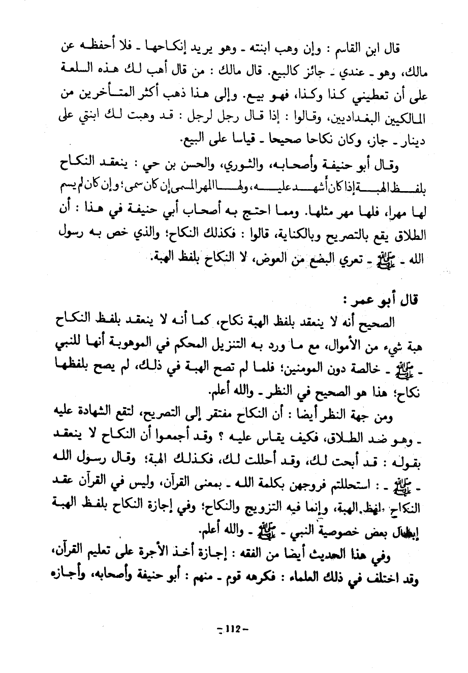 قَالَ ابْنُ الْقَاسِمِ وَإِنْ وَهَبَ ابْنَتَهُ وَهُوَ يُرِيدُ إِنْكَاحَهَا فَلَا أَحْفَظُهُ عَنْ مَالِكٍ وَهُوَ عِنْدِي جَائِزٌ كَالْبَيْعِ قَالَ مَالِكٌ مَنْ قَالَ أَهَبُ لَكَ هَذِهِ السِّلْعَةَ عَلَى أَنْ تُعْطِيَنِي كَذَا وَكَذَا فَهُوَ بَيْعٌ وَإِلَى هَذَا ذَهَبَ أَكْثَرُ الْمُتَأَخِّرِينَ مِنَ الْمَالِكِيِّينَ الْبَغْدَادِيِّينَ وَقَالُوا إِذَا قَالَ رَجُلٌ لِرَجُلٍ قَدْ وَهَبْتُ لَكَ ابْنَتِي عَلَى دِينَارٍ جَازَ وَكَانَ نِكَاحًا صَحِيحًا قِيَاسًا عَلَى الْبَيْعِ وَقَالَ أَبُو حَنِيفَةَ وَأَصْحَابُهُ وَالثَّوْرِيُّ وَالْحَسَنُ بْنُ حَيٍّ يَنْعَقِدُ النِّكَاحُ بِلَفْظِ الْهِبَةِ إِذَا كَانَ اشْهَدَ عَلَيْهِ وَلَهَا الْمَهْرُ الْمُسَمَّى إِنْ كَانَ سَمَّى وَإِنْ كَانَ لَمْ يُسَمِّ لَهَا مَهْرًا فَلَهَا مَهْرُ مِثْلِهَا وَمِمَّا احْتَجَّ بِهِ أَصْحَابُ أَبِي حَنِيفَةَ فِي هَذَا أَنَّ الطَّلَاقَ يَقَعُ بِالتَّصْرِيحِ وَبِالْكِنَايَةِ قَالُوا فَكَذَلِكَ النِّكَاحُ وَالَّذِي خُصَّ بِهِ رَسُولُ اللَّهِ صَلَّى اللَّهُ عَلَيْهِ وَسَلَّمَ تَعَرِّي الْبِضْعِ مِنَ الْعِوَضِ لَا النِّكَاحُ بِلَفْظِ الْهِبَةِ قَالَ أَبُو عُمَرَ الصَّحِيحُ أَنَّهُ لَا يَنْعَقِدُ بِلَفْظِ الْهِبَةِ نِكَاحٌ كَمَا أَنَّهُ لَا يَنْعَقِدُ بِلَفْظِ النِّكَاحِ هِبَةُ شَيْءٍ مِنَ الْأَمْوَالِ مَعَ مَا وَرَدَ بِهِ التَّنْزِيلُ الْمُحْكَمُ فِي الْمَوْهُوبَةِ أَنَّهَا لِلنَّبِيِّ صَلَّى اللَّهُ عَلَيْهِ وَسَلَّمَ خَالِصَةً دُونَ الْمُؤْمِنِينَ فَلَمَّا لَمْ تَصِحَّ الْهِبَةُ فِي ذَلِكَ لَمْ يَصِحَّ بِلَفْظِهَا نِكَاحٌ هَذَا هُوَ الصَّحِيحُ فِي النَّظَرِ وَاللَّهُ أَعْلَمُ وَمِنْ جِهَةِ النَّظَرِ أَيْضًا أَنَّ النِّكَاحَ مُفْتَقِرٌ إِلَى التَّصْرِيحِ لِتَقَعَ الشَّهَادَةُ عَلَيْهِ وَهُوَ ضِدُّ الطَّلَاقِ فَكَيْفَ يُقَاسُ عَلَيْهِ وَقَدْ أَجْمَعُوا أَنَّ النِّكَاحَ لَا يَنْعَقِدُ بِقَوْلِهِ قَدْ أَبَحْتُ لَكَ وَقَدْ أَحْلَلْتُ لَكَ فَكَذَلِكَ الْهِبَةُ وَقَالَ رَسُولُ اللَّهِ صَلَّى اللَّهُ عَلَيْهِ وَسَلَّمَ اسْتَحْلَلْتُمْ فُرُوجَهُنَّ بِكَلِمَةِ اللَّهِ بِمَعْنَى الْقُرْآنِ وَلَيْسَ فِي الْقُرْآنِ عَقْدُ النِّكَاحِ بِلَفْظِ الْهِبَةِ وَإِنَّمَا فِيهِ التَّزْوِيجُ وَالنِّكَاحُ وَفِي إِجَازَةِ النِّكَاحِ بِلَفْظِ الْهِبَةِ إِبْطَالُ بَعْضِ خُصُوصِيَّةِ النَّبِيِّ صَلَّى اللَّهُ عَلَيْهِ وَسَلَّمَ وَاللَّهُ أَعْلَمُ وَفِي هَذَا الْحَدِيثِ أَيْضًا مِنَ الْفِقْهِ إِجَازَةُ أَخْذِ الْأُجْرَةِ عَلَى تَعْلِيمِ الْقُرْآنِ وَقَدِ اخْتَلَفَ فِي ذَلِكَ الْعُلَمَاءُ فَكَرِهَهُ قَوْمٌ مِنْهُمْ أَبُو حَنِيفَةَ وَأَصْحَابُهُ وَأَجَازَهُ
