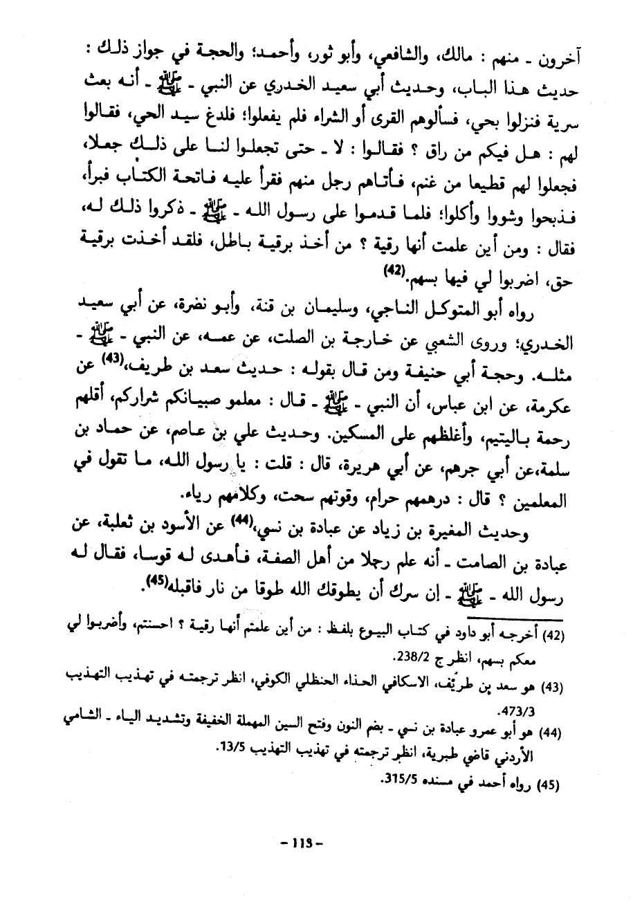 آخَرُونَ مِنْهُمْ مَالِكٌ وَالشَّافِعِيُّ وَأَبُو ثَوْرٍ وَأَحْمَدُ وَالْحُجَّةُ فِي جَوَازِ ذَلِكَ حَدِيثُ هَذَا الْبَابِ وَحَدِيثُ أَبِي سَعِيدٍ الْخُدْرِيِّ عَنِ النَّبِيِّ صَلَّى اللَّهُ عَلَيْهِ وَسَلَّمَ أَنَّهُ بَعَثَ سَرِيَّةً فَنَزَلُوا بِحَيٍّ فَسَأَلُوهُمُ الْقِرَى أَوِ الشِّرَاءَ فَلَمْ يَفْعَلُوا فَلُدِغَ سَيِّدُ الْحَيِّ فَقَالُوا لَهُمْ هَلْ فِيكُمْ مِنْ رَاقٍ فَقَالُوا لَا حَتَّى تَجْعَلُوا لَنَا عَلَى ذَلِكَ جُعْلًا فَجَعَلُوا لَهُمْ قَطِيعًا مِنْ غَنَمٍ فَأَتَاهُمْ رَجُلٌ مِنْهُمْ فَقَرَأَ عَلَيْهِ فَاتِحَةَ الْكِتَابِ فَبَرَأَ فَذَبَحُوا وَشَوَوْا وَأَكَلُوا فَلَمَّا قَدِمُوا عَلَى رَسُولِ اللَّهِ صَلَّى اللَّهُ عَلَيْهِ وسلم ذَكَرُوا ذَلِكَ لَهُ فَقَالَ وَمِنْ أَيْنَ عَلِمْتَ أَنَّهَا رُقْيَةٌ مَنْ أَخَذَ بِرُقْيَةِ بَاطِلٍ فَلَقَدْ أَخَذْتَ بِرُقْيَةِ حَقٍّ اضْرِبُوا لِي فِيهَا بِسَهْمٍ رَوَاهُ أَبُو الْمُتَوَكِّلِ النَّاجِيُّ وَسُلَيْمَانُ بْنُ قَنَّةَ وَأَبُو نَضْرَةَ عَنْ أَبِي سَعِيدٍ الْخُدْرِيِّ وَرَوَى الشَّعْبِيُّ عَنْ خَارِجَةَ بْنِ الصَّلْتِ عَنْ عَمِّهِ عَنِ النَّبِيِّ صَلَّى اللَّهُ عَلَيْهِ وسلم مثله وحجة أبي حنيفة من قَالَ بِقَوْلِهِ حَدِيثُ سَعْدِ بْنِ طَرِيفٍ (439 عَنْ عِكْرِمَةَ عَنِ ابْنِ عَبَّاسٍ أَنَّ النَّبِيَّ صَلَّى اللَّهُ عَلَيْهِ وَسَلَّمَ قَالَ مُعَلِّمُو صِبْيَانِكُمْ شِرَارُكُمْ أَقَلُّهُمْ رَحْمَةً بِالْيَتِيمِ وَأَغْلَظُهُمْ عَلَى الْمِسْكِينِ وَحَدِيثُ عَلِيِّ بْنِ عَاصِمٍ عَنْ حَمَّادِ بْنِ سَلَمَةَ عَنْ أَبِي جُرْهُمَ عَنْ أَبِي هُرَيْرَةَ قَالَ قُلْتُ يَا رَسُولَ اللَّهِ مَا تَقُولُ فِي الْمُعَلِّمِينَ قَالَ دِرْهَمُهُمْ حَرَامٌ وَقُوتُهُمْ سُحْتٌ وَكَلَامُهُمْ رِيَاءٌ وَحَدِيثُ الْمُغِيرَةِ بْنِ زِيَادٍ عَنْ عُبَادَةَ بْنِ نُسَيٍّ (44) عَنِ الْأَسْوَدِ بْنِ ثَعْلَبَةَ عَنْ عُبَادَةَ بْنِ الصَّامِتِ أَنَّهُ عَلِمَ رَجُلًا مِنْ أَهْلِ الصُّفَّةِ فَأَهْدَى لَهُ قَوْسًا فَقَالَ لَهُ رَسُولُ اللَّهِ صَلَّى اللَّهُ عَلَيْهِ وسلم إن سَرَّكَ أَنْ يُطَوِّقَكَ اللَّهُ طَوْقًا مِنْ نَارٍ فاقبله