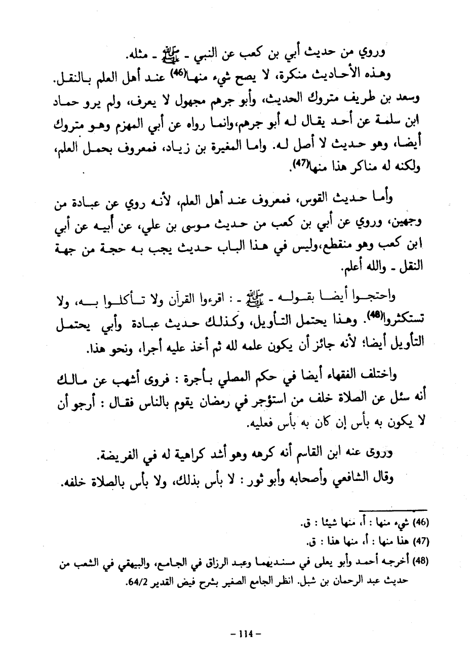 وَرُوِيَ مِنْ حَدِيثِ أُبَيِّ بْنِ كَعْبٍ عَنِ النَّبِيِّ صَلَّى اللَّهُ عليه وسلم مثله وهذ الْأَحَادِيثُ مُنْكَرَةٌ لَا يَصِحُّ شَيْءٌ مِنْهَا عِنْدَ أَهْلِ الْعِلْمِ بِالنَّقْلِ وَسَعْدُ بْنُ طَرِيفٍ مَتْرُوكُ الْحَدِيثِ وَأَبُو جُرْهُمَ مَجْهُولٌ لَا يُعْرَفُ وَلَمْ يرو حماد ابن سَلَمَةَ عَنْ أَحَدٍ يُقَالُ لَهُ أَبُو جُرْهُمَ وَإِنَّمَا رَوَاهُ عَنْ أَبِي الْمُهَزِّمِ وَهُوَ مَتْرُوكٌ أَيْضًا وَهُوَ حَدِيثٌ لَا أَصْلَ لَهُ وَأَمَّا الْمُغِيرَةُ بْنُ زِيَادٍ فَمَعْرُوفٌ بِحَمْلِ الْعِلْمِ وَلَكِنَّهُ لَهُ مَنَاكِرُ هَذَا مِنْهَا وَأَمَّا حَدِيثُ الْقَوْسِ فَمَعْرُوفٌ عِنْدَ أَهْلِ الْعِلْمِ لِأَنَّهُ رُوِيَ عَنْ عُبَادَةَ مِنْ وَجْهَيْنِ وَرُوِيَ عَنْ أُبَيِّ بْنِ كَعْبٍ مِنْ حَدِيثِ مُوسَى بْنِ عَلِيٍّ عَنْ ابيه عن أبي ابن كَعْبٍ وَهُوَ مُنْقَطِعٌ وَلَيْسَ فِي هَذَا الْبَابِ حَدِيثٌ يَجِبُ بِهِ حُجَّةٌ مِنْ جِهَةِ النَّقْلِ وَاللَّهُ أَعْلَمُ وَاحْتَجُّوا أَيْضًا بِقَوْلِهِ صَلَّى اللَّهُ عَلَيْهِ وَسَلَّمَ اقْرَءُوا الْقُرْآنَ وَلَا تَأْكُلُوا بِهِ وَلَا تَسْتَكْثِرُوا وَهَذَا يَحْتَمِلُ التَّأْوِيلَ وَكَذَلِكَ حَدِيثُ عُبَادَةَ وَأُبَيٍّ يَحْتَمِلُ التَّأْوِيلَ أَيْضًا لِأَنَّهُ جَائِزٌ أَنْ يَكُونَ عِلْمُهُ لِلَّهِ ثُمَّ أَخَذَ عَلَيْهِ أَجْرًا وَنَحْوَ هَذَا وَاخْتَلَفَ الْفُقَهَاءُ أَيْضًا فِي حُكْمِ الْمُصَلِّي بِأُجْرَةٍ فَرَوَى أَشْهَبُ عَنْ مَالِكٍ أَنَّهُ سُئِلَ عَنِ الصَّلَاةِ خَلْفَ مَنِ اسْتُؤْجِرَ فِي رَمَضَانَ يَقُومُ بِالنَّاسِ فَقَالَ أَرْجُو أَنْ لَا يَكُونَ بِهِ بَأْسٌ أَنْ كَانَ بِهِ بَأْسٌ فَعَلَيْهِ وَرَوَى عَنْهُ ابْنُ الْقَاسِمِ أَنَّهُ كَرِهَهُ وَهُوَ أَشَدُّ كَرَاهِيَةً لَهُ فِي الْفَرِيضَةِ وَقَالَ الشَّافِعِيُّ وَأَصْحَابُهُ وَأَبُو ثَوْرٍ لَا بَأْسَ بِذَلِكَ وَلَا بَأْسَ بِالصَّلَاةِ خَلْفَهُ