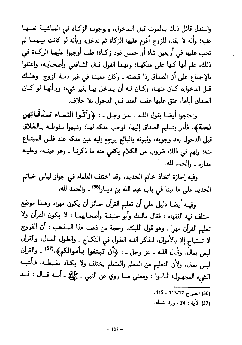 وَاسْتَدَلَّ قَائِلُ ذَلِكَ بِالْمَوْتِ قَبْلَ الدُّخُولِ وَبِوُجُوبِ الزَّكَاةِ فِي الْمَاشِيَةِ نَفْسِهَا عَلَيْهِ وَأَنَّهُ لَا يُقَالُ لِلزَّوْجِ أَغْرِمْ عَلَيْهَا الزَّكَاةَ ثُمَّ تَدْخُلُ وَبِأَنَّهُ لَوْ كَانَتْ بَيْنَهُمَا لَمْ تَجِبْ عَلَيْهَا فِي أَرْبَعِينَ شَاةً أَوْ خَمْسِ ذَوْدٍ زَكَاةٌ فَلَمَّا أَوْجَبُوا عَلَيْهَا الزَّكَاةَ فِي ذَلِكَ عُلِمَ أَنَّهَا كُلَّهَا عَلَى مِلْكِهَا وَبِهَذَا الْقَوْلِ قَالَ الشَّافِعِيُّ وَأَصْحَابُهُ وَاعْتَلُّوا بِالْإِجْمَاعِ عَلَى أَنَّ الصَّدَاقَ إِذَا قَبَضَتْهُ وَكَانَ مُعَيَّنًا فِي غَيْرِ ذِمَّةِ الزَّوْجِ وَهَلَكَ قَبْلَ الدُّخُولِ كَانَ مِنْهَا وَكَانَ لَهُ أَنْ يَدْخُلَ بِهَا بِغَيْرِ شَيْءٍ وَبِأَنَّهَا لَوْ كَانَ الصَّدَاقُ أَبَاهَا عَتَقَ عَلَيْهَا عَقِبَ الْعَقْدِ قَبْلَ الدُّخُولِ بِلَا خِلَافٍ وَاحْتَجُّوا أَيْضًا بِقَوْلِ اللَّهِ عَزَّ وَجَلَّ وَآتُوا النِّسَاءَ صَدُقَاتِهِنَّ نِحْلَةً فَأَمَرَ بِتَسْلِيمِ الصَّدَاقِ إِلَيْهَا فَوَجَبَ مِلْكُهُ لَهَا وَشَبَّهُوا سُقُوطَهُ بِالطَّلَاقِ قَبْلَ الدُّخُولِ بَعْدَ وُجُوبِهِ وَثُبُوتُهُ بِالْبَائِعِ يُرْجِعُ إِلَيْهِ عَيْنَ مِلْكِهِ عِنْدَ فَلْسِ الْمُبْتَاعِ مِنْهُ وَلَهُمْ فِي ذَلِكَ ضُرُوبٌ مِنَ الْكَلَامِ يَكْفِي مِنْهُ مَا ذَكَرْنَا وَهُوَ عَيْنُهُ وَعَلَيْهِ مَدَارُهُ وَالْحَمْدُ لِلَّهِ وَفِيهِ إِجَازَةُ اتِّخَاذِ خَاتَمِ الْحَدِيدِ وَقَدِ اخْتَلَفَ الْعُلَمَاءُ فِي جَوَازِ لِبَاسِ خَاتَمِ الْحَدِيدِ عَلَى مَا بَيَّنَّا فِي بَابِ عَبْدِ اللَّهِ بْنِ دِينَارٍ وَالْحَمْدُ لِلَّهِ وَفِيهِ أَيْضًا دَلِيلٌ عَلَى أَنَّ تَعْلِيمَ الْقُرْآنِ جَائِزٌ أَنْ يَكُونَ مَهْرًا وَهَذَا مَوْضِعٌ اخْتَلَفَ فِيهِ الْفُقَهَاءُ فَقَالَ مَالِكٌ وَأَبُو حَنِيفَةَ وَأَصْحَابُهُمَا لَا يَكُونُ الْقُرْآنُ وَلَا تَعْلِيمُ الْقُرْآنِ مَهْرًا وَهُوَ قَوْلُ اللَّيْثِ وَحُجَّةُ مَنْ ذَهَبَ هَذَا الْمَذْهَبَ أَنَّ الْفُرُوجَ لَا تُسْتَبَاحُ إِلَّا بِالْأَمْوَالِ لِذِكْرِ اللَّهِ الطَّوْلِ فِي النِّكَاحِ وَالطَّوْلُ الْمَالُ وَالْقُرْآنُ لَيْسَ بِمَالٍ وَقَالَ اللَّهُ عَزَّ وَجَلَّ أَنْ تَبْتَغُوا بِأَمْوَالِكُمْ وَالْقُرْآنُ لَيْسَ بِمَالٍ وَلِأَنَّ التَّعْلِيمَ مِنَ الْمُعَلِّمِ وَالْمُتَعَلِّمُ يَخْتَلِفُ وَلَا يَكَادُ يَضْبُطُهُ فَأَشْبَهَ الشَّيْءَ الْمَجْهُولَ قَالُوا وَمَعْنَى مَا رُوِيَ عَنِ النَّبِيِّ صَلَّى اللَّهُ عَلَيْهِ وَسَلَّمَ أَنَّهُ قَالَ قَدْ