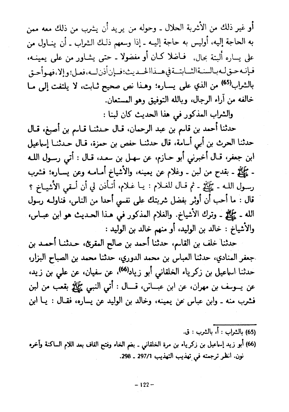 أَوْ غَيْرَ ذَلِكَ مِنَ الْأَشْرِبَةِ الْحَلَالِ وَحَوْلَهُ مَنْ يُرِيدُ أَنْ يَشْرَبَ مِنْ ذَلِكَ مَعَهُ ممن به الحاجة إليه أوليس بِهِ حَاجَةٌ إِلَيْهِ إِذَا وَسِعَهُمْ ذَلِكَ الشَّرَابُ أَنْ يُنَاوِلَ مَنْ عَلَى يَسَارِهِ الْبَتَّةَ بِحَالٍ فَاضِلًا كَانَ أَوْ مَفْضُولًا حَتَّى يُشَاوِرَ مَنْ عَلَى يَمِينِهِ فَإِنَّهُ حَقٌّ لَهُ بِالسُّنَّةِ الثَّابِتَةِ فِي هَذَا الْحَدِيثِ فَإِنْ أَذِنَ لَهُ فَعَلَ وَإِلَّا فَهُوَ أَحَقُّ بِالشَّرَابِ مِنَ الَّذِي عَلَى يَسَارِهِ وَهَذَا نَصٌّ صَحِيحٌ ثَابِتٌ لَا يُلْتَفَتُ إِلَى مَا خَالَفَهُ مِنْ آرَاءِ الرِّجَالِ وَبِاللَّهِ التَّوْفِيقُ وَهُوَ الْمُسْتَعَانُ وَالشَّرَابُ الْمَذْكُورُ فِي هَذَا الْحَدِيثِ كَانَ لَبَنًا حَدَّثَنَا أَحْمَدُ بْنُ قَاسِمِ بن عبد الرحمان قَالَ حَدَّثَنَا قَاسِمُ بْنُ أَصْبَغَ قَالَ حَدَّثَنَا الحرث بْنُ أَبِي أُسَامَةَ قَالَ حَدَّثَنَا حَفْصُ بْنُ حمزة قال حدثنا إسماعيل ابن جَعْفَرٍ قَالَ أَخْبَرَنِي أَبُو حَازِمٍ عَنْ سَهْلِ بْنِ سَعْدٍ قَالَ أَتَى رَسُولَ اللَّهِ صَلَّى اللَّهُ عَلَيْهِ وَسَلَّمَ بِقَدَحٍ مِنْ لَبَنٍ وَغُلَامٌ عَنْ يَمِينِهِ وَالْأَشْيَاخُ أَمَامَهُ وَعَنْ يَسَارِهِ فَشَرِبَ رسول الله صلى الله عليه وسلم ثم قَالَ لِلْغُلَامِ يَا غُلَامُ أَتَأْذَنُ لِي أَنْ أَسْقِيَ الْأَشْيَاخَ قَالَ مَا أُحِبُّ أَنْ أُوثِرَ بِفَضْلِ شَرْبَتِكَ عَلَى نَفْسِي أَحَدًا مِنَ النَّاسِ فَنَاوَلَهُ رَسُولُ اللَّهِ صَلَّى اللَّهُ عَلَيْهِ وَسَلَّمَ وَتَرَكَ الْأَشْيَاخَ وَالْغُلَامُ الْمَذْكُورُ فِي هَذَا الْحَدِيثِ هُوَ ابْنُ عَبَّاسٍ وَالْأَشْيَاخُ خَالِدُ بْنُ الْوَلِيدِ أَوْ مِنْهُمْ خَالِدُ بْنُ الْوَلِيدِ حَدَّثَنَا خَلَفُ بْنُ الْقَاسِمِ حَدَّثَنَا أَحْمَدُ بْنُ صَالِحٍ الْمُقْرِئُ حَدَّثَنَا أَحْمَدُ بْنُ جَعْفَرٍ الْمُنَادِي حَدَّثَنَا الْعَبَّاسُ بْنُ مُحَمَّدٍ الدُّورِيُّ حَدَّثَنَا مُحَمَّدُ بْنُ الصَّبَّاحِ الْبَزَّارُ حَدَّثَنَا إِسْمَاعِيلُ بْنُ زَكَرِيَّاءَ الْخُلْقَانِيُّ أَبُو زِيَادٍ عَنْ سُفْيَانَ عَنْ عَلِيُّ بْنُ زَيْدٍ عَنْ يُوسُفَ بْنِ مِهْرَانَ عَنِ ابْنِ عَبَّاسٍ قَالَ أَتَى النَّبِيَّ صَلَّى اللَّهُ عَلَيْهِ وَسَلَّمَ بِقَعْبٍ مِنْ لَبَنٍ فَشَرِبَ مِنْهُ وَابْنُ عَبَّاسٍ عَنْ يَمِينِهِ وَخَالِدُ بْنُ الْوَلِيدِ عَنْ يَسَارِهِ فَقَالَ يَا ابْنَ