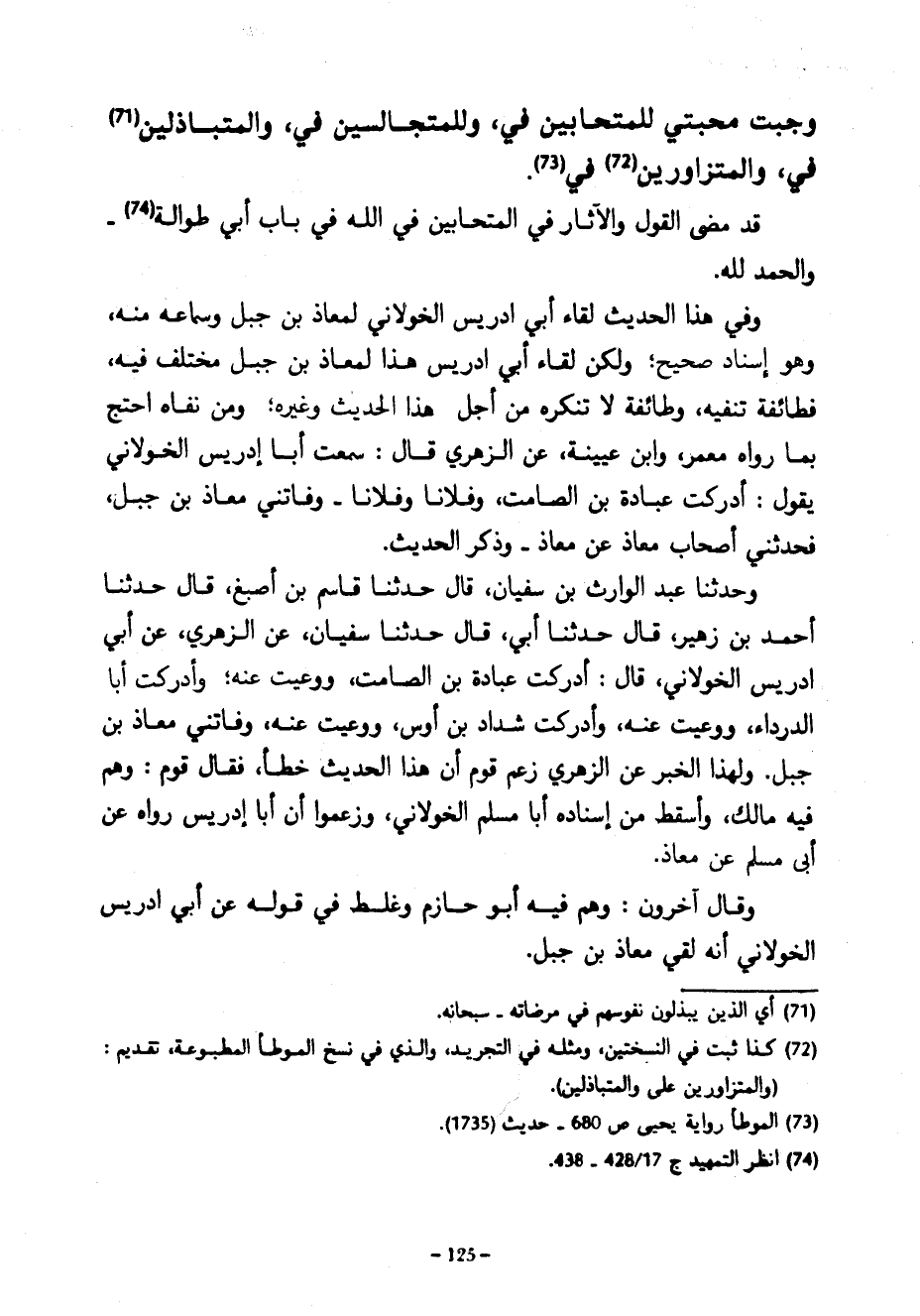 وَجَبَتْ مَحَبَّتِي لِلْمُتَحَابِّينَ فِيَّ وَلِلْمُتَجَالِسِينَ فِيَّ وَالْمُتَبَاذِلِينَ فِيَّ وَالْمُتَزَاوِرِينَ فِيَّ قَدْ مَضَى الْقَوْلُ وَالْآثَارُ فِي الْمُتَحَابِّينَ فِي اللَّهِ فِي بَابِ أَبِي طُوَالَةَ وَالْحَمْدُ لِلَّهِ وَفِي هَذَا الْحَدِيثِ لِقَاءُ أَبِي إِدْرِيسَ الْخَوْلَانِيِّ لِمُعَاذِ بْنِ جَبَلٍ وَسَمَاعُهُ مِنْهُ وَهُوَ إِسْنَادٌ صَحِيحٌ وَلَكِنَّ لِقَاءَ أَبِي إِدْرِيسَ هَذَا لِمُعَاذِ بْنِ جَبَلٍ مُخْتَلَفٌ فِيهِ فَطَائِفَةٌ تَنْفِيهِ وَطَائِفَةٌ لَا تُنْكِرُهُ مِنْ أَجْلِ هَذَا الْحَدِيثِ وَغَيْرِهِ وَمَنْ نَفَاهُ احْتَجَّ بِمَا رَوَاهُ مَعْمَرٌ وَابْنُ عُيَيْنَةَ عَنِ الزُّهْرِيِّ قَالَ سَمِعْتُ أَبَا إِدْرِيسَ الْخَوْلَانِيَّ يَقُولُ أَدْرَكْتُ عُبَادَةَ بْنَ الصَّامِتِ وَفُلَانًا وَفُلَانًا وَفَاتَنِي مُعَاذُ بْنُ جَبَلٍ فَحَدَّثَنِي أَصْحَابُ مُعَاذٍ عَنْ مُعَاذٍ وَذَكَرَ الْحَدِيثَ وَحَدَّثَنَا عَبْدُ الْوَارِثِ بْنُ سُفْيَانَ قَالَ حَدَّثَنَا قَاسِمُ بْنُ أَصْبَغَ قَالَ حَدَّثَنَا أَحْمَدُ بْنُ زُهَيْرٍ قَالَ حَدَّثَنَا أَبِي قَالَ حَدَّثَنَا سُفْيَانُ عَنِ الزُّهْرِيِّ عَنْ أَبِي إِدْرِيسَ الْخَوْلَانِيِّ قَالَ أَدْرَكْتُ عُبَادَةَ بْنَ الصَّامِتِ وَوَعَيْتُ عَنْهُ وَأَدْرَكْتُ أَبَا الدَّرْدَاءِ وَوَعَيْتُ عَنْهُ وَأَدْرَكْتُ شَدَّادَ بْنَ أَوْسٍ وَوَعَيْتُ عَنْهُ وَفَاتَنِي مُعَاذُ بْنِ جَبَلٍ وَلِهَذَا الْخَبَرِ عَنِ الزُّهْرِيِّ زَعَمَ قَوْمٌ أَنَّ هَذَا الْحَدِيثَ خَطَأٌ فَقَالَ قَوْمٌ وَهِمَ فِيهِ مَالِكٌ وَأَسْقَطَ مِنْ إِسْنَادِهِ أَبَا مُسْلِمٍ الْخَوْلَانِيَّ وَزَعَمُوا أَنَّ أَبَا إِدْرِيسَ رَوَاهُ عَنْ أَبِي مُسْلِمٍ عَنْ مُعَاذٍ وَقَالَ آخَرُونَ وَهِمَ فِيهِ أَبُو حَازِمٍ وَغَلَطَ فِي قَوْلِهِ عَنْ أَبِي إِدْرِيسَ الْخَوْلَانِيِّ أَنَّهُ لَقِيَ مُعَاذَ بْنَ جبل