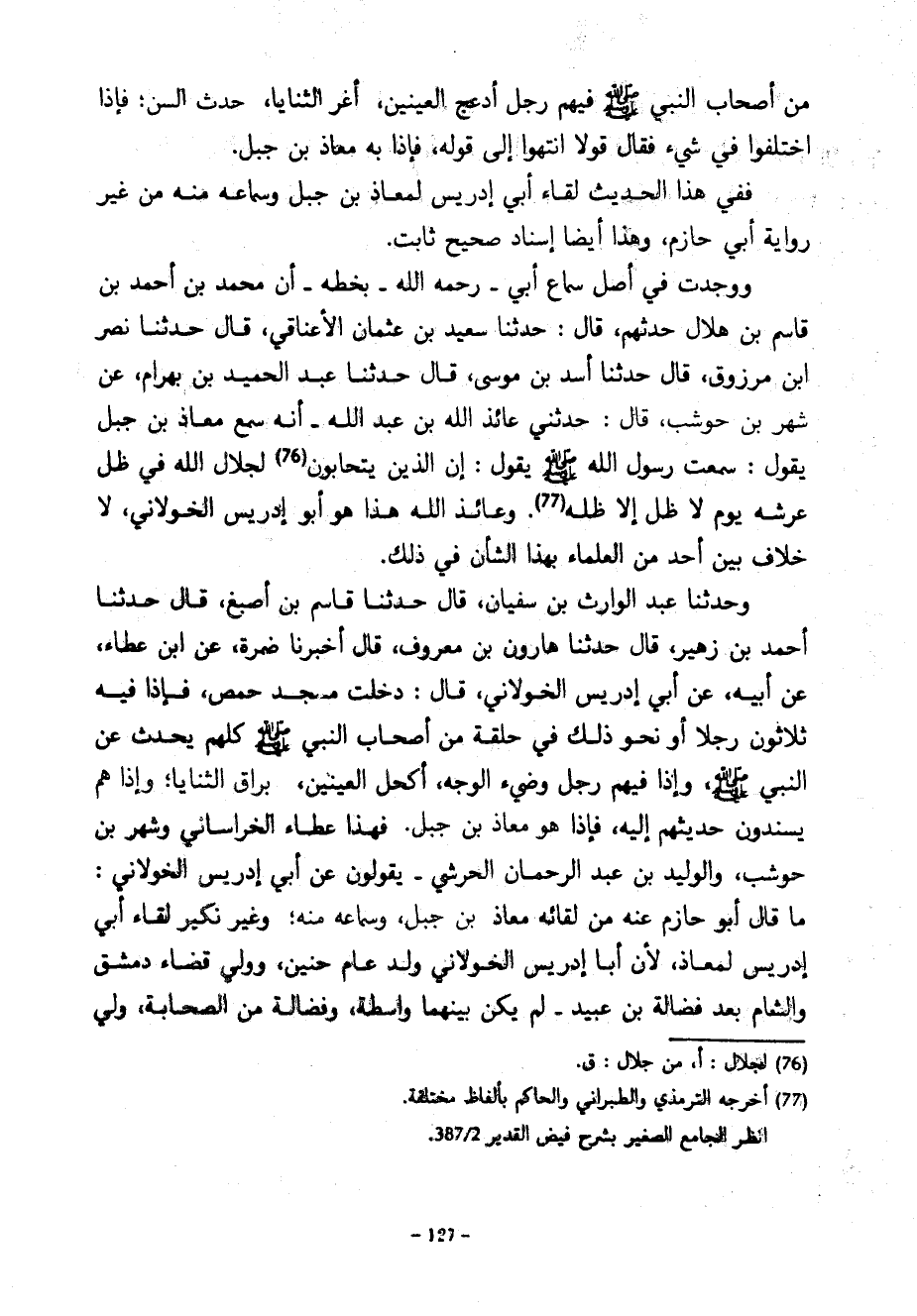 مِنْ أَصْحَابِ النَّبِيِّ صَلَّى اللَّهُ عَلَيْهِ وَسَلَّمَ فِيهِمْ رَجُلٌ أَدْعَجُ الْعَيْنَيْنِ أَغَرُّ الثَّنَايَا حَدَثُ السِّنِّ فَإِذَا اخْتَلَفُوا فِي شَيْءٍ فَقَالَ قَوْلًا انْتَهَوْا إِلَى قَوْلِهِ فَإِذَا بِهِ مُعَاذُ بْنُ جَبَلٍ فَفِي هَذَا الْحَدِيثِ لِقَاءُ أَبِي إِدْرِيسَ لمعاذ بن جبل وسماعه منه من غير رِوَايَةِ أَبِي حَازِمٍ وَهَذَا أَيْضًا إِسْنَادٌ صَحِيحٌ ثَابِتٌ وَوَجَدْتُ فِي أَصْلِ سَمَاعِ أَبِي رَحِمَهُ اللَّهُ بِخَطِّهِ أَنَّ مُحَمَّدَ بْنَ أَحْمَدَ بْنِ قَاسِمِ بْنِ هِلَالٍ حَدَّثَهُمْ قَالَ حَدَّثَنَا سَعِيدُ بْنُ عُثْمَانَ الْأَعْنَاقِيُّ قال حدثنا نصر ابن مَرْزُوقٍ قَالَ حَدَّثَنَا أَسَدُ بْنُ مُوسَى قَالَ حَدَّثَنَا عَبْدُ الْحَمِيدِ بْنُ بَهْرَامَ عَنْ شَهْرِ بن حوشب قال حدثني عائد اللَّهِ بْنُ عَبْدِ اللَّهِ أَنَّهُ سَمِعَ مُعَاذَ بْنَ جَبَلٍ يَقُولُ سَمِعْتُ رَسُولَ اللَّهِ صَلَّى اللَّهُ عَلَيْهِ وَسَلَّمَ يَقُولُ إِنَّ الَّذِينَ يَتَحَابُّونَ لِجَلَالِ اللَّهُ فِي ظِلِّ عَرْشِهِ يَوْمَ لَا ظِلَّ إِلَّا ظِلُّهُ وَعَائِذُ اللَّهِ هَذَا هُوَ أَبُو إِدْرِيسَ الْخَوْلَانِيُّ لَا خِلَافَ بَيْنَ أَحَدٍ مِنَ الْعُلَمَاءِ بِهَذَا الشَّأْنِ فِي ذَلِكَ وَحَدَّثَنَا عَبْدُ الْوَارِثِ بْنُ سُفْيَانَ قَالَ حَدَّثَنَا قَاسِمُ بْنُ أَصْبَغَ قَالَ حَدَّثَنَا أَحْمَدُ بْنُ زُهَيْرٍ قَالَ حَدَّثَنَا هَارُونُ بْنُ مَعْرُوفٍ قَالَ أَخْبَرَنَا ضَمْرَةُ عَنِ ابْنِ عَطَاءٍ عَنْ أَبِيهِ عَنْ أَبِي إِدْرِيسٍ الْخَوْلَانِيِّ قَالَ دَخَلْتُ مَسْجِدَ حِمْصَ فَإِذَا فِيهِ ثَلَاثُونَ رَجُلًا أَوْ نَحْوَ ذَلِكَ فِي حَلْقَةٍ مِنْ أَصْحَابِ النَّبِيِّ صَلَّى اللَّهُ عَلَيْهِ وَسَلَّمَ كُلُّهُمْ يُحَدِّثُ عَنِ النَّبِيِّ صَلَّى اللَّهُ عَلَيْهِ وَسَلَّمَ وَإِذَا فِيهِمْ رَجُلٌ وَضِيءُ الْوَجْهِ أَكْحَلُ الْعَيْنَيْنِ بَرَّاقُ الثَّنَايَا وَإِذَا هُمْ يُسْنِدُونَ حَدِيثَهُمْ إِلَيْهِ فَإِذَا هُوَ مُعَاذُ بْنُ جَبَلٍ فَهَذَا عَطَاءٌ الْخُرَاسَانِيُّ وَشَهْرُ بْنُ حَوْشَبٍ والوليد بن عبد الرحمان الْحَرَشِيُّ يَقُولُونَ عَنْ أَبِي إِدْرِيسَ الْخَوْلَانِيِّ مَا قَالَ أَبُو حَازِمٍ عَنْهُ مِنْ لِقَائِهِ مُعَاذَ بْنَ جَبَلٍ وَسَمَاعِهِ مِنْهُ وَغَيْرُ نَكِيرٍ لِقَاءُ أَبِي إِدْرِيسَ لِمُعَاذٍ لِأَنَّ أَبَا إِدْرِيسَ الْخَوْلَانِيَّ وُلِدَ عَامَ حُنَيْنٍ وَوَلِيَ قَضَاءَ دِمَشْقَ وَالشَّامِ بَعْدَ فَضَالَةَ بْنَ عُبَيْدٍ لَمْ يَكُنْ بَيْنَهُمَا وَاسِطَةٌ وَفَضَالَةُ مِنَ الصَّحَابَةِ وَلِيَ