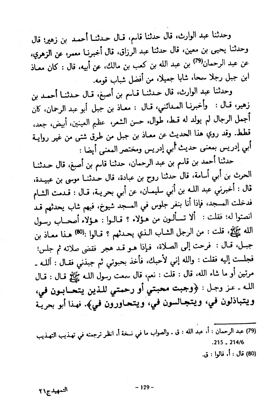 وَحَدَّثَنَا عَبْدُ الْوَارِثِ قَالَ حَدَّثَنَا قَاسِمٌ قَالَ حَدَّثَنَا أَحْمَدُ بْنُ زُهَيْرٍ قَالَ وَحَدَّثَنَا يَحْيَى بْنُ مَعِينٍ قَالَ حَدَّثَنَا عَبْدُ الرَّزَّاقِ قَالَ أَخْبَرَنَا مَعْمَرٌ عَنِ الزُّهْرِيِّ عن عبد الرحمان بْنِ عَبْدِ اللَّهِ بْنِ كَعْبِ بْنِ مَالِكٍ عن أبيه قال كان معاذ ابن جَبَلٍ رَجُلًا سَمْحًا شَابًّا جَمِيلًا مِنْ أَفْضَلِ شَبَابِ قَوْمِهِ وَحَدَّثَنَا عَبْدُ الْوَارِثِ قَالَ حَدَّثَنَا قَاسِمُ بْنُ أَصْبَغَ قَالَ حَدَّثَنَا أَحْمَدُ بْنُ زُهَيْرٍ قَالَ وَأَخْبَرَنَا الْمَدَائِنِيُّ قَالَ مُعَاذُ بْنُ جبل أبو عبد الرحمان كَانَ أَجْمَلَ الرِّجَالِ لَمْ يُولَدْ لَهُ قَطُّ طُوَالٌ حَسَنُ الشَّعْرِ عَظِيمُ الْعَيْنَيْنِ أَبْيَضُ جَعْدٌ قَطَطٌ وَقَدْ رُوِيَ هَذَا الْحَدِيثُ عَنْ مُعَاذِ بْنِ جَبَلٍ مِنْ طُرُقٍ شَتَّى مِنْ غَيْرِ رِوَايَةِ أَبِي إِدْرِيسَ بِمَعْنَى حَدِيثِ أَبِي إِدْرِيسَ وَمُخْتَصَرَ الْمَعْنَى أَيْضًا حَدَّثَنَا أَحْمَدُ بْنُ قَاسِمِ بن عبد الرحمان حَدَّثَنَا قَاسِمُ بْنُ أَصْبَغَ قَالَ حَدَّثَنَا الْحَرْثُ بْنُ أَبِي أُسَامَةَ قَالَ حَدَّثَنَا رَوْحُ بْنُ عُبَادَةَ قَالَ حَدَّثَنَا مُوسَىُ بْنُ عُبَيْدَةَ قَالَ أَخْبَرَنِي عَبْدُ اللَّهِ بْنُ أَبِي سُلَيْمَانَ عَنْ أبي بحرية قال قدمت الشام فدخلت الْمَسْجِدَ فَإِذَا أَنَا بِنَفَرٍ جُلُوسٍ فِي الْمَسْجِدِ شُيُوخٍ فِيهِمْ شَابٌّ يُحَدِّثُهُمْ قَدْ أَنْصَتُوا لَهُ فَقُلْتُ أَلَا تَسْأَلُونَ مَنْ هَؤُلَاءِ قَالُوا هَؤُلَاءِ أصحاب رسول الله صلى الله عليه وسلم قُلْتُ مَنِ الرَّجُلُ الشَّابُّ الَّذِي يُحَدِّثُهُمْ قَالُوا هَذَا مُعَاذُ بْنُ جَبَلٍ قَالَ فَرُحْتُ إِلَى الصَّلَاةِ فَإِذَا هُوَ قَدْ هَجَرَ فَقَضَى صَلَاتَهُ ثُمَّ جَلَسَ فَجَلَسْتُ إِلَيْهِ فَقُلْتُ وَاللَّهِ إِنِّي لَأُحِبُّكَ فَأَخَذَ بِحُبْوَتِي ثُمَّ جَبَذَنِي فَقَالَ آللَّهُ مَرَّتَيْنِ أَوْ مَا شَاءَ اللَّهُ قَالَ قُلْتُ نَعَمْ قَالَ سَمِعْتُ رَسُولَ اللَّهِ صَلَّى اللَّهُ عَلَيْهِ وَسَلَّمَ قَالَ قَالَ اللَّهُ عَزَّ وَجَلَّ وَجَبَتْ مَحَبَّتِي أَوْ رَحْمَتِي لِلَّذِينَ يَتَحَابُّونَ فِيَّ وَيَتَبَاذَلُونَ فِيَّ وَيَتَجَالَسُونَ فِيَّ وَيَتَحَاوَرُونَ فِيَّ فَهَذَا ابو بحرية