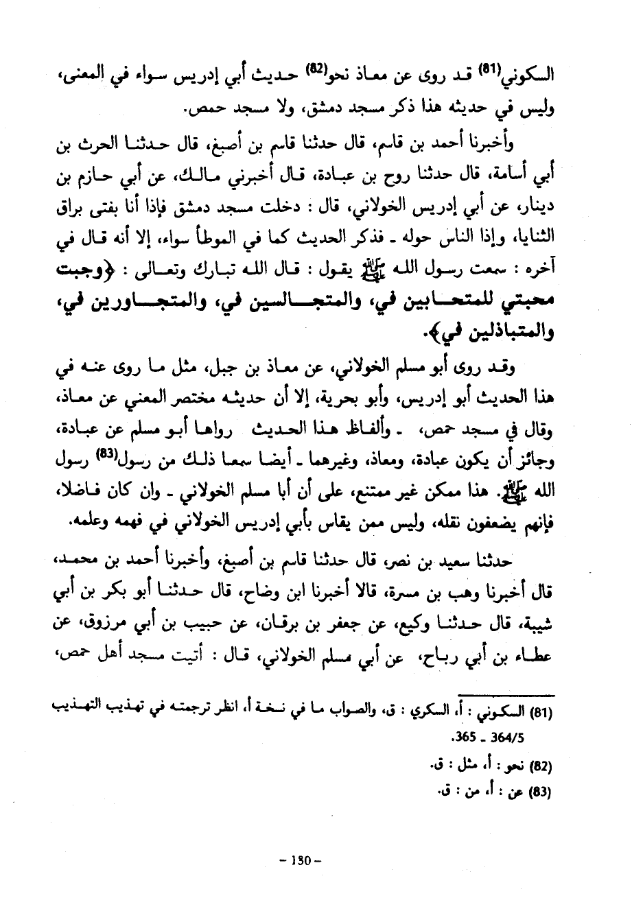 السَّكُونِيُّ قَدْ رَوَى عَنْ مُعَاذٍ نَحْوَ حَدِيثِ أَبِي إِدْرِيسَ سَوَاءٌ فِي الْمَعْنَى وَلَيْسَ فِي حَدِيثِهِ هَذَا ذِكْرُ مَسْجِدِ دِمَشْقَ وَلَا مَسْجِدِ حِمْصَ وَأَخْبَرَنَا أَحْمَدُ بْنُ قَاسِمٍ قَالَ حَدَّثَنَا قَاسِمُ بْنُ أَصْبَغَ قَالَ حَدَّثَنَا الْحَرْثُ بْنُ أَبِي أُسَامَةَ قَالَ حَدَّثَنَا رَوْحُ بْنُ عُبَادَةَ قَالَ أَخْبَرَنِي مَالِكٌ عَنْ أَبِي حَازِمِ بْنِ دِينَارٍ عَنْ أَبِي إِدْرِيسَ الْخَوْلَانِيِّ قَالَ دَخَلْتُ مَسْجِدَ دِمَشْقَ فَإِذَا أَنَا بِفَتًى بَرَّاقِ الثَّنَايَا وَإِذَا النَّاسُ حَوْلَهُ فَذَكَرَ الْحَدِيثَ كَمَا فِي الْمُوَطَّأِ سَوَاءٌ إِلَّا أَنَّهُ قَالَ فِي آخِرِهِ سَمِعْتُ رَسُولَ اللَّهِ صَلَّى اللَّهُ عَلَيْهِ وَسَلَّمَ يَقُولُ قَالَ اللَّهُ تَبَارَكَ وَتَعَالَى وَجَبَتْ مَحَبَّتِي لِلْمُتَحَابِّينَ فِيَّ وَالْمُتَجَالِسِينَ فِيَّ وَالْمُتَجَاوِرِينَ فِيَّ وَالْمُتَبَاذِلِينَ فِيَّ وَقَدْ رَوَى أَبُو مُسْلِمٍ الْخَوْلَانِيُّ عَنْ مُعَاذِ بْنِ جَبَلٍ مِثْلَ مَا رَوَى عَنْهُ فِي هَذَا الْحَدِيثِ أَبُو إِدْرِيسَ وَأَبُو بَحْرِيَّةَ إِلَّا أَنَّ حَدِيثَهُ مُخْتَصَرُ الْمَعْنَى عَنْ مُعَاذٍ وَقَالَ فِي مَسْجِدِ حِمْصَ وَأَلْفَاظُ هَذَا الْحَدِيثِ رَوَاهَا أَبُو مُسْلِمٍ عَنْ عُبَادَةَ وَجَائِزٌ أَنْ يَكُونَ عُبَادَةُ وَمُعَاذٌ وَغَيْرُهُمَا أَيْضًا سَمِعَا ذلك من رَسُولَ رَسُولُ اللَّهِ صَلَّى اللَّهُ عَلَيْهِ وَسَلَّمَ هَذَا مُمْكِنٌ غَيْرُ مُمْتَنِعٍ عَلَى أَنَّ أَبَا مُسْلِمٍ الْخَوْلَانِيَّ وَإِنْ كَانَ فَاضِلًا فَإِنَّهُمْ يُضَعِّفُونَ نَقْلَهُ وَلَيْسَ مِمَّنْ يُقَاسُ بِأَبِي إِدْرِيسَ الْخَوْلَانِيِّ فِي فَهْمِهِ وَعِلْمِهِ حَدَّثَنَا سَعِيدُ بْنُ نَصْرٍ قَالَ حَدَّثَنَا قَاسِمُ بْنُ أَصْبَغَ وَأَخْبَرَنَا أَحْمَدُ بْنُ مُحَمَّدٍ قَالَ أَخْبَرَنَا وَهْبُ بْنُ مَسَرَّةَ قَالَا أَخْبَرَنَا ابْنُ وَضَّاحٍ قَالَ حَدَّثَنَا أَبُو بَكْرِ بْنُ أَبِي شَيْبَةَ قَالَ حَدَّثَنَا وَكِيعٌ عَنْ جَعْفَرِ بْنِ بُرْقَانَ عَنْ حَبِيبِ بْنِ أَبِي مَرْزُوقٍ عَنْ عَطَاءِ بْنِ أَبِي رَبَاحٍ عَنْ أَبِي مُسْلِمٍ الْخَوْلَانِيِّ قَالَ أَتَيْتُ مَسْجِدَ أَهْلِ حمص