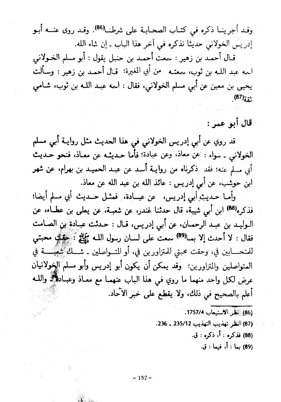 وَقَدْ أَجْرَيْنَا ذِكْرَهُ فِي كِتَابِ الصَّحَابَةِ عَلَى شَرْطِنَا وَقَدْ رَوَى عَنْهُ أَبُو إِدْرِيسَ الْخَوْلَانِيُّ حَدِيثًا نَذْكُرُهُ فِي آخِرِ هَذَا الْبَابِ إِنْ شَاءَ اللَّهُ قَالَ أَحْمَدُ بْنُ زُهَيْرٍ سَمِعْتُ أَحْمَدَ بْنَ حَنْبَلٍ يَقُولُ أَبُو مُسْلِمٍ الْخَوْلَانِيُّ اسْمُهُ عَبْدُ اللَّهِ بْنُ ثَوْبٍ سَمِعْتُهُ مِنْ أَبِي الْمُغِيرَةِ قَالَ أَحْمَدُ بْنُ زُهَيْرٍ وَسَأَلْتُ يَحْيَى بْنَ مَعِينٍ عَنْ أَبِي مُسْلِمٍ الْخَوْلَانِيِّ فَقَالَ اسْمُهُ عَبْدُ اللَّهِ بْنُ ثَوْبٍ شَامِيٌّ ثِقَةٌ قَالَ أَبُو عُمَرَ قَدْ رُوِيَ عَنْ أَبِي إِدْرِيسَ الْخَوْلَانِيِّ فِي هَذَا الْحَدِيثِ مِثْلَ رِوَايَةِ أَبِي مُسْلِمٍ الْخَوْلَانِيِّ سَوَاءٌ عَنْ مُعَاذٍ وَعَنْ عُبَادَةَ فَأَمَّا حَدِيثُهُ عَنْ مُعَاذٍ فَنَحْوَ حَدِيثِ أَبِي مُسْلِمٍ عَنْهُ فَقَدْ ذَكَرْنَاهُ مِنْ رِوَايَةِ أَسَدٍ عَنْ عَبْدِ الْحَمِيدِ بْنِ بَهْرَامَ عن شهر ابن حَوْشَبٍ عَنْ أَبِي إِدْرِيسَ عَائِذِ اللَّهِ بْنِ عَبْدِ اللَّهِ عَنْ مُعَاذٍ وَأَمَّا حَدِيثُ أَبِي إِدْرِيسَ عَنْ عُبَادَةَ فَمِثْلُ حَدِيثِ أَبِي مُسْلِمٍ أَيْضًا فَذَكَرَهُ ابْنُ أَبِي شَيْبَةَ قَالَ حَدَّثَنَا غُنْدَرٌ عَنْ شُعْبَةَ عَنْ يَعْلَى بْنِ عَطَاءٍ عَنْ الوليد بن عبد الرحمان عَنْ أَبِي إِدْرِيسَ قَالَ حَدّثْتُ عُبَادَةَ بْنَ الصَّامِتِ فَقَالَ لَا أُحَدِّثُ إِلَّا بِمَا سَمِعْتُ عَلَى لِسَانِ رَسُولِ اللَّهِ صَلَّى اللَّهُ عَلَيْهِ وَسَلَّمَ حَقَّتْ مَحَبَّتِي لِلْمُتَحَابِّينَ فِيَّ وَحَقَّتْ مَحَبَّتِي لِلْمُتَزَاوِرِينَ فِيَّ أَوِ الْمُتَوَاصِلِينَ شَكَّ شُعْبَةُ فِي الْمُتَوَاصِلِينَ وَالْمُتَزَاوِرِينَ وَقَدْ يُمْكِنُ أَنْ يَكُونَ أَبُو إِدْرِيسَ وَأَبُو مُسْلِمٍ الْخَوْلَانِيَّانِ عَرَضَ لِكُلِّ وَاحِدٍ مِنْهُمَا مَا رُوِيَ فِي هَذَا الْبَابِ عَنْهُمَا مَعَ مُعَاذٍ وَعُبَادَةَ وَاللَّهُ أَعْلَمُ بِالصَّحِيحِ فِي ذَلِكَ وَلَا يَقْطَعُ عَلَى خَبَرِ الْآحَادِ