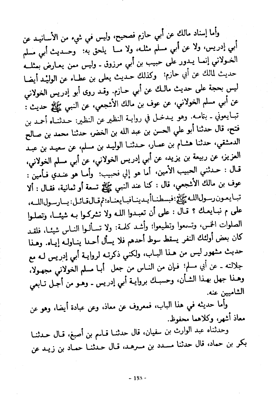 وَأَمَّا إِسْنَادُ مَالِكٍ عَنْ أَبِي حَازِمٍ فَصَحِيحٌ وَلَيْسَ فِي شَيْءٍ مِنَ الْأَسَانِيدِ عَنْ أَبِي إِدْرِيسَ وَلَا عَنْ أَبِي مُسْلِمٍ مِثْلَهُ وَلَا ما يحلق بِهِ وَحَدِيثُ أَبِي مُسْلِمٍ الْخَوْلَانِيِّ إِنَّمَا يَدُورُ عَلَى حَبِيبِ بْنِ أَبِي مَرْزُوقٍ وَلَيْسَ مِمَّنْ يُعَارَضُ بِمِثْلِهِ حَدِيثٌ لِمَالِكٍ عَنْ أَبَى حَازِمٍ وَكَذَلِكَ حَدِيثُ يَعْلَى بْنِ عَطَاءٍ عَنِ الْوَلِيدِ أَيْضًا لَيْسَ بِحُجَّةٍ عَلَى حَدِيثِ مَالِكٍ عَنْ أَبِي حَازِمٍ وَقَدْ رَوَى أَبُو إِدْرِيسَ الْخَوْلَانِيُّ عَنْ أَبِي مُسْلِمٍ الْخَوْلَانِيِّ عَنْ عَوْفِ بْنِ مَالِكٍ الْأَشْجَعِيِّ عَنِ النَّبِيِّ صَلَّى اللَّهُ عَلَيْهِ وَسَلَّمَ حَدِيثٌ تُبَايِعُونِي بِتَمَامِهِ وَهُوَ يَدْخُلُ فِي رِوَايَةِ النَّظِيرِ عَنِ النَّظِيرِ حَدَّثَنَاهُ أَحْمَدُ بْنُ فَتْحٍ قَالَ حَدَّثَنَا أَبُو عَلِيٍّ الْحَسَنُ بْنُ عَبْدِ اللَّهِ بْنِ الْخَضِرِ حَدَّثَنَا مُحَمَّدُ بْنُ صَالِحٍ الدِّمَشْقِيُّ حَدَّثَنَا هِشَامُ بْنُ عَمَّارٍ حَدَّثَنَا الْوَلِيدُ بْنُ مُسْلِمٍ عَنْ سَعِيدُ بْنُ عَبْدِ الْعَزِيزِ عَنْ رَبِيعَةَ بْنِ يَزِيدَ عَنْ أَبِي إِدْرِيسَ الْخَوْلَانِيِّ عَنْ أَبِي مُسْلِمٍ الْخَوْلَانِيِّ قَالَ حَدَّثَنِي الْحَبِيبُ الْأَمِينُ أَمَّا هُوَ إِلَيَّ فَحَبِيبٌ وَأَمَّا هُوَ عِنْدِي فَأَمِينٌ عَوْفُ بْنُ مَالِكٍ الْأَشْجَعِيُّ قَالَ كُنَّا عِنْدَ النَّبِيِّ صَلَّى اللَّهُ عَلَيْهِ وَسَلَّمَ تِسْعَةً أَوْ ثَمَانِيَةً فَقَالَ أَلَا تُبَايِعُونَ رَسُولَ اللَّهِ صَلَّى اللَّهُ عَلَيْهِ وَسَلَّمَ فَبَسَطْنَا أَيْدِيَنَا فَبَايَعْنَاهُ ثُمَّ قَالَ قَائِلٌ يَا رسول الله على م نُبَايِعُكَ قَالَ عَلَى أَنْ تَعْبُدُوا اللَّهَ وَلَا تُشْرِكُوا بِهِ شَيْئًا وَتُصَلُّوا الصَّلَوَاتِ الْخَمْسَ وَتَسْمَعُوا وَتُطِيعُوا وَأَشَدُّ كَلِمَةً وَلَا تَسْأَلُوا النَّاسَ شَيْئًا فَلَقَدْ كَانَ بَعْضُ أُولَئِكَ النَّفَرِ يَسْقُطُ سَوْطُ أَحَدِهِمْ فَلَا يَسْأَلُ أَحَدًا يُنَاوِلُهُ إِيَّاهُ وَهَذَا حَدِيثٌ مَشْهُورٌ لَيْسَ مِنْ هَذَا الْبَابِ وَلَكِنِّي ذكرته لرواية أبي إدريس له مع حَدِيثٌ مَشْهُورٌ لَيْسَ مِنْ هَذَا الْبَابِ وَلَكِنِّي ذَكَرْتُهُ لِرِوَايَةِ أَبِي إِدْرِيسَ لَهُ مَعَ جَلَالَتِهِ عَنْ أَبِي مُسْلِمٍ فَإِنَّ مِنَ النَّاسِ مَنْ جَعَلَ أَبَا مُسْلِمٍ الْخَوْلَانِيَّ مَجْهُولًا وَهَذَا جَهْلٌ بِهَذَا الشَّأْنِ وَحَسْبُكَ بِرِوَايَةِ أَبِي إِدْرِيسَ وَهُوَ مِنْ أَجَلِّ تَابِعِي الشَّامِيِّينَ عَنْهُ وَأَمَّا حَدِيثُهُ فِي هَذَا الْبَابِ فَمَعْرُوفٌ عَنْ مُعَاذٍ وَعَنْ عُبَادَةَ أَيْضًا وَهُوَ عَنْ مُعَاذٍ أَشْهَرُ وَكِلَاهُمَا مَحْفُوظٌ وَحَدَّثَنَاهُ عَبْدُ الْوَارِثِ بْنُ سُفْيَانَ قَالَ حَدَّثَنَا قَاسِمُ بْنُ أَصْبَغَ قَالَ حَدَّثَنَا بَكْرُ بْنُ حَمَّادٍ قَالَ حَدَّثَنَا مُسَدَّدُ بْنُ مُسَرْهَدٍ قَالَ حَدَّثَنَا حَمَّادُ بْنُ زَيْدٍ عَنْ