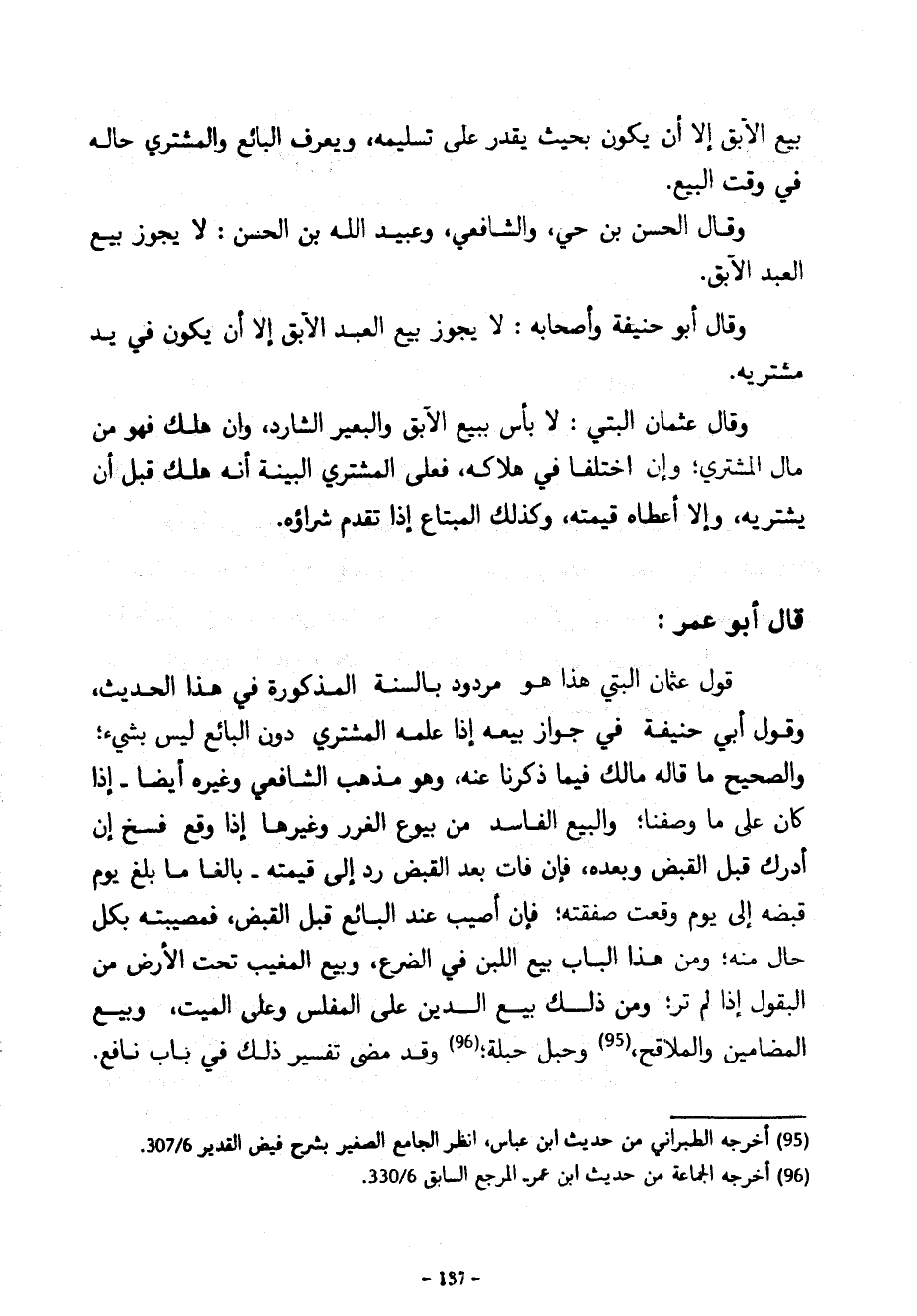 بَيْعُ الْآبِقِ إِلَّا أَنْ يَكُونَ بِحَيْثُ يَقْدِرُ عَلَى تَسْلِيمِهِ وَيَعْرِفُ الْبَائِعُ وَالْمُشْتَرِي حَالَهُ فِي وَقْتِ الْبَيْعِ وَقَالَ الْحَسَنُ بْنُ حَيٍّ وَالشَّافِعِيُّ وَعُبَيْدُ اللَّهِ بْنُ الْحَسَنِ لَا يَجُوزُ بَيْعُ الْعَبْدِ الْآبِقِ وَقَالَ أَبُو حَنِيفَةَ وَأَصْحَابُهُ لَا يَجُوزُ بَيْعُ الْعَبْدِ الْآبِقِ إِلَّا أَنْ يَكُونَ فِي يَدِ مُشْتَرِيهِ وَقَالَ عُثْمَانُ الْبَتِّيُّ لَا بَأْسَ بِبَيْعِ الْآبِقِ وَالْبَعِيرِ الشَّارِدِ وَإِنْ هَلَكَ فَهُوَ مِنْ مَالِ الْمُشْتَرِي وَإِنِ اخْتَلَفَا فِي هَلَاكِهِ فَعَلَى الْمُشْتَرِي الْبَيِّنَةُ أَنَّهُ هَلَكَ قَبْلَ أَنْ يَشْتَرِيَهُ وَإِلَّا أَعْطَاهُ قِيمَتَهُ وَكَذَلِكَ الْمُبْتَاعُ إِذَا تَقَدَّمَ شِرَاؤُهُ قَالَ أَبُو عُمَرَ قَوْلُ عُثْمَانَ الْبَتِّيِّ هَذَا هُوَ مَرْدُودٌ بِالسُّنَّةِ الْمَذْكُورَةِ فِي هَذَا الْحَدِيثِ وَقَوْلُ أَبِي حَنِيفَةَ فِي جَوَازِ بَيْعِهِ إِذَا عَلِمَهُ الْمُشْتَرِي دُونَ الْبَائِعِ لَيْسَ بِشَيْءٍ وَالصَّحِيحُ مَا قَالَهُ مَالِكٌ فِيمَا ذَكَرْنَا عَنْهُ وَهُوَ مَذْهَبُ الشَّافِعِيِّ وَغَيْرِهِ أَيْضًا إِذَا كَانَ عَلَى مَا وَصَفْنَا وَالْبَيْعُ الْفَاسِدُ مِنْ بُيُوعِ الْغَرَرِ وَغَيْرِهَا إِذَا وَقَعَ فُسِخَ إِنْ أُدْرِكَ قَبْلَ الْقَبْضِ وَبَعْدَهُ فَإِنْ فَاتَ بَعْدَ الْقَبْضِ رُدَّ إِلَى قِيمَتِهِ بَالِغًا مَا بَلَغَ يَوْمَ قَبْضِهِ إِلَى يَوْمِ وَقَعَتْ صَفْقَتُهُ فَإِنْ أُصِيبَ عِنْدَ الْبَائِعِ قَبْلَ الْقَبْضِ فَمُصِيبَتُهُ بِكُلِّ حَالٍ مِنْهُ وَمِنْ هَذَا الْبَابِ بَيْعُ اللَّبَنِ فِي الضَّرْعِ وَبَيْعُ الْمَغِيبِ تَحْتَ الْأَرْضِ مِنَ الْبُقُولِ إِذَا لَمْ تُرَ وَمِنْ ذَلِكَ بَيْعُ الدَّيْنِ عَلَى الْمُفْلِسِ وَعَلَى الْمَيِّتِ وَبَيْعُ الْمَضَامِينِ وَالْمَلَاقِحِ وَحَبَلِ حَبَلَةٍ وَقَدْ مَضَى تَفْسِيرُ ذَلِكَ فِي بَابِ نَافِعٍ