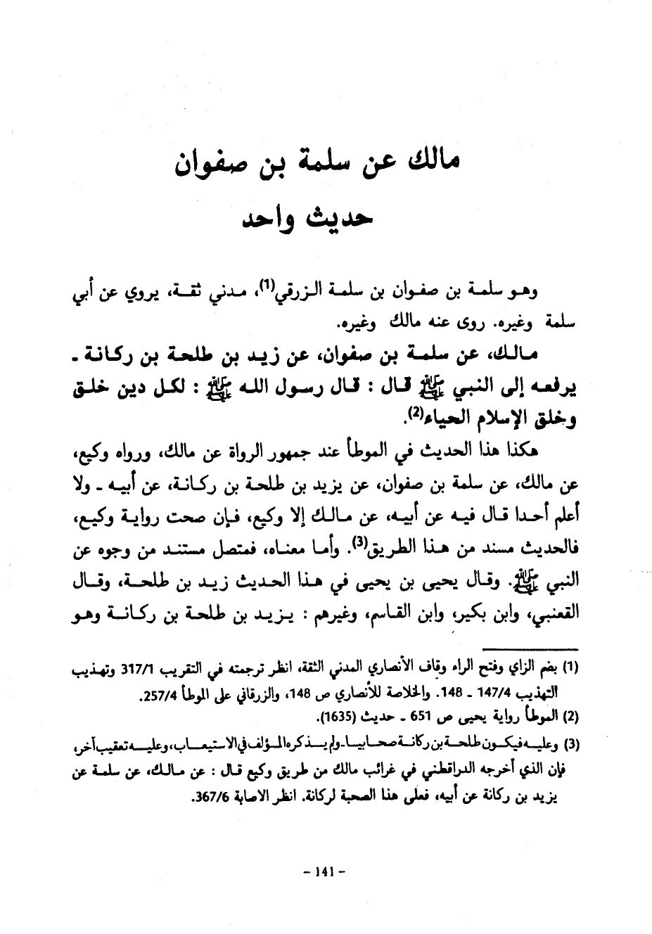 مَالِكٌ عَنْ سَلَمَةَ بْنِ صَفْوَانَ حَدِيثٌ وَاحِدٌ وَهُوَ سَلَمَةُ بْنُ صَفْوَانَ بْنِ سَلَمَةَ الزُّرَقِيُّ مَدَنِيٌّ ثِقَةٌ يَرْوِي عَنْ أَبِي سَلَمَةَ وَغَيْرِهِ رَوَى عَنْهُ مَالِكٌ وَغَيْرُهُ مَالِكٌ عَنْ سَلَمَةَ بْنَ صَفْوَانَ عَنْ زَيْدِ بْنِ طَلْحَةَ بْنِ رُكَانَةَ يَرْفَعُهُ إِلَى النَّبِيَّ صَلَّى اللَّهُ عَلَيْهِ وَسَلَّمَ قَالَ قَالَ رَسُولُ اللَّهِ صَلَّى اللَّهُ عَلَيْهِ وَسَلَّمَ لِكُلِّ دِينٍ خُلُقٌ وَخُلُقُ الْإِسْلَامِ الْحَيَاءُ هَكَذَا هَذَا الْحَدِيثُ فِي الْمُوَطَّأِ عِنْدَ جُمْهُورِ الرُّوَاةِ عَنْ مَالِكٍ وَرَوَاهُ وَكِيعٌ عَنْ مَالِكٍ عَنْ سَلَمَةَ بْنِ صَفْوَانَ عَنْ يَزِيدَ بْنِ طَلْحَةَ بْنِ رُكَانَةَ عَنْ أَبِيهِ وَلَا أَعْلَمُ أَحَدًا قَالَ فِيهِ عَنْ أَبِيهِ عَنْ مَالِكٍ إِلَّا وَكِيعٌ فَإِنْ صَحَّتْ رِوَايَةُ وَكِيعٍ فَالْحَدِيثُ مُسْنَدٌ مِنْ هَذَا الطَّرِيقِ وَأَمَّا مَعْنَاهُ فَمُتَّصِلٌ مُسْتَنَدٌ مِنْ وُجُوهٍ عَنِ النَّبِيِّ صَلَّى اللَّهُ عَلَيْهِ وَسَلَّمَ وَقَالَ يَحْيَى بْنُ يَحْيَى فِي هَذَا الْحَدِيثِ زَيْدُ بْنُ طَلْحَةَ وَقَالَ الْقَعْنَبِيُّ وَابْنُ بُكَيْرٍ وَابْنُ الْقَاسِمِ وَغَيْرُهُمْ يَزِيدُ بْنُ طَلْحَةَ بْنِ رُكَانَةَ وَهُوَ