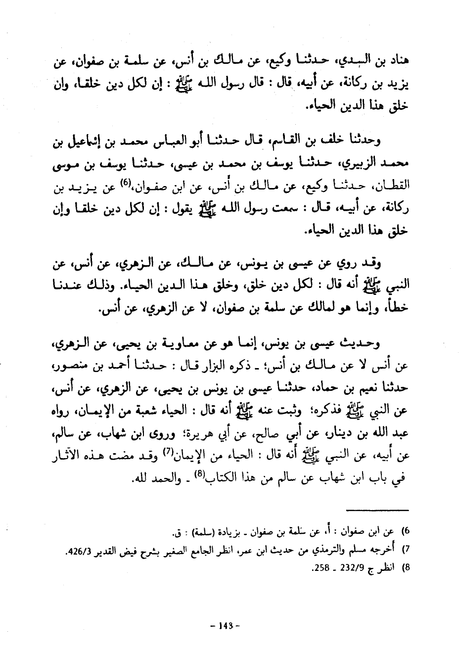 هَنَّادُ بْنُ السُّدِّيِّ حَدَّثَنَا وَكِيعٌ عَنْ مَالِكِ بْنِ أَنَسٍ عَنْ سَلَمَةَ بْنِ صَفْوَانَ عَنْ يَزِيدَ بْنِ رُكَانَةَ عَنْ أَبِيهِ قَالَ قَالَ رَسُولُ اللَّهِ صَلَّى الله عليه وسلم إن لِكُلِّ دِينٍ خُلُقًا وَإِنَّ خُلُقَ هَذَا الدِّينِ الْحَيَاءُ وَحَدَّثَنَا خَلَفُ بْنُ الْقَاسِمِ قَالَ حَدَّثَنَا أَبُو الْعَبَّاسِ مُحَمَّدُ بْنُ إِسْمَاعِيلَ بْنِ مُحَمَّدٍ الزُّبَيْرِيُّ حَدَّثَنَا يُوسُفُ بْنُ مُحَمَّدِ بْنِ عِيسَى حَدَّثَنَا يُوسُفُ بْنُ مُوسَى الْقَطَّانُ حَدَّثَنَا وَكِيعٌ عَنْ مَالِكِ بْنِ أَنَسٍ عَنْ ابْنِ صَفْوَانَ عَنْ يَزِيدَ بْنِ رُكَانَةَ عَنِ أبِيهِ قَالَ سَمِعْتُ رَسُولَ اللَّهِ صَلَّى اللَّهُ عَلَيْهِ وسلم يَقُولُ إِنَّ لِكُلِّ دِينٍ خُلُقًا وَإِنَّ خُلُقَ هَذَا الدِّينِ الْحَيَاءُ وَقَدْ رُوِيَ عَنْ عِيسَى بْنِ يُونُسَ عَنْ مَالِكٍ عَنْ الزُّهْرِيِّ عَنْ أَنَسٍ عَنِ النَّبِيِّ صَلَّى اللَّهُ عَلَيْهِ وَسَلَّمَ أَنَّهُ قَالَ لِكُلِّ دِينٍ خُلُقٌ وَخُلُقُ هَذَا الدِّينِ الْحَيَاءُ وَذَلِكَ عِنْدَنَا خَطَأٌ وَإِنَّمَا هُوَ لمالك عَنْ سَلَمَةَ بْنِ صَفْوَانَ لَا عَنِ الزُّهْرِيِّ عَنْ أَنَسٍ وَحَدِيثُ عِيسَى بْنِ يُونُسَ إِنَّمَا هُوَ عَنْ مُعَاوِيَةَ بْنِ يَحْيَى عَنِ الزُّهْرِيِّ عَنْ أَنَسٍ لَا عَنْ مَالِكِ بْنِ أَنَسٍ ذَكَرَهُ الْبَزَّارُ قَالَ حَدَّثَنَا أَحْمَدُ بْنُ مَنْصُورٍ حَدَّثَنَا نُعَيْمُ بْنُ حَمَّادٍ حَدَّثَنَا عِيسَى بْنُ يُونُسَ بْنِ يَحْيَى عَنِ الزُّهْرِيِّ عَنْ أَنَسٍ عَنِ النَّبِيِّ صَلَّى اللَّهُ عَلَيْهِ وَسَلَّمَ فَذَكَرَهُ وَثَبَتَ عَنْهُ صَلَّى اللَّهُ عَلَيْهِ وَسَلَّمَ أَنَّهُ قَالَ الْحَيَاءُ شُعْبَةٌ مِنَ الْإِيمَانِ رَوَاهُ عَبْدِ اللَّهِ بْنِ دِينَارٍ عَنْ أَبِي صَالِحٍ عَنْ أَبِي هُرَيْرَةَ وَرَوَى ابْنِ شِهَابٍ عَنْ سَالِمٍ عَنْ أَبِيهِ عَنِ النَّبِيِّ صَلَّى اللَّهُ عَلَيْهِ وَسَلَّمَ أَنَّهُ قَالَ الْحَيَاءُ مِنَ الْإِيمَانِ وَقَدْ مَضَتْ هَذِهِ الْآثَارُ فِي بَابِ ابْنِ شِهَابٍ عَنْ سَالِمٍ مِنْ هَذَا الْكِتَابِ وَالْحَمْدُ لِلَّهِ