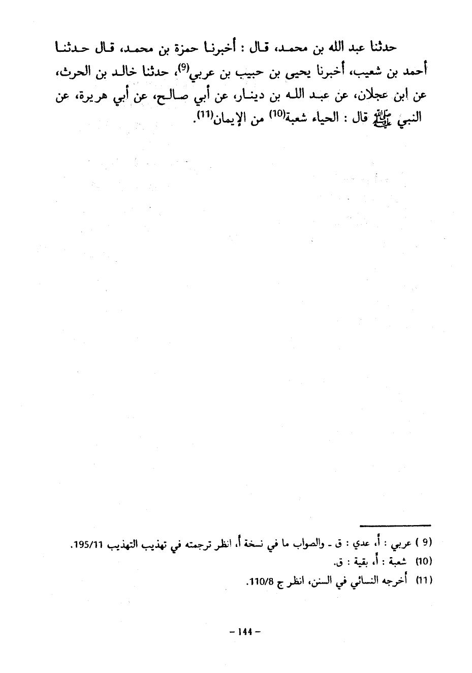 حَدَّثَنَا عَبْدُ اللَّهِ بْنُ مُحَمَّدٍ قَالَ أَخْبَرَنَا حَمْزَةُ بْنُ مُحَمَّدٍ قَالَ حَدَّثَنَا أَحْمَدُ بْنُ شُعَيْبٍ أَخْبَرَنَا يَحْيَى بْنُ حَبِيبِ بْنِ عَرَبِيٍّ حدثنا خالد بن الحرث عَنِ ابْنِ عَجْلَانَ عَنْ عَبْدِ اللَّهِ بْنِ دِينَارٍ عَنْ أَبِي صَالِحٍ عَنْ أَبِي هُرَيْرَةَ عَنِ النَّبِيِّ صَلَّى اللَّهُ عَلَيْهِ وَسَلَّمَ قَالَ الْحَيَاءُ شُعْبَةٌ مِنَ الْإِيمَانِ