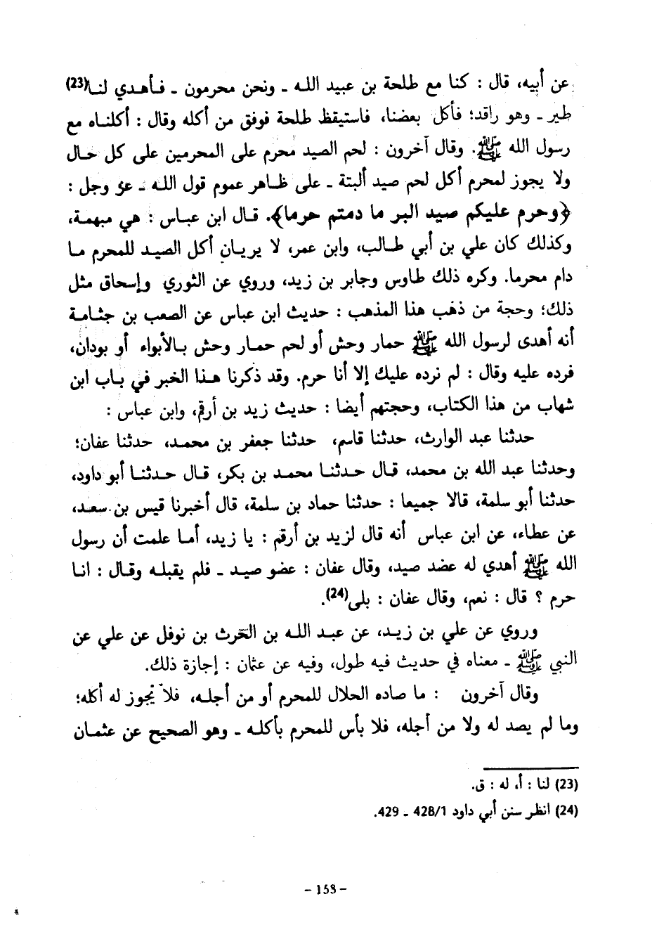 عَنْ أَبِيهِ قَالَ كُنَّا مَعَ طَلْحَةَ بْنِ عُبَيْدِ اللَّهِ وَنَحْنُ مُحْرِمُونَ فَأُهْدِيَ لَنَا طَيْرٌ وَهُوَ رَاقِدٌ فَأَكَلَ بَعْضُنَا فَاسْتَيْقَظَ طَلْحَةُ فَوَفَّقَ مَنْ أَكَلَهُ وَقَالَ أَكَلْنَاهُ مَعَ رَسُولِ اللَّهِ صَلَّى اللَّهُ عَلَيْهِ وَسَلَّمَ وَقَالَ آخَرُونَ لَحْمُ الصَّيْدِ مُحَرَّمٌ عَلَى الْمُحْرِمِينَ عَلَى كُلِّ حَالٍ وَلَا يَجُوزُ لِمُحْرِمٍ أَكْلُ لَحْمِ صَيْدٍ الْبَتَّةَ على ظاهر عموم قول عَزَّ وَجَلَّ وَحُرِّمَ عَلَيْكُمْ صَيْدُ الْبَرِّ مَا دُمْتُمْ حُرُمًا قَالَ ابْنُ عَبَّاسٍ هِيَ مُبْهَمَةٌ وَكَذَلِكَ كَانَ عَلِيُّ بْنُ أَبِي طَالِبٍ وَابْنُ عُمَرَ لَا يَرَيَانِ أَكْلَ الصَّيْدِ لِلْمُحْرِمِ مَا دَامَ مُحْرِمًا وَكَرِهَ ذَلِكَ طَاوُسٌ وَجَابِرُ بْنُ زَيْدٍ وَرُوِيَ عَنِ الثَّوْرِيِّ وَإِسْحَاقَ مِثْلُ ذَلِكَ وَحُجَّةُ مَنْ ذَهَبَ هَذَا الْمَذْهَبَ حَدِيثُ ابْنِ عَبَّاسٍ عَنِ الصَّعْبِ بْنِ جَثَّامَةَ أَنَّهُ أُهْدِيَ لِرَسُولِ اللَّهِ صَلَّى اللَّهُ عَلَيْهِ وَسَلَّمَ حِمَارَ وَحْشٍ أَوْ لَحْمَ حِمَارِ وَحْشٍ بِالْأَبْوَاءِ أَوْ بِوَدَّانَ فَرَدَّهُ عَلَيْهِ وَقَالَ لَمْ نَرُدُّهُ عَلَيْكَ إِلَّا أَنَّا حُرُمٌ وَقَدْ ذَكَرْنَا هَذَا الْخَبَرَ فِي بَابِ ابْنِ شِهَابٍ مِنْ هَذَا الْكِتَابِ وَحُجَّتُهُمْ أَيْضًا حَدِيثُ زَيْدِ بْنِ أَرْقَمَ وَابْنِ عَبَّاسٍ حَدَّثَنَا عَبْدُ الْوَارِثِ حَدَّثَنَا قَاسِمٌ حَدَّثَنَا جَعْفَرُ بْنُ مُحَمَّدٍ حَدَّثَنَا عَفَّانُ وَحَدَّثَنَا عَبْدُ اللَّهِ بْنُ مُحَمَّدٍ قَالَ حَدَّثَنَا مُحَمَّدُ بْنُ بَكْرٍ قَالَ حَدَّثَنَا أَبُو دَاوُدَ حَدَّثَنَا أَبُو سَلَمَةَ قَالَا جَمِيعًا حَدَّثَنَا حَمَّادُ بْنُ سَلَمَةَ قَالَ أَخْبَرَنَا قَيْسِ بْنِ سَعْدٍ عَنْ عَطَاءٍ عَنِ ابْنِ عَبَّاسٍ أَنَّهُ قَالَ لِزَيْدِ بْنِ أَرْقَمَ يَا زَيْدُ أَمَا عَلِمْتُ أَنَّ رَسُولَ اللَّهِ صَلَّى اللَّهُ عَلَيْهِ وَسَلَّمَ أُهْدِيَ لَهُ عَضُدُ صَيْدٍ وَقَالَ عَفَّانُ عُضْوُ صَيْدٍ فَلَمْ يَقْبَلْهُ وَقَالَ إِنَّا حُرُمٌ قَالَ نَعَمْ وَقَالَ عَفَّانُ بَلَى وَرُوِيَ عَنْ عَلِيِّ بْنِ زَيْدٍ عن عبد الله بن الحرث بْنِ نَوْفَلٍ عَنْ عَلِيٍّ عَنِ النَّبِيِّ صَلَّى اللَّهُ عَلَيْهِ وَسَلَّمَ مَعْنَاهُ فِي حَدِيثٍ فِيهِ طُولٌ وَفِيهِ عَنْ عُثْمَانَ إِجَازَةُ ذَلِكَ وَقَالَ آخَرُونَ مَا صَادَهُ الْحَلَالُ لِلْمُحْرِمِ أَوْ مِنْ أَجْلِهِ فَلَا يَجُوزُ لَهُ أَكْلُهُ وَمَا لَمْ يُصَدْ لَهُ وَلَا مِنْ أَجْلِهِ فَلَا بَأْسَ لِلْمُحْرِمِ بِأَكْلِهِ وَهُوَ الصَّحِيحُ عَنْ عُثْمَانَ