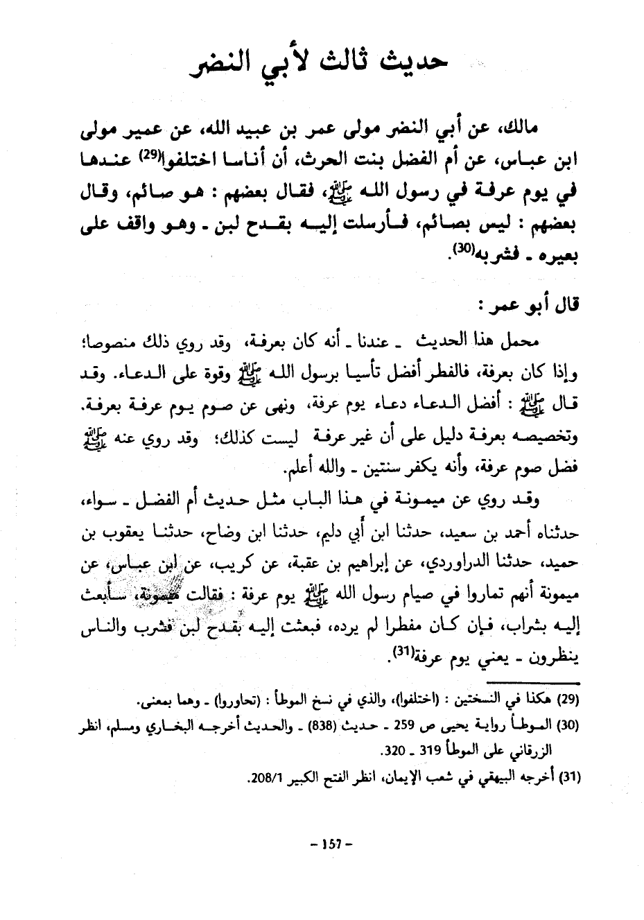 حَدِيثٌ ثَالِثٌ لِأَبِي النَّضْرِ مَالِكٌ عَنْ أَبِي النَّضْرِ مَوْلَى عُمَرَ بْنِ عُبَيْدِ الله عن عُمَيْرٍ مَوْلَى ابْنِ عَبَّاسٍ عَنْ أُمِّ الْفَضْلِ بنت الحرث أنا أُنَاسًا اخْتَلَفُوا عِنْدَهَا فِي يَوْمِ عَرَفَةَ فِي رسول الله صلى الله عليه وسلم فقال بَعْضُهُمْ هُوَ صَائِمٌ وَقَالَ بَعْضُهُمْ لَيْسَ بِصَائِمٍ فَأَرْسَلَتْ إِلَيْهِ بِقَدَحِ لَبَنٍ وَهُوَ وَاقِفٌ عَلَى بَعِيرِهِ فَشَرِبَهُ قَالَ أَبُو عُمَرَ مَحْمَلُ هَذَا الْحَدِيثِ عِنْدَنَا أَنَّهُ كَانَ بِعَرَفَةَ وَقَدْ رُوِيَ ذَلِكَ مَنْصُوصًا وَإِذَا كَانَ بِعَرَفَةَ فَالْفِطْرُ أَفْضَلُ تَأَسِّيًا بِرَسُولِ اللَّهِ صَلَّى اللَّهُ عَلَيْهِ وَسَلَّمَ وَقُوَّةً عَلَى الدُّعَاءِ وَقَدْ قَالَ صَلَّى اللَّهُ عَلَيْهِ وَسَلَّمَ أَفْضَلُ الدُّعَاءِ دُعَاءُ يَوْمِ عَرَفَةَ وَنَهَى عَنْ صَوْمِ يَوْمِ عَرَفَةَ بِعَرَفَةَ وَتَخْصِيصُهُ بِعَرَفَةَ دَلِيلٌ عَلَى أَنَّ غَيْرَ عَرَفَةَ لَيْسَتْ كَذَلِكَ وَقَدْ رُوِيَ عَنْهُ صَلَّى اللَّهُ عَلَيْهِ وَسَلَّمَ فَضْلُ صَوْمِ عَرَفَةَ وَأَنَّهُ يُكَفِّرُ سَنَتَيْنِ وَاللَّهُ أَعْلَمُ وَقَدْ رُوِيَ عَنْ مَيْمُونَةَ فِي هَذَا الْبَابِ مِثْلُ حَدِيثِ أُمِّ الْفَضْلِ سَوَاءً حَدَّثَنَاهُ أَحْمَدُ بْنُ سَعِيدٌ حَدَّثَنَا ابْنُ أَبِي دُلَيْمٍ حَدَّثَنَا ابْنُ وَضَّاحٍ حَدَّثَنَا يَعْقُوبُ بْنُ حُمَيْدٍ حَدَّثَنَا الدَّرَاوَرْدِيُّ عَنْ إِبْرَاهِيمَ بْنِ عُقْبَةَ عَنْ كُرَيْبٍ عَنِ ابْنِ عَبَّاسٍ عَنْ مَيْمُونَةَ أَنَّهُمْ تَمَارَوْا فِي صِيَامِ رَسُولُ اللَّهِ صَلَّى اللَّهُ عَلَيْهِ وَسَلَّمَ يَوْمَ عَرَفَةَ فَقَالَتْ مَيْمُونَةُ سَأَبْعَثُ إِلَيْهِ بِشَرَابٍ فَإِنْ كَانَ مُفْطِرًا لَمْ يَرُدَّهُ فَبَعَثَتْ إِلَيْهِ بِقَدَحِ لَبَنٍ فَشَرِبَ وَالنَّاسُ يَنْظُرُونَ يَعْنِي يَوْمَ عَرَفَةَ