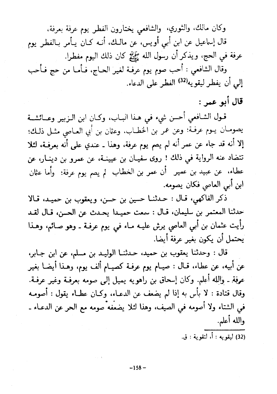 وَكَانَ مَالِكٌ وَالثَّوْرِيُّ وَالشَّافِعِيُّ يَخْتَارُونَ الْفِطْرَ يَوْمَ عَرَفَةَ بِعَرَفَةَ قَالَ إِسْمَاعِيلُ عَنِ ابْنِ أَبِي أُوَيْسٍ عَنْ مَالِكٍ أَنَّهُ كَانَ يَأْمُرُ بِالْفِطْرِ يَوْمَ عَرَفَةَ فِي الْحَجِّ وَيَذْكُرُ أَنَّ رَسُولَ اللَّهِ صَلَّى اللَّهُ عَلَيْهِ وَسَلَّمَ كَانَ ذَلِكَ الْيَوْمَ مُفْطِرًا وَقَالَ الشَّافِعِيُّ أُحِبُّ صَوْمَ يَوْمِ عَرَفَةَ لِغَيْرِ الْحَاجِّ فَأَمَّا مِنْ حَجَّ فَأَحَبَّ إِلَيَّ أَنْ يُفْطِرَ لِيُقَوِّيَهُ الْفِطْرُ عَلَى الدُّعَاءِ قَالَ أَبُو عُمَرَ قَوْلُ الشَّافِعِيِّ أَحْسَنُ شَيْءٍ فِي هَذَا الْبَابِ وَكَانَ ابْنُ الزُّبَيْرِ وَعَائِشَةُ يَصُومَانِ يَوْمَ عَرَفَةَ وَعَنْ عُمَرُ بْنُ الْخَطَّابِ وَعُثْمَانُ بْنُ أَبِي الْعَاصِي مِثْلُ ذَلِكَ إِلَّا أَنَّهُ قَدْ جَاءَ عَنْ عُمَرَ أَنَّهُ لَمْ يَصُمْ يَوْمَ عَرَفَةَ وَهَذَا عِنْدِي عَلَى أَنَّهُ بِعَرَفَةَ لِئَلَّا تَتَضَادَّ عَنْهُ الرِّوَايَةُ فِي ذَلِكَ رَوَى سُفْيَانُ بْنُ عُيَيْنَةَ عَنْ عَمْرِو بْنِ دِينَارٍ عَنْ عَطَاءٍ عَنْ عُبَيْدِ بْنِ عُمَيْرٍ أَنَّ عُمَرَ بْنَ الْخَطَّابِ لَمْ يَصُمْ يَوْمَ عرفة وأما عثمان ابن أَبِي الْعَاصِي فَكَانَ يَصُومُهُ ذَكَرَ الْفَاكِهِيُّ قَالَ حَدَّثَنَا حُسَيْنُ بْنُ حَسَنٍ وَيَعْقُوبُ بْنُ حُمَيْدٍ قالا حدثنا المعتمر بْنُ سُلَيْمَانَ قَالَ سَمِعْتُ حُمَيْدًا يُحَدِّثُ عَنِ الْحَسَنِ قَالَ لَقَدْ رَأَيْتُ عُثْمَانَ بْنَ أَبِي الْعَاصِي يُرَشُّ عَلَيْهِ مَاءٌ فِي يَوْمِ عَرَفَةَ وَهُوَ صَائِمٌ وَهَذَا يُحْتَمَلُ أَنْ يَكُونَ بِغَيْرِ عَرَفَةَ أَيْضًا قَالَ وَحَدَّثَنَا يَعْقُوبُ بْنُ حُمَيْدٍ حَدَّثَنَا الْوَلِيدُ بْنُ مُسْلِمٍ عَنِ ابْنِ جَابِرٍ عَنْ أَبِيهِ عَنْ عَطَاءٍ قَالَ صِيَامُ يَوْمِ عَرَفَةَ كَصِيَامِ أَلْفِ يَوْمٍ وَهَذَا أَيْضًا بِغَيْرِ عَرَفَةَ وَاللَّهُ أَعْلَمُ وَكَانَ إِسْحَاقُ بْنُ رَاهَوَيْهِ يَمِيلُ إِلَى صَوْمِهِ بِعَرَفَةَ وَغَيْرِ عَرَفَةَ وَقَالَ قَتَادَةُ لَا بَأْسَ بِهِ إِذَا لَمْ يَضْعُفُ عَنِ الدُّعَاءِ وَكَانَ عَطَاءٌ يَقُولُ أَصُومُهُ فِي الشِّتَاءِ وَلَا أَصُومُهُ فِي الصَّيْفِ وَهَذَا لِئَلَّا يُضْعِفُهُ صَوْمُهُ مَعَ الْحَرِّ عَنِ الدُّعَاءِ وَاللَّهُ أعلم