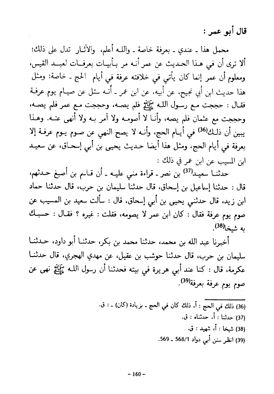 قَالَ أَبُو عُمَرَ مَحْمَلُ هَذَا عِنْدِي بِعَرَفَةَ خَاصَّةً وَاللَّهُ أَعْلَمُ وَالْآثَارُ تَدُلُّ عَلَى ذَلِكَ أَلَا تَرَى أَنَّ فِي هَذَا الْحَدِيثِ عَنْ عُمَرَ أَنَّهُ مَرَّ بِأَبْيَاتٍ بِعَرَفَاتٍ لِعَبْدِ الْقَيْسِ وَمَعْلُومٌ أَنَّ عُمَرَ إِنَّمَا كَانَ يَأْتِي فِي خِلَافَتِهِ عَرَفَةَ فِي أَيَّامِ الْحَجِّ خَاصَّةً وَمِثْلُ هَذَا حَدِيثُ ابْنِ أَبِي نَجِيحٍ عَنْ أَبِيهِ عَنِ ابْنِ عُمَرَ أَنَّهُ سُئِلَ عَنْ صِيَامِ يَوْمِ عَرَفَةَ فَقَالَ حَجَجْتُ مَعَ رَسُولِ اللَّهِ صَلَّى اللَّهُ عَلَيْهِ وَسَلَّمَ فَلَمْ يَصُمْهُ وَحَجَجْتُ مَعَ عُمَرَ فَلَمْ يَصُمْهُ وَحَجَجْتُ مَعَ عُثْمَانَ فَلَمْ يَصُمْهُ وَأَنَا لَا أَصُومُهُ وَلَا آمُرُ بِهِ وَلَا أَنْهَى عَنْهُ وَهَذَا يُبَيِّنُ أَنَّ ذَلِكَ فِي أَيَّامِ الْحَجِّ وَأَنَّهُ لَا يَصِحُّ النَّهْيُ عَنْ صَوْمِ يَوْمِ عَرَفَةَ إِلَّا بِعَرَفَةَ فِي أَيَّامِ الْحَجِّ وَمِثْلُ هَذَا أَيْضًا حَدِيثُ يحيى بن أبي إسحاق عن سعيد ابن الْمُسَيَّبِ عَنِ ابْنِ عُمَرَ فِي ذَلِكَ حَدَّثَنَا سَعِيدُ بْنُ نَصْرٍ قِرَاءَةً مِنِّي عَلَيْهِ أَنَّ قَاسِمَ بْنَ أَصْبَغَ حَدَّثَهُمْ قَالَ حَدَّثَنَا إِسْمَاعِيلُ بْنُ إِسْحَاقَ قَالَ حَدَّثَنَا سُلَيْمَانُ بْنُ حَرْبٍ قال حدثنا حماد ابن زَيْدٍ قَالَ حَدَّثَنِي يَحْيَى بْنُ أَبِي إِسْحَاقَ قَالَ سَأَلْتُ سَعِيدَ بْنَ الْمُسَيَّبِ عَنْ صَوْمِ يَوْمِ عَرَفَةَ فَقَالَ كَانَ ابْنُ عُمَرَ لَا يَصُومُهُ فَقُلْتُ غَيْرُهُ فَقَالَ حَسْبُكَ بِهِ شَيْخًا أَخْبَرَنَا عَبْدُ اللَّهِ بْنُ مُحَمَّدٍ حَدَّثَنَا مُحَمَّدُ بْنُ بَكْرٍ حَدَّثَنَا أَبُو دَاوُدَ حَدَّثَنَا سُلَيْمَانُ بْنُ حَرْبٍ قَالَ حَدَّثَنَا حَوْشَبُ بْنُ عُقَيْلٍ عَنْ مَهْدِيٍّ الْهَجَرِيِّ قَالَ حَدَّثَنَا عِكْرِمَةُ قَالَ كُنَّا عِنْدَ أَبَى هُرَيْرَةَ فِي بَيْتِهِ فَحَدَّثَنَا أن رسول الله صلى الله عليه وسلم نَهَى عَنْ صَوْمِ يَوْمِ عَرَفَةَ بِعَرَفَةَ