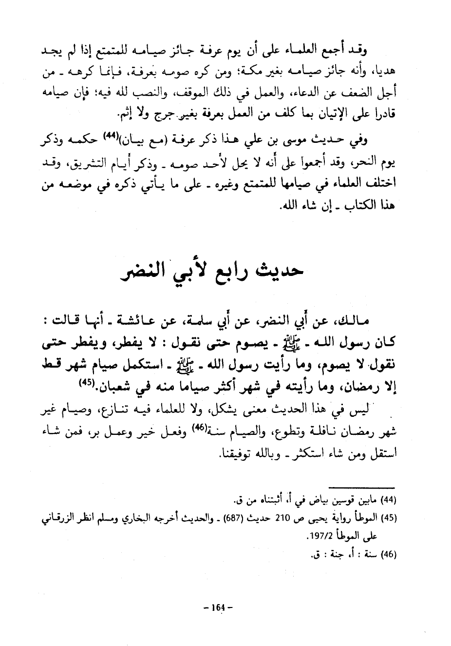 حَدِيثٌ رَابِعٌ لِأَبِي النَّضْرِ مَالِكٌ عَنْ أَبِي النَّضْرِ عَنْ أَبِي سَلَمَةَ عَنْ عَائِشَةَ أَنَّهَا قَالَتْ كَانَ رَسُولُ اللَّهِ صَلَّى اللَّهُ عَلَيْهِ وَسَلَّمَ يَصُومُ حَتَّى نقول لايفطر وَيُفْطِرُ حَتَّى نَقُولَ لَا يَصُومُ وَمَا رَأَيْتُ رَسُولَ اللَّهِ صَلَّى اللَّهُ عَلَيْهِ وَسَلَّمَ اسْتَكْمَلَ صِيَامَ شَهْرٍ قَطُّ إِلَّا رَمَضَانَ وَمَا رَأَيْتُهُ فِي شَهْرٍ أَكْثَرَ صِيَامًا مِنْهُ فِي شَعْبَانَ لَيْسَ فِي هَذَا الْحَدِيثِ مَعْنًى يُشْكِلُ وَلَا لِلْعُلَمَاءِ فِيهِ تَنَازُعٌ وَصِيَامُ غَيْرِ شَهْرِ رَمَضَانَ نَافِلَةٌ وَتَطَوُّعٌ وَالصِّيَامُ سُنَّةٌ وَفِعْلُ خَيْرٍ وَعَمَلُ بِرٍّ فَمَنْ شَاءَ اسْتَقَلَّ وَمَنْ شَاءَ اسْتَكْثَرَ وبالله توفيقنا