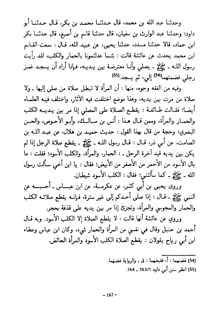 وَحَدَّثَنَا عَبْدُ اللَّهِ بْنُ مُحَمَّدٍ قَالَ حَدَّثَنَا مُحَمَّدُ بْنُ بَكْرٍ قَالَ حَدَّثَنَا أَبُو دَاوُدَ وَحَدَّثَنَا عَبْدُ الْوَارِثِ بْنُ سُفْيَانَ قَالَ حَدَّثَنَا قاسم بن أصبغ قال حدثنا بكر ابن حَمَّادٍ قَالَا حَدَّثَنَا مُسَدَّدٌ حَدَّثَنَا يَحْيَى عَنْ عُبَيْدِ اللَّهِ قال سمعت القاسم ابن مُحَمَّدٍ يُحَدِّثُ عَنْ عَائِشَةَ قَالَتْ بِئْسَمَا عَدَلْتُمُونَا بِالْحِمَارِ وَالْكَلْبِ لَقَدْ رَأَيْتُ رَسُولَ اللَّهِ صَلَّى اللَّهُ عَلَيْهِ وَسَلَّمَ يُصَلِّي وَأَنَا مُعْتَرِضَةٌ بَيْنَ يديه فإذا أراد أن يسجد غمز رجلي فَضَمَمْتُهُمَا إِلَيَّ ثُمَّ يَسْجُدُ وَفِيهِ مِنَ الْفِقْهِ وُجُوهٌ مِنْهَا أَنَّ الْمَرْأَةَ لَا تُبْطِلُ صَلَاةَ مَنْ صَلَّى إِلَيْهَا وَلَا صَلَاةَ مَنْ مَرَّتْ بَيْنَ يَدَيْهِ وَهَذَا مَوْضِعٌ اخْتَلَفَتْ فِيهِ الْآثَارُ وَاخْتَلَفَ فِيهِ الْعُلَمَاءُ أَيْضًا فَقَالَتْ طَائِفَةٌ يَقْطَعُ الصَّلَاةَ عَلَى الْمُصَلِّي إِذَا مَرَّ بَيْنَ يَدَيْهِ الْكَلْبُ وَالْحِمَارُ وَالْمَرْأَةُ وَمِمَّنْ قَالَ هَذَا أَنَسُ بْنُ مَالِكٍ وَأَبُو الْأَحْوَصِ وَالْحَسَنُ الْبَصْرِيُّ وَحَجَّةُ مَنْ قَالَ بِهَذَا الْقَوْلِ حَدِيثُ حُمَيْدِ بْنِ هِلَالٍ عَنْ عَبْدِ اللَّهِ بْنِ الصَّامِتِ عَنْ أَبِي ذَرٍّ قَالَ قَالَ رَسُولُ اللَّهِ صَلَّى اللَّهُ عَلَيْهِ وَسَلَّمَ يَقْطَعُ صَلَاةَ الرَّجُلِ إِذَا لَمْ يَكُنْ بَيْنَ يَدَيْهِ قَيْدُ آخِرَةِ الرَّحْلِ الْحِمَارُ وَالْمَرْأَةُ وَالْكَلْبُ الْأَسْوَدُ فَقُلْتُ مَا بَالُ الْأَسْوَدِ مِنَ الْأَحْمَرِ مِنَ الْأَصْفَرِ مِنَ الْأَبْيَضِ فَقَالَ يَا ابْنَ أَخِي سَأَلْتُ رَسُولَ اللَّهِ صَلَّى اللَّهُ عَلَيْهِ وَسَلَّمَ كَمَا سَأَلْتَنِي فَقَالَ الْكَلْبُ الْأَسْوَدُ شَيْطَانٌ وَرَوَى يَحْيَى بْنِ أَبِي كَثِيرٍ عَنْ عِكْرِمَةَ عَنِ ابْنِ عَبَّاسٍ أَحْسَبُهُ عَنِ النَّبِيِّ صَلَّى اللَّهُ عَلَيْهِ وَسَلَّمَ قَالَ إِذَا صَلَّى أَحَدُكُمْ إِلَى غَيْرِ سُتْرَةٍ فَإِنَّهُ يَقْطَعُ صَلَاتَهُ الْكَلْبُ وَالْحِمَارُ وَالْمَجُوسِيُّ وَالْمَرْأَةُ وَتُجْزِئُ إذا مر بين يديه على قدفه بِحَجَرٍ وَرُوِيَ عَنْ عَائِشَةَ أَنَّهَا قَالَتْ لَا يَقْطَعُ الصَّلَاةَ إِلَّا الْكَلْبُ الْأَسْوَدُ وَبِهِ قَالَ أَحْمَدُ بْنُ حَنْبَلٍ وَقَالَ فِي نَفْسِي مِنَ الْمَرْأَةِ وَالْحِمَارِ شَيْءٌ وَكَانَ ابْنُ عَبَّاسٍ وَعَطَاءُ ابن أبي رياح يَقُولَانِ يَقْطَعُ الصَّلَاةَ الْكَلْبُ الْأَسْوَدُ وَالْمَرْأَةُ الْحَائِضُ