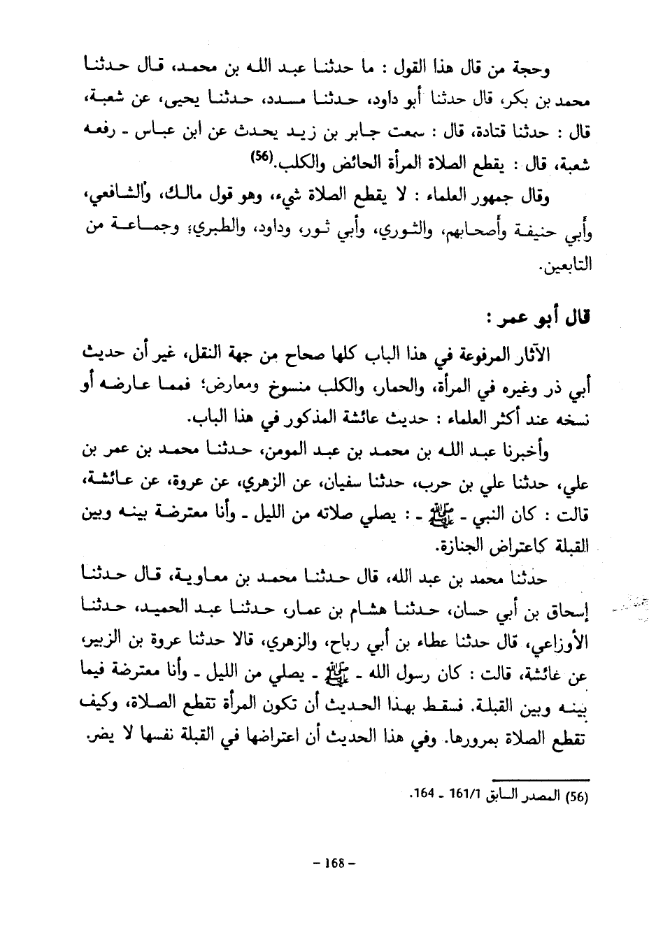 وَحَجَّةُ مَنْ قَالَ هَذَا الْقَوْلَ مَا حَدَّثَنَا عَبْدُ اللَّهِ بْنُ مُحَمَّدٍ قَالَ حَدَّثَنَا مُحَمَّدُ بْنُ بَكْرٍ قَالَ حَدَّثَنَا أَبُو دَاوُدَ حَدَّثَنَا مُسَدَّدٌ حَدَّثَنَا يَحْيَى عَنْ شُعْبَةَ قَالَ حَدَّثَنَا قَتَادَةُ قَالَ سَمِعْتُ جَابِرَ بْنَ زَيْدٍ يُحَدِّثُ عَنِ ابْنِ عَبَّاسٍ رَفَعَهُ شُعْبَةُ قَالَ يَقْطَعُ الصَّلَاةَ الْمَرْأَةُ الْحَائِضُ وَالْكَلْبُ وَقَالَ جُمْهُورُ الْعُلَمَاءِ لَا يَقْطَعُ الصَّلَاةَ شَيْءٌ وَهُوَ قَوْلُ مَالِكٍ وَالشَّافِعِيِّ وَأَبِي حَنِيفَةَ وَأَصْحَابِهِمْ وَالثَّوْرِيِّ وَأَبِي ثَوْرٍ وَدَاوُدَ وَالطَّبَرِيِّ وَجَمَاعَةٍ مِنَ التَّابِعِينَ قَالَ أَبُو عُمَرَ الْآثَارُ الْمَرْفُوعَةُ فِي هَذَا الْبَابِ كُلُّهَا صِحَاحٌ مِنْ جِهَةِ النَّقْلِ غَيْرَ أَنَّ حَدِيثَ أَبِي ذَرٍّ وَغَيْرِهِ فِي الْمَرْأَةِ وَالْحِمَارِ وَالْكَلْبِ مَنْسُوخٌ وَمُعَارَضٌ فَمِمَّا عَارَضَهُ أَوْ نَسَخَهُ عِنْدَ أَكْثَرِ الْعُلَمَاءِ حَدِيثُ عَائِشَةَ الْمَذْكُورِ فِي هَذَا الْبَابِ وَأَخْبَرَنَا عَبْدُ اللَّهِ بْنُ مُحَمَّدِ بْنِ عَبْدِ الْمُؤْمِنِ حَدَّثَنَا مُحَمَّدُ بْنُ عُمَرَ بْنِ عَلِيٍّ حَدَّثَنَا عَلِيُّ بْنُ حَرْبٍ حَدَّثَنَا سُفْيَانُ عَنِ الزُّهْرِيِّ عَنْ عُرْوَةَ عَنْ عَائِشَةَ قَالَتْ كَانَ النَّبِيُّ صَلَّى اللَّهُ عَلَيْهِ وَسَلَّمَ يُصَلِّي صَلَاتَهُ مِنَ اللَّيْلِ وَأَنَا مُعْتَرِضَةٌ بَيْنَهُ وَبَيْنَ الْقِبْلَةِ كَاعْتِرَاضِ الْجِنَازَةِ حَدَّثَنَا مُحَمَّدُ بْنُ عَبْدِ اللَّهِ قَالَ حَدَّثَنَا مُحَمَّدُ بْنُ مُعَاوِيَةَ قَالَ حَدَّثَنَا إِسْحَاقُ بْنُ أَبِي حَسَّانَ حَدَّثَنَا هِشَامُ بْنُ عَمَّارٍ حَدَّثَنَا عَبْدُ الْحَمِيدِ حَدَّثَنَا الْأَوْزَاعِيُّ قَالَ حَدَّثَنَا عَطَاءُ بْنُ أَبِي رَبَاحٍ وَالزُّهْرِيُّ قَالَا حَدَّثَنَا عُرْوَةُ بْنُ الزُّبَيْرِ عَنْ عَائِشَةَ قَالَتْ كَانَ رَسُولُ اللَّهِ صَلَّى اللَّهُ عَلَيْهِ وَسَلَّمَ يُصَلِّي مِنَ اللَّيْلِ وَأَنَا مُعْتَرِضَةٌ فِيمَا بَيْنَهُ وَبَيْنَ الْقِبْلَةِ فَسَقَطَ بِهَذَا الْحَدِيثِ أَنَّ تَكُونَ الْمَرْأَةُ تَقْطَعُ الصَّلَاةَ وَكَيْفَ تَقْطَعُ الصَّلَاةَ بِمُرُورِهَا وَفِي هَذَا الْحَدِيثِ أَنَّ اعْتِرَاضَهَا فِي الْقِبْلَةِ نَفْسِهَا لَا يَضُرُّ