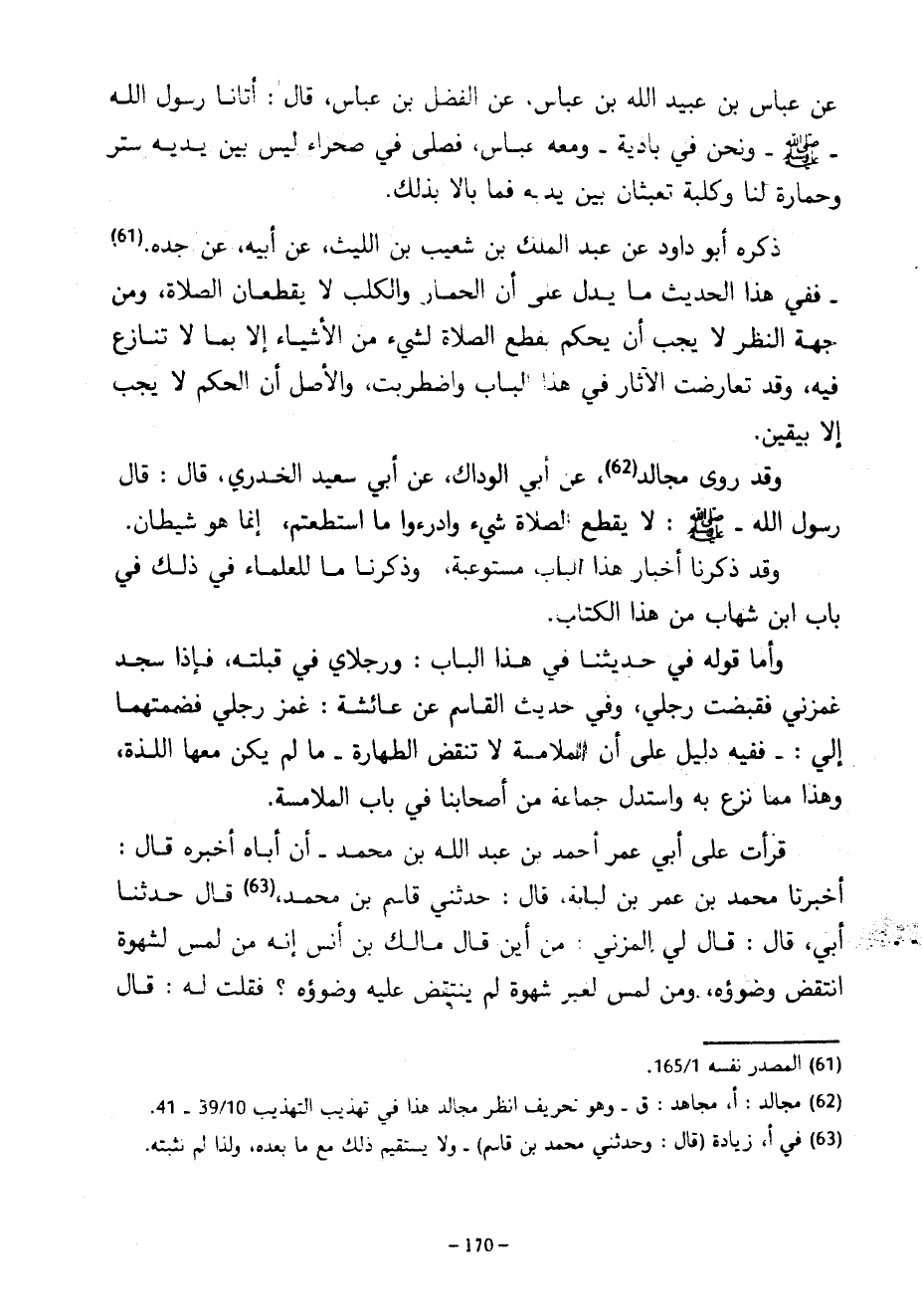 عَنْ عَبَّاسِ بْنِ عُبَيْدِ اللَّهِ بْنِ عَبَّاسٍ عَنِ الْفَضْلِ بْنِ عَبَّاسٍ قَالَ أَتَانَا رَسُولُ اللَّهِ صَلَّى اللَّهُ عَلَيْهِ وَسَلَّمَ وَنَحْنُ فِي بَادِيَةٍ وَمَعَهُ عَبَّاسٌ فَصَلَّى فِي صَحْرَاءَ لَيْسَ بَيْنَ يَدَيْهِ سِتْرٌ وَحِمَارَةٌ لَنَا وَكَلْبَةٌ تَعْبَثَانِ بَيْنَ يَدَيْهِ فَمَا بَالَا بِذَلِكَ ذَكَرَهُ أَبُو دَاوُدَ عَنْ عَبْدِ الْمَلِكِ بْنِ شُعَيْبِ بْنِ اللَّيْثِ عَنْ أَبِيهِ عَنْ جَدِّهِ فَفِي هَذَا الْحَدِيثِ مَا يَدُلُّ عَلَى أَنَّ الْحِمَارَ وَالْكَلْبَ لَا يَقْطَعَانِ الصَّلَاةَ وَمِنْ جِهَةِ النَّظَرِ لَا يَجِبُ أَنْ يَحْكُمَ بِقَطْعِ الصَّلَاةِ لِشَيْءٍ مِنَ الْأَشْيَاءِ إِلَّا بِمَا لَا تَنَازُعَ فِيهِ وَقَدْ تَعَارَضَتِ الْآثَارُ فِي هَذَا الْبَابِ وَاضْطَرَبَتْ وَالْأَصْلُ أَنَّ الْحُكْمَ لَا يَجِبُ إِلَّا بِيَقِينٍ وَقَدْ رَوَى مُجَالِدٍ عَنْ أَبِي الْوَدَّاكِ عَنْ أَبِي سَعِيدٍ الْخُدْرِيِّ قَالَ قَالَ رَسُولُ اللَّهِ صَلَّى اللَّهُ عَلَيْهِ وَسَلَّمَ لَا يَقْطَعُ الصَّلَاةَ شَيْءٌ وَادْرَءُوا ما استطعتم إنماهو شَيْطَانٌ وَقَدْ ذَكَرْنَا أَخْبَارَ هَذَا الْبَابِ مُسْتَوْعَبَةً وَذَكَرْنَا مَا لِلْعُلَمَاءِ فِي ذَلِكَ فِي بَابِ ابْنِ شِهَابٍ مِنْ هَذَا الْكِتَابِ وَأَمَّا قَوْلُهُ فِي حَدِيثِنَا فِي هَذَا الْبَابِ وَرِجْلَايَ فِي قِبْلَتِهِ فَإِذَا سَجَدَ غَمَزَنِي فَقَبَضْتُ رِجْلَيَّ وَفِي حَدِيثِ الْقَاسِمِ عَنْ عَائِشَةَ غَمَزَ رِجْلَيَّ فَضَمَمْتُهُمَا إِلَيَّ فَفِيهِ دَلِيلٌ عَلَى أَنَّ الْمُلَامَسَةَ لَا تَنْقُضُ الطَّهَارَةَ مَا لَمْ يَكُنْ مَعَهَا اللَّذَّةُ وَهَذَا مِمَّا نَزَعَ بِهِ وَاسْتَدَلَّ جَمَاعَةٌ مِنْ أَصْحَابِنَا فِي بَابِ الْمُلَامَسَةِ قَرَأْتُ عَلَى أَبِي عُمَرَ أَحْمَدَ بْنَ عَبْدِ اللَّهِ بْنِ مُحَمَّدٍ أَنَّ أَبَاهُ أَخْبَرَهُ قَالَ أَخْبَرَنَا مُحَمَّدُ بْنُ عُمَرَ بْنِ لُبَابَةَ قَالَ حَدَّثَنِي قَاسِمُ بْنُ مُحَمَّدٍ قَالَ حَدَّثَنَا أَبِي قَالَ قَالَ لِي الْمُزَنِيُّ مَنْ أَيْنَ قَالَ مَالِكُ بْنُ أَنَسٍ إنه من لمس لشهوة انتقض وضوؤه وَمَنْ لَمَسَ لِغَيْرِ شَهْوَةٍ لَمْ يَنْتَقِضْ عَلَيْهِ وضوؤه فَقُلْتُ لَهُ قَالَ