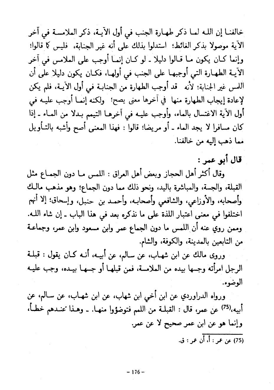 خَالَفْنَا إِنَّ اللَّهَ لَمَّا ذَكَرَ طَهَارَةَ الْجَنُبِ فِي أَوَّلِ الْآيَةِ ذَكَرَ الْمُلَامَسَةَ فِي آخِرِ الْآيَةِ مَوْصُولًا بِذِكْرِ الْغَائِطِ اسْتَدَلُّوا بِذَلِكَ عَلَى أَنَّهُ غَيْرُ الْجَنَابَةِ فَلَيْسَ كَمَا قَالُوا وَإِنَّمَا كَانَ يَكُونُ مَا قَالُوا دَلِيلًا لَوْ كَانَ إِنَّمَا أَوْجَبَ عَلَى الْمُلَامِسِ فِي آخِرِ الْآيَةِ الطَّهَارَةَ الَّتِي أَوْجَبَهَا عَلَى الْجُنُبِ فِي أَوَّلِهَا فَكَانَ يَكُونُ دَلِيلًا عَلَى أَنَّ اللَّمْسَ غَيْرَ الْجَنَابَةِ لِأَنَّهُ قَدْ أَوْجَبَ الطَّهَارَةَ مِنَ الْجَنَابَةِ فِي أَوَّلِ الْآيَةِ فَلَمْ يَكُنْ لِإِعَادَةِ إِيجَابِ الطَّهَارَةِ مِنْهَا فِي آخِرِهَا مَعْنًى يَصِحُّ وَلَكِنَّهُ إِنَّمَا أَوْجَبَ عَلَيْهِ فِي أَوَّلِ الْآيَةِ الِاغْتِسَالَ بِالْمَاءِ وَأَوْجَبَ عَلَيْهِ فِي آخِرِهَا التَّيَمُّمَ بَدَلًا مِنَ الْمَاءِ إِذَا كَانَ مُسَافِرًا لَا يَجِدُ الْمَاءَ أَوْ مَرِيضًا قَالُوا فَهَذَا الْمَعْنَى أَصَحُّ وَأَشْبَهُ بِالتَّأْوِيلِ مِمَّا ذَهَبَ إِلَيْهِ مَنْ خَالَفْنَا قَالَ أَبُو عُمَرَ وَقَالَ أَكْثَرُ أَهْلِ الْحِجَازِ وَبَعْضُ أَهْلِ الْعِرَاقِ اللَّمْسُ مَا دُونَ الْجِمَاعِ مِثْلُ الْقُبْلَةِ وَالْجَسَّةِ وَالْمُبَاشَرَةِ بِالْيَدِ وَنَحْوِ ذَلِكَ مِمَّا دُونَ الْجِمَاعِ وَهُوَ مَذْهَبُ مَالِكٍ وَأَصْحَابِهِ وَالْأَوْزَاعِيِّ وَالشَّافِعِيِّ وَأَصْحَابِهِ وَأَحْمَدَ بْنِ حَنْبَلٍ وَإِسْحَاقَ إِلَّا أَنَّهُمُ اخْتَلَفُوا فِي مَعْنَى اعْتِبَارِ اللَّذَّةِ عَلَى مَا نَذْكُرُهُ بَعْدُ فِي هَذَا الْبَابِ إِنْ شَاءَ اللَّهُ وَمِمَّنْ رُوِيَ عَنْهُ أَنَّ اللَّمْسَ مَا دُونَ الْجِمَاعِ عُمَرُ وَابْنُ مَسْعُودٍ وَابْنُ عُمَرَ وَجَمَاعَةٌ مِنَ التَّابِعِينَ بِالْمَدِينَةِ وَالْكُوفَةِ وَالشَّامِ وَرَوَى مَالِكٌ عَنِ ابْنِ شِهَابٍ عَنْ سَالِمٍ عَنْ أَبِيهِ أَنَّهُ كَانَ يَقُولُ قُبْلَةُ الرَّجُلِ امْرَأَتَهُ وَجَسُّهَا بِيَدِهِ مِنَ الْمُلَامَسَةِ فَمَنْ قَبَّلَهَا أَوْ جَسَّهَا بِيَدِهِ وَجَبَ عَلَيْهِ الْوُضُوءُ وَرَوَاهُ الدَّرَاوَرْدِيُّ عَنِ ابْنِ أَخِي ابْنِ شِهَابٍ عَنِ ابْنِ شِهَابٍ عَنْ سَالِمٍ عَنْ أَبِيهِ عن عمر قال القبلة من اللمم فتوضؤوا مِنْهَا وَهَذَا عِنْدَهُمْ خَطَأٌ وَإِنَّمَا هُوَ عَنِ ابْنِ عُمَرَ صَحِيحٌ لَا عَنْ عُمَرَ