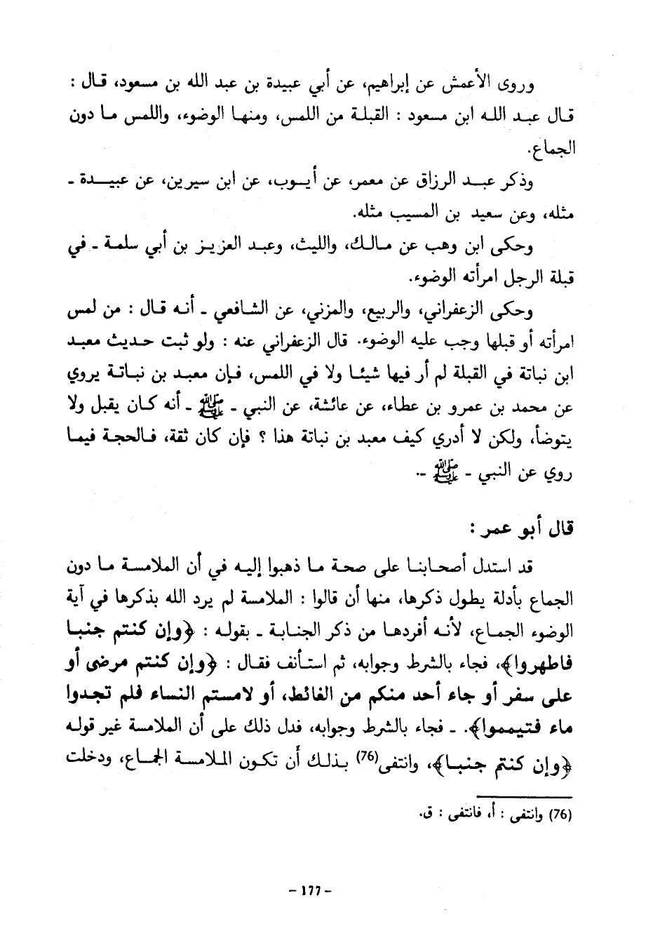 وَرَوَى الْأَعْمَشُ عَنْ إِبْرَاهِيمَ عَنْ أَبِي عُبَيْدَةَ بْنِ عَبْدِ اللَّهِ بْنِ مَسْعُودٍ قَالَ قَالَ عبد الله ابن مَسْعُودٍ الْقُبْلَةُ مِنَ اللَّمْسِ وَمِنْهَا الْوُضُوءُ وَاللَّمْسُ مَا دُونَ الْجِمَاعِ وَذَكَرَ عَبْدُ الرَّزَّاقِ عَنْ مَعْمَرٍ عَنْ أَيُّوبَ عَنْ ابْنِ سِيرِينَ عَنْ عَبِيدَةَ مِثْلَهُ وَعَنْ سَعِيدِ بْنِ الْمُسَيَّبِ مِثْلَهُ وَحَكَى ابْنُ وَهْبٍ عَنْ مَالِكٍ وَاللَّيْثِ وَعَبْدِ الْعَزِيزِ بْنِ أَبِي سَلَمَةَ فِي قُبْلَةِ الرَّجُلِ امْرَأَتَهُ الْوُضُوءُ وَحَكَى الزَّعْفَرَانِيُّ وَالرَّبِيعُ وَالْمُزَنِيُّ عَنِ الشَّافِعِيِّ أَنَّهُ قَالَ مَنْ لَمَسَ امْرَأَتَهُ أَوْ قَبَّلَهَا وَجَبَ عَلَيْهِ الْوُضُوءُ قَالَ الزَّعْفَرَانِيُّ عَنْهُ ولو ثبت حديث معبد ابن نُبَاتَةَ فِي الْقُبْلَةِ لَمْ أَرَ فِيهَا شَيْئًا وَلَا فِي اللَّمْسِ فَإِنَّ مَعْبَدَ بْنَ نُبَاتَةَ يَرْوِي عَنْ مُحَمَّدِ بْنِ عَمْرِو بْنِ عَطَاءٍ عَنِ عَائِشَةَ عَنِ النَّبِيِّ صَلَّى اللَّهُ عَلَيْهِ وَسَلَّمَ أَنَّهُ كَانَ يُقَبِّلُ وَلَا يَتَوَضَّأُ وَلَكِنْ لَا أَدْرِي كَيْفَ مَعْبَدُ بْنُ نُبَاتَةَ هَذَا فَإِنْ كَانَ ثِقَةً فَالْحُجَّةُ فِيمَا رُوِيَ عَنِ النَّبِيِّ صَلَّى اللَّهُ عَلَيْهِ وَسَلَّمَ قَالَ أَبُو عُمَرَ قَدِ اسْتَدَلَّ أَصْحَابُنَا عَلَى صِحَّةِ مَا ذَهَبُوا إِلَيْهِ فِي أَنَّ الْمُلَامَسَةَ مَا دُونَ الْجِمَاعِ بِأَدِلَّةٍ يُطُولُ ذِكْرُهَا مِنْهَا أَنْ قَالُوا الْمُلَامَسَةُ لَمْ يُرِدِ اللَّهُ بِذِكْرِهَا فِي آيَةِ الْوُضُوءِ الْجِمَاعَ لِأَنَّهُ أَفْرَدَهَا مِنْ ذِكْرِ الْجَنَابَةِ بِقَوْلِهِ وَإِنْ كُنْتُمْ جُنُبًا فَاطَّهَّرُوا فَجَاءَ بِالشَّرْطِ وَجَوَابِهِ ثُمَّ اسْتَأْنَفَ فَقَالَ وَإِنْ كُنْتُمْ مَرْضَى أَوْ عَلَى سَفَرٍ أَوْ جَاءَ أَحَدٌ مِنْكُمْ مِنَ الْغَائِطِ أَوْ لَامَسْتُمُ النِّسَاءَ فَلَمْ تَجِدُوا مَاءً فَتَيَمَّمُوا فَجَاءَ بِالشَّرْطِ وَجَوَابِهِ فَدَلَّ ذَلِكَ على أن الملامسة غير قَوْلَهُ وَإِنْ كُنْتُمْ جُنُبًا وَانْتَفَى بِذَلِكَ أَنْ تَكُونَ الْمُلَامَسَةُ الْجِمَاعَ وَدَخَلَتْ