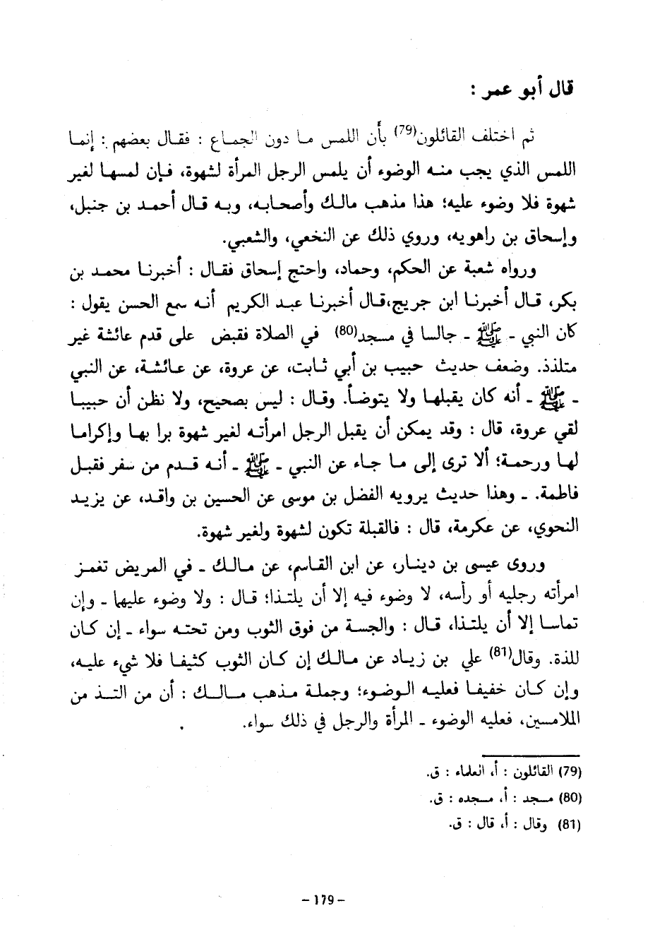 قَالَ أَبُو عُمَرَ ثُمَّ اخْتَلَفَ الْقَائِلُونَ بِأَنَّ اللَّمْسَ مَا دُونَ الْجِمَاعِ فَقَالَ بَعْضُهُمْ إِنَّمَا اللَّمْسُ الَّذِي يَجِبُ مِنْهُ الْوُضُوءُ أَنْ يَلْمِسَ الرَّجُلُ الْمَرْأَةَ لِشَهْوَةٍ فَإِنْ لَمَسَهَا لِغَيْرِ شَهْوَةٍ فَلَا وُضُوءَ عَلَيْهِ هَذَا مَذْهَبُ مَالِكٍ وَأَصْحَابِهِ وَبِهِ قَالَ أَحْمَدُ بْنُ حَنْبَلٍ وَإِسْحَاقُ بْنُ رَاهَوَيْهِ وَرُوِيَ ذَلِكَ عَنِ النَّخَعِيِّ وَالشَّعْبِيِّ وَرَوَاهُ شُعْبَةُ عَنِ الْحَكَمِ وَحَمَّادٍ وَاحْتَجَّ إِسْحَاقُ فَقَالَ أَخْبَرَنَا مُحَمَّدُ بْنُ بَكْرٍ قَالَ أَخْبَرَنَا ابْنُ جُرَيْجٍ قَالَ أَخْبَرَنَا عَبْدُ الْكَرِيمِ أَنَّهُ سَمِعَ الْحَسَنَ يَقُولُ كَانَ النَّبِيُّ صَلَّى اللَّهُ عَلَيْهِ وَسَلَّمَ جَالِسًا فِي مَسْجِدٍ فِي الصَّلَاةِ فَقَبَضَ عَلَى قَدَمِ عَائِشَةَ غَيْرَ مُتَلَذِّذٍ وَضَعَّفَ حَدِيثَ حَبِيبِ بْنِ أَبِي ثَابِتٍ عَنْ عُرْوَةَ عَنْ عَائِشَةَ عَنِ النَّبِيِّ صَلَّى اللَّهُ عَلَيْهِ وَسَلَّمَ أَنَّهُ كَانَ يُقَبِّلُهَا وَلَا يَتَوَضَّأُ وَقَالَ لَيْسَ بِصَحِيحٍ وَلَا نَظُنُّ أَنَّ حَبِيبًا لَقِيَ عُرْوَةَ قال وقد يكن أَنْ يُقْبِّلَ الرَّجُلُ امْرَأَتَهُ لِغَيْرِ شَهْوَةٍ بِرًّا بها وإكراما لها ورحمة أَلَا تَرَى إِلَى مَا جَاءَ عَنِ النَّبِيِّ صَلَّى اللَّهُ عَلَيْهِ وَسَلَّمَ أَنَّهُ قَدِمَ مِنْ سَفَرٍ فَقَبَّلَ فَاطِمَةَ وَهَذَا حَدِيثٌ يَرْوِيهِ الْفَضْلُ بْنُ مُوسَى عَنِ الْحُسَيْنِ بْنِ وَاقِدٍ عَنْ يَزِيدَ النَّحْوِيِّ عَنْ عِكْرِمَةَ قَالَ فَالْقُبْلَةُ تَكُونُ لِشَهْوَةٍ وَلِغَيْرِ شَهْوَةٍ وَرَوَى عِيسَى بْنُ دِينَارٍ عَنِ ابْنِ الْقَاسِمِ عَنْ مَالِكٍ فِي الْمَرِيضِ تَغْمِزُ امْرَأَتُهُ رِجْلَيْهِ أَوْ رَأْسَهُ لَا وُضُوءَ فِيهِ إِلَّا أَنْ يَلْتَذَّا قَالَ وَلَا وُضُوءَ عَلَيْهِمَا وَإِنْ تَمَاسًّا إِلَّا أَنْ يَلْتَذَّا قَالَ وَالْجَسَّةُ مِنْ فَوْقِ الثَّوْبِ وَمِنْ تَحْتِهِ سَوَاءٌ إِنْ كَانَ لِلَذَّةٍ وَقَالَ عَلِيُّ بْنُ زِيَادٍ عَنْ مَالِكٍ إِنْ كَانَ الثَّوْبُ كَثِيفًا فَلَا شَيْءَ عَلَيْهِ وَإِنْ كَانَ خَفِيفًا فَعَلَيْهِ الْوُضُوءُ وَجُمْلَةُ مَذْهَبِ مَالِكٍ أَنَّ مَنِ الْتَذَّ مِنَ الْمُلَامِسَيْنِ فَعَلَيْهِ الْوُضُوءُ الْمَرْأَةُ وَالرَّجُلُ فِي ذَلِكَ سواء