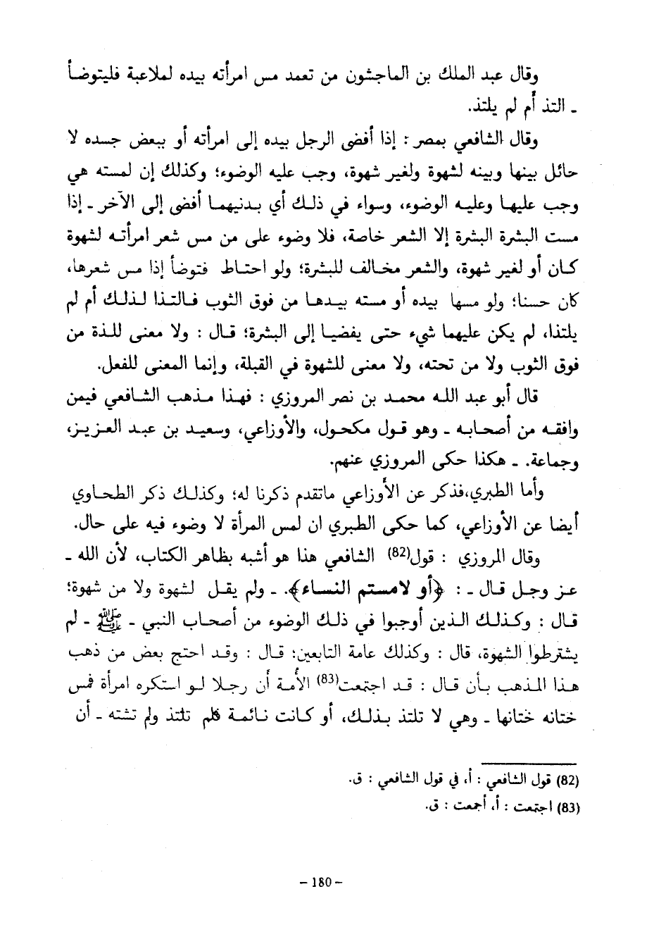 وَقَالَ عَبْدُ الْمَلِكِ بْنُ الْمَاجِشُونَ مَنْ تَعَمَّدَ مَسَّ امْرَأَتِهِ بِيَدِهِ لِمُلَاعَبَةٍ فَلْيَتَوَضَّأِ الْتَذَّ أَمْ لَمْ يَلْتَذَّ وَقَالَ الشَّافِعِيُّ بِمِصْرَ إِذَا أَفْضَى الرَّجُلُ بِيَدِهِ إِلَى امْرَأَتِهِ أَوْ بِبَعْضِ جَسَدِهِ لَا حَائِلَ بَيْنَهَا وَبَيْنَهُ لِشَهْوَةٍ وَلِغَيْرِ شَهْوَةٍ وَجَبَ عَلَيْهِ الْوُضُوءُ وَكَذَلِكَ إِنْ لَمَسَتْهُ هِيَ وَجَبَ عَلَيْهَا وَعَلَيْهِ الْوُضُوءُ وَسَوَاءٌ فِي ذَلِكَ أَيُّ بِدَنَيْهِمَا أَفْضَى إِلَى الْآخَرِ إِذَا مَسَّتِ الْبَشَرَةُ الْبَشَرَةَ إِلَّا الشَّعْرَ خَاصَّةً فَلَا وُضُوءَ عَلَى مَنْ مَسَّ شَعْرَ امْرَأَتِهِ لِشَهْوَةٍ كَانَ أو لغير شهوة والشعر مخالف للبشر وَلَوِ احْتَاطَ فَتَوَضَّأَ إِذَا مَسَّ شَعْرَهَا كَانَ حَسَنًا وَلَوْ مَسَّهَا بِيَدِهِ أَوْ مَسَّتْهُ بِيَدِهَا من فوق الثوب فالتذا لذلك أم لا يَلْتَذَّا لَمْ يَكُنْ عَلَيْهِمَا شَيْءٌ حَتَّى يُفْضِيَا إِلَى الْبَشَرَةِ قَالَ وَلَا مَعْنَى لِلَذَّةٍ مِنْ فَوْقِ الثَّوْبِ وَلَا مِنْ تَحْتِهِ وَلَا مَعْنَى لِلشَّهْوَةِ فِي الْقُبْلَةِ وَإِنَّمَا الْمَعْنَى لِلْفِعْلِ قَالَ أَبُو عَبْدِ اللَّهِ مُحَمَّدُ بْنُ نَصْرٍ الْمَرْوَزِيُّ فَهَذَا مَذْهَبُ الشَّافِعِيِّ فِيمَنْ وَافَقَهُ مِنْ أَصْحَابِهِ وَهُوَ قَوْلُ مَكْحُولٍ وَالْأَوْزَاعِيِّ وَسَعِيدِ بْنِ عَبْدِ الْعَزِيزِ وَجَمَاعَةٌ هَكَذَا حَكَى الْمَرَوَزِيُّ عَنْهُمْ وَأَمَّا الطَّبَرِيُّ فَذَكَرَ عَنِ الْأَوْزَاعِيِّ مَا تَقَدَّمَ ذِكْرُنَا لَهُ وَكَذَلِكَ ذَكَرَ الطَّحَاوِيُّ أَيْضًا عَنِ الْأَوْزَاعِيِّ كَمَا حَكَى الطَّبَرِيُّ أَنَّ لَمْسَ الْمَرْأَةِ لَا وُضُوءَ فِيهِ عَلَى حَالٍ وَقَالَ الْمَرْوَزِيُّ قَوْلُ الشَّافِعِيِّ هَذَا هُوَ أَشْبَهُ بِظَاهِرِ الْكِتَابِ لِأَنَّ اللَّهَ عَزَّ وَجَلَّ قَالَ أَوْ لَامَسْتُمُ النِّسَاءَ وَلَمْ يَقُلْ لِشَهْوَةٍ وَلَا مِنْ شَهْوَةٍ قَالَ وَكَذَلِكَ الَّذِينَ أَوْجَبُوا فِي ذَلِكَ الْوُضُوءَ مِنْ أَصْحَابِ النَّبِيِّ صَلَّى اللَّهُ عَلَيْهِ وَسَلَّمَ لَمْ يَشْتَرِطُوا الشَّهْوَةَ قَالَ وَكَذَلِكَ عَامَّةُ التَّابِعِينَ قَالَ وَقَدِ احْتَجَّ بَعْضُ مَنْ ذَهَبَ هَذَا الْمَذْهَبَ بِأَنْ قَالَ قَدِ اجْتَمَعَتِ الْأُمَّةُ أَنَّ رَجُلًا لَوِ اسْتَكْرَهَ امْرَأَةً فَمَسَّ خِتَانُهُ خِتَانَهَا وَهِيَ لَا تَلْتَذُّ بِذَلِكَ أَوْ كَانَتْ نَائِمَةً فَلَمْ تَلْتَذَّ وَلَمْ تَشْتَهِ أَنَّ