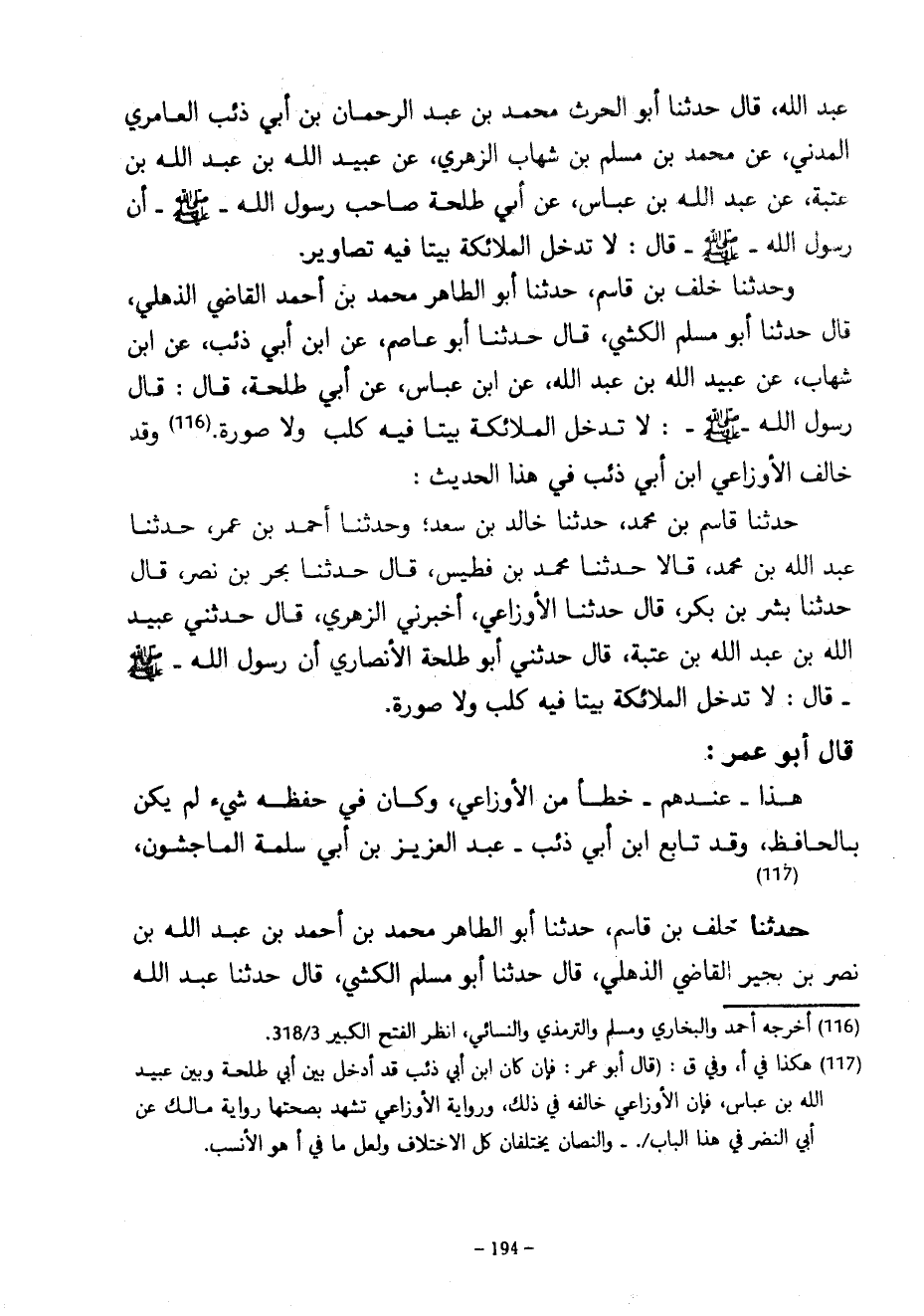 عبد الله قال حدثنا أبو الحرث محمد بن عبد الرحمان بْنِ أَبِي ذِئْبٍ الْعَامِرِيُّ الْمَدَنِيُّ عَنْ مُحَمَّدِ بْنِ مُسْلِمِ بْنِ شِهَابٍ الزُّهْرِيِّ عَنْ عُبَيْدِ اللَّهِ بْنِ عَبْدِ اللَّهِ بْنِ عُتْبَةَ عَنْ عَبْدِ اللَّهِ بْنِ عَبَّاسٍ عَنْ أَبِي طَلْحَةَ صَاحِبِ رَسُولِ اللَّهِ صَلَّى اللَّهُ عَلَيْهِ وَسَلَّمَ أن رسول الله صلى الله عليه وسلم قَالَ لَا تَدْخُلُ الْمَلَائِكَةُ بَيْتًا فِيهِ تَصَاوِيرُ وَحَدَّثَنَا خَلَفُ بْنُ قَاسِمٍ حَدَّثَنَا أَبُو الطَّاهِرِ مُحَمَّدُ بْنُ أَحْمَدَ الْقَاضِي الذُّهْلِيُّ قَالَ حَدَّثَنَا أَبُو مُسْلِمٍ الْكَشِّيُّ قَالَ حَدَّثَنَا أَبُو عَاصِمٍ عَنِ ابْنِ أَبِي ذِئْبٍ عَنِ ابْنِ شِهَابٍ عَنِ عُبَيْدِ اللَّهِ بْنِ عَبْدِ اللَّهِ عَنِ ابْنِ عَبَّاسٍ عَنْ أَبِي طَلْحَةَ قَالَ قَالَ رَسُولُ اللَّهِ صَلَّى اللَّهُ عَلَيْهِ وَسَلَّمَ لَا تَدْخُلُ الْمَلَائِكَةُ بَيْتًا فِيهِ كَلْبٌ وَلَا صُورَةٌ وَقَدْ خَالَفَ الْأَوْزَاعِيُّ ابْنَ أَبِي ذِئْبٍ فِي هَذَا الْحَدِيثِ حَدَّثَنَا قَاسِمُ بْنُ مُحَمَّدٍ حَدَّثَنَا خَالِدُ بْنُ سَعْدٍ وَحَدَّثَنَا أَحْمَدُ بْنُ عُمَرَ حَدَّثَنَا عَبْدُ اللَّهِ بْنُ مُحَمَّدٍ قَالَا حَدَّثَنَا مُحَمَّدُ بْنُ فُطَيْسٍ قَالَ حَدَّثَنَا بَحْرُ بْنُ نَصْرٍ قَالَ حَدَّثَنَا بِشْرُ بْنُ بَكْرٍ قَالَ حَدَّثَنَا الْأَوْزَاعِيُّ أَخْبَرَنِي الزُّهُرِيِّ قَالَ حَدَّثَنِي عُبَيْدُ اللَّهِ بْنُ عَبْدِ اللَّهِ بْنِ عُتْبَةَ قَالَ حَدَّثَنِي أَبُو طَلْحَةَ الْأَنْصَارِيِّ أَنَّ رَسُولَ اللَّهِ صَلَّى اللَّهُ عَلَيْهِ وَسَلَّمَ قَالَ لَا تَدْخُلُ الْمَلَائِكَةُ بَيْتًا فِيهِ كَلْبٌ وَلَا صُورَةٌ قَالَ أَبُو عُمَرَ هَذَا عِنْدَهُمْ خَطَأٌ مِنَ الْأَوْزَاعِيِّ وَكَانَ فِي حِفْظِهِ شَيْءٌ لَمْ يَكُنْ بِالْحَافِظِ وَقَدْ تَابَعَ ابْنَ أَبِي ذِئْبٍ عَبْدُ الْعَزِيزِ بْنُ أبي سلمة الماجسون حَدَّثَنَا خَلَفُ بْنُ قَاسِمٍ حَدَّثَنَا أَبُو الطَّاهِرِ مُحَمَّدَ بْنَ أَحْمَدَ بْنِ عَبْدِ اللَّهِ بْنِ نَصْرِ بْنِ بُجَيْرٍ الْقَاضِي الذُّهْلِيُّ قَالَ حَدَّثَنَا أَبُو مُسْلِمٍ الْكَشِّيُّ قَالَ حَدَّثَنَا عَبْدُ اللَّهِ
