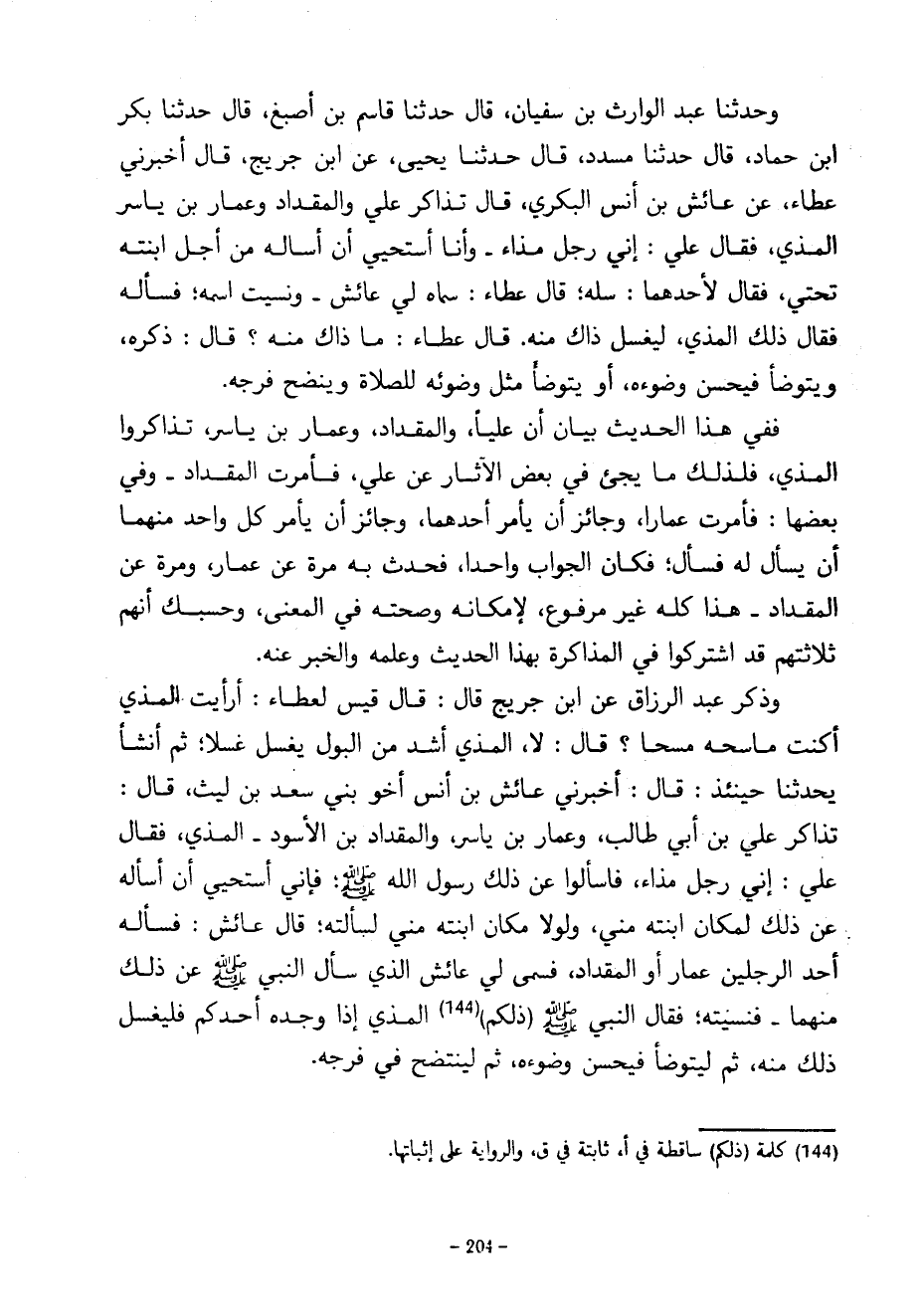 وَحَدَّثَنَا عَبْدُ الْوَارِثِ بْنُ سُفْيَانَ قَالَ حَدَّثَنَا قاسم بن أصبغ قال حدثنا بكر ابن حَمَّادٍ قَالَ حَدَّثَنَا مُسَدَّدٌ قَالَ حَدَّثَنَا يَحْيَى عَنِ ابْنِ جُرَيْجٍ قَالَ أَخْبَرَنِي عَطَاءٌ عَنِ عَائِشِ بْنِ أَنَسٍ الْبَكْرِيِّ قَالَ تَذَاكَرَ عَلِيٌّ وَالْمِقْدَادُ وَعَمَّارُ بْنُ يَاسِرٍ الْمَذْيَ فَقَالَ عَلِيٌّ إِنِّي رَجُلٌ مَذَّاءٌ وَأَنَا أَسْتَحْيِي أَنْ أَسْأَلَهُ مِنْ أَجْلِ ابْنَتِهِ تَحْتِي فَقَالَ لِأَحَدِهِمَا سَلْهُ قَالَ عَطَاءٌ سَمَّاهُ لِي عَائِشٌ وَنَسِيتُ اسْمَهُ فَسَأَلَهُ فَقَالَ ذَلِكَ الْمَذْيُ لِيَغْسِلْ ذَاكَ مِنْهُ قَالَ عَطَاءٌ مَا ذَاكَ مِنْهُ قَالَ ذَكَرُهُ وَيَتَوَضَّأْ فَيُحْسِنْ وَضَوْءَهُ أَوْ يَتَوَضَّأْ مِثْلَ وُضُوئِهِ لِلصَّلَاةِ وَيَنْضَحْ فَرْجَهُ فَفِي هَذَا الْحَدِيثِ بَيَانٌ أَنَّ عَلِيًّا وَالْمِقْدَادَ وَعَمَّارَ بْنَ يَاسِرٍ تَذَاكَرُوا الْمَذْيَ فَلِذَلِكَ مَا يَجِيءُ فِي بَعْضِ الْآثَارِ عَنْ عَلِيٍّ فَأَمَرْتُ الْمِقْدَادَ وَفِي بَعْضِهَا فَأَمَرْتُ عَمَّارًا وَجَائِزٌ أَنْ يَأْمُرَ أَحَدَهُمَا وَجَائِزٌ أَنْ يَأْمُرَ كُلَّ وَاحِدٍ مِنْهُمَا أَنْ يَسْأَلَ لَهُ فَسَأَلَ فَكَانَ الْجَوَابُ وَاحِدًا فَحَدَّثَ بِهِ مَرَّةً عَنْ عَمَّارٍ وَمَرَّةً عَنِ الْمِقْدَادِ هَذَا كُلُّهُ غير مَرْفُوعٌ لِإِمْكَانِهِ وَصِحَّتِهِ فِي الْمَعْنَى وَحَسْبُكَ أَنَّهُمْ ثَلَاثَتَهُمْ قَدِ اشْتَرَكُوا فِي الْمُذَاكَرَةِ بِهَذَا الْحَدِيثِ وَعِلْمِهِ وَالْخَبَرِ عَنْهُ وَذَكَرَ عَبْدُ الرَّزَّاقِ عَنِ ابْنِ جُرَيْجٍ قَالَ قَالَ قَيْسٌ لِعَطَاءٍ أَرَأَيْتَ الْمَذْيَ أَكُنْتَ مَاسِحَهُ مَسْحًا قَالَ لَا الْمَذْيُ أَشَدُّ مِنَ الْبَوْلِ يُغْسَلُ غَسْلًا ثُمَّ أَنْشَأَ يُحَدِّثُنَا حِينَئِذٍ قَالَ أَخْبَرَنِي عَائِشُ بْنُ أَنَسٍ أَخُو بَنِي سَعْدِ بْنِ لَيْثٍ قَالَ تَذَاكَرَ عَلِيُّ بْنُ أَبِي طَالِبٍ وَعَمَّارُ بْنُ يَاسِرٍ وَالْمِقْدَادُ بْنُ الْأَسْوَدِ الْمَذْيَ فَقَالَ عَلِيٌّ إِنِّي رَجُلٌ مَذَّاءٌ فَاسْأَلُوا عَنْ ذَلِكَ رَسُولَ اللَّهِ صَلَّى اللَّهُ عَلَيْهِ وَسَلَّمَ فإن اسْتَحْيِي أَنْ أَسْأَلَهُ عَنْ ذَلِكَ لِمَكَانِ ابْنَتِهِ مِنِّي وَلَوْلَا مَكَانُ ابْنَتِهِ مِنِّي لَسَأَلْتُهُ قَالَ عائش فسألته أَحَدُ الرَّجُلَيْنِ عَمَّارٌ أَوِ الْمِقْدَادُ فَسَمَّى لِي عَائِشٌ الَّذِي سَأَلَ النَّبِيَّ صَلَّى اللَّهُ عَلَيْهِ وَسَلَّمَ عَنْ ذَلِكَ مِنْهُمَا فَنَسِيتُهُ فَقَالَ النَّبِيُّ صَلَّى اللَّهُ عَلَيْهِ وَسَلَّمَ (ذَلِكُمُ) الْمَذْيُ إِذَا وَجَدَهُ أَحَدُكُمْ فَلْيَغْسِلْ ذَلِكَ مِنْهُ ثُمَّ لِيَتَوَضَّأْ فَيُحْسِنُ وَضَوْءَهُ ثُمَّ لِيَنْتَضِحْ فِي فَرْجِهِ