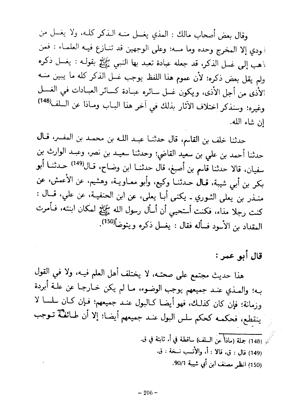 وَقَالَ بَعْضُ أَصْحَابِ مَالِكٍ الْمَذْيُ يُغْسَلُ مِنْهُ الذَّكَرُ كُلُّهُ وَلَا يُغَسَلُ مِنَ الْوَدْيِ إِلَّا الْمَخْرِجُ وَحْدَهُ وَمَا مَسَّهُ وَعَلَى الْوَجْهَيْنِ قَدْ تَنَازَعَ فِيهِ الْعُلَمَاءُ فَمَنْ ذَهَبَ إِلَى غَسْلِ الذَّكَرِ قَدْ جَعَلَهُ عِبَادَةً تَعْبَدَ بِهَا النَّبِيُّ صَلَّى اللَّهُ عَلَيْهِ وَسَلَّمَ بِقَوْلِهِ يَغْسِلُ ذَكَرَهُ وَلَمْ يَقُلْ بَعْضَ ذَكَرِهِ لِأَنَّ عُمُومَ هَذَا اللَّفْظِ يُوجِبُ غَسْلَ الذَّكَرِ كُلِّهِ مَا يَبِينُ منه الأذى من أجل الذى وَيَكُونُ غَسْلُ سَائِرِهِ عِبَادَةً كَسَائِرِ الْعِبَادَاتِ فِي الْغُسْلِ وَغَيْرِهِ وَسَنَذْكُرُ اخْتِلَافَ الْآثَارِ بِذَلِكَ فِي آخِرِ هَذَا الْبَابِ وَمَاذَا عَنِ السَّلَفِ إِنْ شَاءَ اللَّهُ حَدَّثَنَا خَلَفُ بْنُ الْقَاسِمِ قَالَ حَدَّثَنَا عَبْدُ اللَّهِ بْنُ مُحَمَّدِ بْنِ الْمُفَسِّرِ قَالَ حَدَّثَنَا أَحْمَدُ بْنُ عَلِيِّ بْنِ سَعِيدٍ الْقَاضِي وَحَدَّثَنَا سَعِيدُ بْنُ نَصْرٍ وَعَبْدُ الْوَارِثِ بْنُ سُفْيَانَ قَالَا حَدَّثَنَا قَاسِمُ بْنُ أَصْبَغَ قَالَ حَدَّثَنَا ابْنُ وَضَّاحٍ قَالَ حَدَّثَنَا أَبُو بَكْرِ بْنُ أَبِي شَيْبَةَ قَالَ حَدَّثَنَا وَكِيعٌ وَأَبُو مُعَاوِيَةَ وَهُشَيْمٌ عَنِ الْأَعْمَشِ عَنْ مُنْذِرِ بْنِ يَعْلَى الثَّوْرِيِّ يُكَنَّى أَبَا يَعْلَى عَنِ ابْنِ الْحَنَفِيَّةِ عَنْ عَلِيٍّ قَالَ كُنْتُ رَجُلًا مَذَّاءً فَكُنْتُ أَسْتَحْيِي أَنْ أَسْأَلَ رَسُولَ اللَّهِ صَلَّى اللَّهُ عَلَيْهِ وَسَلَّمَ لِمَكَانِ ابْنَتِهِ فَأَمَرْتُ الْمِقْدَادَ بْنَ الْأَسْوَدِ فَسَأَلَهُ فَقَالَ يَغْسِلُ ذَكَرَهُ وَيَتَوَضَّأُ قَالَ أَبُو عُمَرَ هَذَا حَدِيثٌ مُجْتَمَعٌ عَلَى صِحَّتِهِ لَا يَخْتَلِفُ أَهْلُ الْعِلْمِ فِيهِ وَلَا فِي الْقَوْلِ بِهِ وَالْمَذْيُ عِنْدَ جَمِيعِهِمْ يُوجِبُ الْوُضُوءَ مَا لَمْ يَكُنْ خَارِجًا عَنْ عِلَّةِ أَبْرِدَةٍ وَزَمَانَةٍ فَإِنْ كَانَ كَذَلِكَ فَهُوَ أَيْضًا كَالْبَوْلِ عِنْدَ جَمِيعِهِمْ فَإِنْ كَانَ سَلِسًا لَا يَنْقَطِعُ فَحُكْمُهُ كَحُكْمِ سَلَسِ الْبَوْلِ عِنْدَ جَمِيعِهِمْ أَيْضًا إِلَّا أَنَّ طَائِفَةً تُوجِبُ