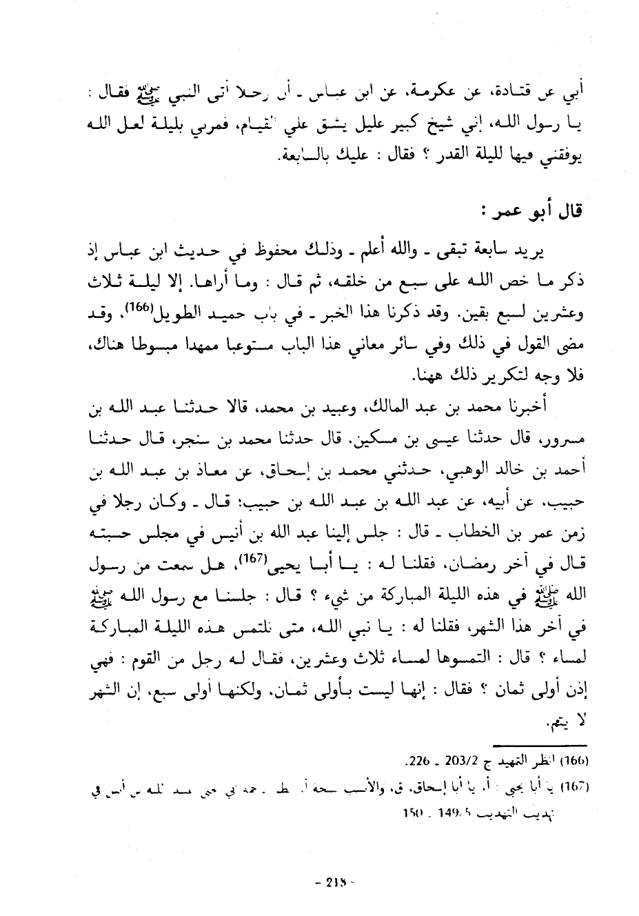 أَبِي عَنْ قَتَادَةَ عَنْ عِكْرِمَةَ عَنِ ابْنِ عَبَّاسٍ أَنَّ رَجُلًا أَتَى النَّبِيَّ صَلَّى اللَّهُ عَلَيْهِ وَسَلَّمَ فَقَالَ يَا رَسُولَ اللَّهِ إِنِّي شَيْخٌ كَبِيرٌ عَلِيلٌ يَشُقُّ عَلَيَّ الْقِيَامُ فَمُرْنِي بِلَيْلَةٍ لَعَلَّ اللَّهَ يُوَفِّقُنِي فِيهَا لِلَيْلَةِ الْقَدْرِ فَقَالَ عَلَيْكَ بِالسَّابِعَةِ قَالَ أَبُو عُمَرَ يُرِيدُ سَابِعَةً تَبْقَى وَاللَّهُ أَعْلَمُ وَذَلِكَ مَحْفُوظٌ فِي حَدِيثِ ابْنِ عَبَّاسٍ إِذْ ذَكَرَ مَا خَصَّ اللَّهُ عَلَى سَبْعٍ مِنْ خَلْقِهِ ثُمَّ قَالَ وَمَا أَرَاهَا إِلَّا لَيْلَةَ ثَلَاثٍ وَعِشْرِينَ لِسَبْعٍ بَقِينَ وَقَدْ ذَكَرْنَا هَذَا الْخَبَرَ فِي بَابِ حُمَيْدٍ الطَّوِيلِ وَقَدْ مَضَى الْقَوْلُ فِي ذَلِكَ وَفِي سَائِرِ مَعَانِي هَذَا الْبَابِ مُسْتَوْعِبًا مُمَهِّدًا مبسوطا هناك فلا وجه لتكرير ذلك ههنا أَخْبَرَنَا مُحَمَّدُ بْنُ عَبْدِ الْمَالِكِ وَعُبَيْدُ بْنُ مُحَمَّدٍ قَالَا حَدَّثَنَا عَبْدُ اللَّهِ بْنُ مَسْرُورٍ قَالَ حَدَّثَنَا عِيسَى بْنُ مِسْكِينٍ قَالَ حَدَّثَنَا مُحَمَّدُ بْنُ سَنْجَرٍ قَالَ حَدَّثَنَا أَحْمَدُ بْنُ خَالِدٍ الْوَهْبِيُّ حَدَّثَنِي مُحَمَّدُ بْنُ إِسْحَاقَ عَنْ مُعَاذِ بْنِ عَبْدِ اللَّهِ بْنِ حَبِيبٍ عَنْ أَبِيهِ عَنْ عَبْدِ اللَّهِ بْنِ عَبْدِ اللَّهِ بْنِ حَبِيبٍ قَالَ وَكَانَ رَجُلًا فِي زَمَنِ عُمَرَ بْنِ الْخَطَّابِ قَالَ جَلَسَ إِلَيْنَا عَبْدُ اللَّهِ بْنُ أُنَيْسٍ فِي مَجْلِسٍ حَسِبْتُهُ قَالَ فِي آخِرِ رَمَضَانَ فَقُلْنَا لَهُ يَا أَبَا يَحْيَى هَلْ سَمِعْتُ مِنْ رَسُولِ اللَّهِ صَلَّى اللَّهُ عَلَيْهِ وَسَلَّمَ فِي هَذِهِ اللَّيْلَةِ الْمُبَارَكَةِ مِنْ شَيْءٍ قَالَ جَلَسْنَا مَعَ رَسُولِ اللَّهِ صَلَّى اللَّهُ عَلَيْهِ وَسَلَّمَ فِي آخِرِ هَذَا الشَّهْرِ فَقُلْنَا لَهُ يَا نَبِيَّ اللَّهِ مَتَى نَلْتَمِسُ هَذِهِ اللَّيْلَةَ الْمُبَارَكَةَ لِمَسَاءٍ قَالَ الْتَمَسُوهَا لِمَسَاءِ ثَلَاثٍ وَعِشْرِينَ فَقَالَ لَهُ رَجُلٌ مِنَ الْقَوْمِ فَهِيَ إِذَنْ أُولَى ثَمَانٍ فَقَالَ إِنَّهَا لَيْسَتْ بِأُولَى ثَمَانٍ وَلَكِنَّهَا أُولَى سَبْعٍ إِنَّ الشَّهْرَ لَا يَتِمُّ