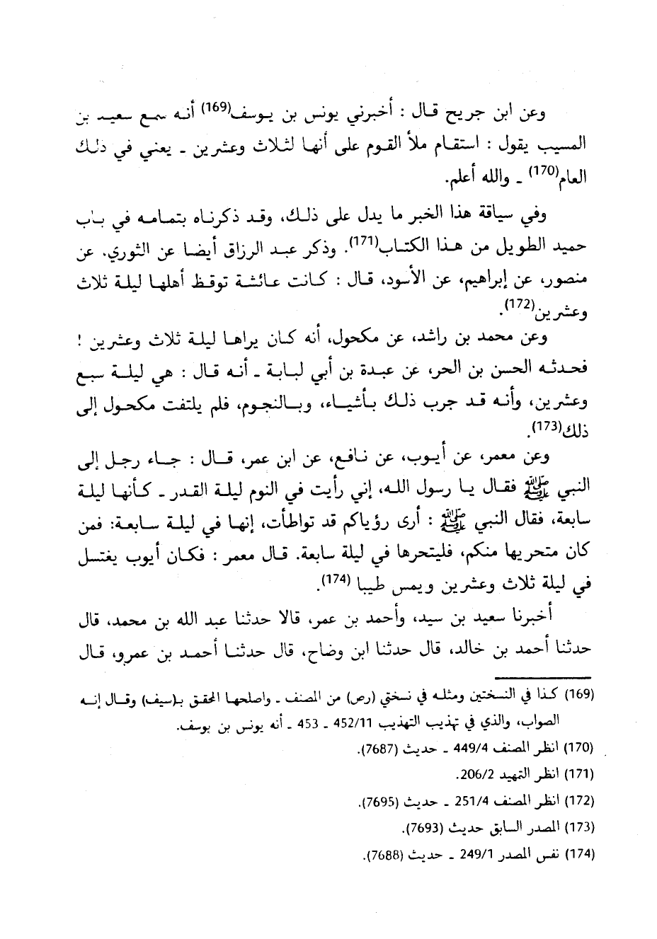 وَعَنِ ابْنُ جُرَيْجٍ قَالَ أَخْبَرَنِي يُونُسُ بْنُ يُوسُفَ أَنَّهُ سَمِعَ سَعِيدَ بْنَ الْمُسَيَّبِ يَقُولُ اسْتَقَامَ مَلَأُ الْقَوْمِ عَلَى أَنَّهَا لِثَلَاثٍ وَعِشْرِينَ يَعْنِي فِي ذَلِكَ الْعَامِ وَاللَّهُ أَعْلَمُ وَفِي سِيَاقَةِ هَذَا الْخَبَرِ مَا يَدُلُّ عَلَى ذَلِكَ وَقَدْ ذَكَرْنَاهُ بِتَمَامِهِ فِي بَابِ حُمَيْدٍ الطَّوِيلِ مِنْ هَذَا الْكِتَابِ وَذَكَرَ عَبْدُ الرَّزَّاقِ أَيْضًا عَنِ الثَّوْرِيِّ عَنْ مَنْصُورٍ عَنْ إِبْرَاهِيمَ عَنْ الْأَسْوَدِ قَالَ كَانَتْ عَائِشَةُ تُوقِظُ أَهْلَهَا لَيْلَةَ ثَلَاثٍ وَعِشْرِينَ وَعَنْ مُحَمَّدِ بْنِ رَاشِدٍ عَنْ مَكْحُولٍ أَنَّهُ كَانَ يَرَاهَا لَيْلَةَ ثَلَاثٍ وَعِشْرِينَ فَحَدَّثَهُ الْحَسَنُ بْنُ الْحُرِّ عَنْ عَبْدَةَ بْنِ أَبِي لُبَابَةَ أَنَّهُ قَالَ هِيَ لَيْلَةُ سَبْعٍ وَعِشْرِينَ وَأَنَّهُ قَدْ جَرَّبَ ذَلِكَ بِأَشْيَاءَ وَبِالنُّجُومِ فَلَمْ يَلْتَفِتْ مَكْحُولٌ إِلَى ذَلِكَ وَعَنْ مَعْمَرٍ عَنْ أَيُّوبَ عَنْ نَافِعٍ عَنِ ابْنِ عُمَرَ قَالَ جَاءَ رَجُلٌ إِلَى النَّبِيِّ صَلَّى اللَّهُ عَلَيْهِ وَسَلَّمَ فَقَالَ يَا رَسُولَ اللَّهِ إِنِّي رَأَيْتُ فِي النَّوْمِ لَيْلَةَ الْقَدْرِ كَأَنَّهَا لَيْلَةُ سَابِعَةٍ فَقَالَ النَّبِيُّ صَلَّى اللَّهُ عَلَيْهِ وَسَلَّمَ أَرَى رُؤْيَاكُمْ قَدْ تَوَاطَأَتْ أَنَّهَا فِي لَيْلَةِ سَابِعَةٍ فَمَنْ كَانَ مُتَحَرِّيَهَا مِنْكُمْ فَلْيَتَحَرَّهَا فِي لَيْلَةِ سَابِعَةٍ قَالَ مَعْمَرٌ فَكَانَ أَيُّوبُ يَغْتَسِلُ فِي لَيْلَةِ ثَلَاثٍ وَعِشْرِينَ وَيَمَسُّ طِيبًا أَخْبَرَنَا سَعِيدُ بْنُ سَيِّدٍ وَأَحْمَدُ بْنُ عُمَرَ قَالَا حَدَّثَنَا عَبْدُ اللَّهِ بْنُ مُحَمَّدٍ قَالَ حَدَّثَنَا أَحْمَدُ بْنُ خَالِدٍ قَالَ حَدَّثَنَا ابْنُ وَضَّاحٍ قَالَ حَدَّثَنَا أَحْمَدُ بْنُ عَمْرٍو قَالَ