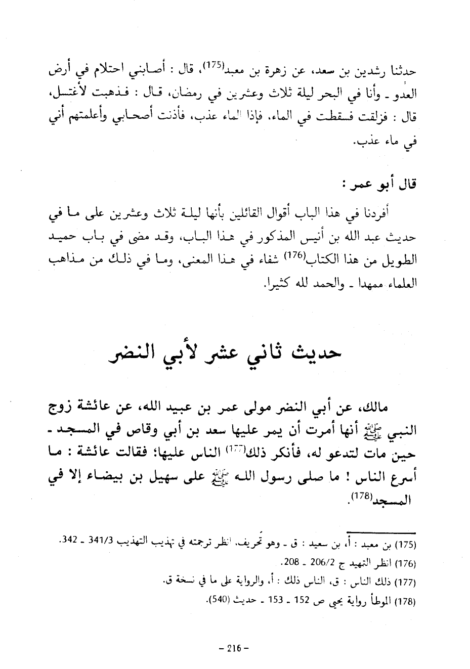 حَدِيثٌ ثَانِي عَشَرَ لِأَبِي النَّضْرِ مَالِكٌ عَنْ أَبِي النَّضْرِ مَوْلَى عُمَرَ بْنِ عُبَيْدِ اللَّهِ عَنْ عَائِشَةَ زَوْجَ النَّبِيِّ صَلَّى اللَّهُ عَلَيْهِ وَسَلَّمَ أَنَّهَا أَمَرَتْ أَنْ يَمُرَّ عَلَيْهَا سَعْدُ بْنُ أَبِي وَقَّاصٍ فِي الْمَسْجِدِ حِينَ مَاتَ لِتَدْعُوَ لَهُ فأنرك ذَلِكَ النَّاسُ عَلَيْهَا فَقَالَتْ عَائِشَةُ مَا أَسْرَعَ النَّاسَ مَا صَلَّى رَسُولُ اللَّهِ صَلَّى اللَّهُ عَلَيْهِ وَسَلَّمَ عَلَى سُهَيْلِ بْنِ بَيْضَاءَ إِلَّا في المسجد