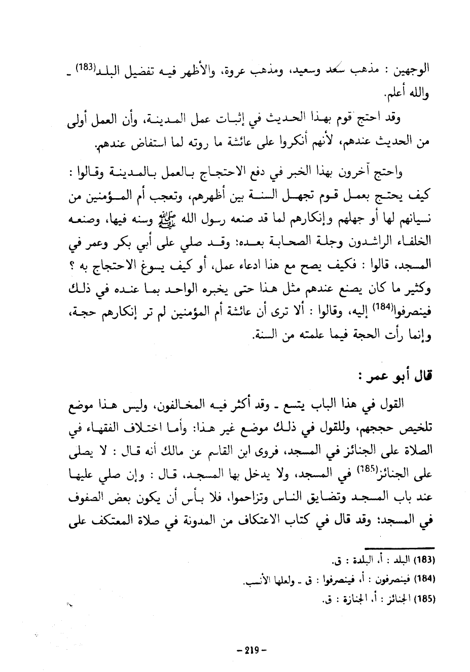 الْوَجْهَيْنِ مَذْهَبَ سَعْدٍ وَسَعِيدٍ وَمَذْهَبَ عُرْوَةَ وَالْأَظْهَرُ فِيهِ تَفْضِيلُ الْبَلَدِ وَاللَّهُ أَعْلَمُ وَقَدِ احْتَجَّ قَوْمٌ بِهَذَا الْحَدِيثِ فِي إِثْبَاتٍ عَمَلِ الْمَدِينَةِ وَأَنَّ الْعَمَلَ أَوْلَى مِنَ الْحَدِيثِ عِنْدَهُمْ لِأَنَّهُمْ أَنْكَرُوا عَلَى عَائِشَةَ مَا رَوَتْهُ لِمَا اسْتَفَاضَ عِنْدَهُمْ وَاحْتَجَّ آخَرُونَ بِهَذَا الْخَبَرِ فِي دَفْعِ الِاحْتِجَاجِ بِالْعَمَلِ بِالْمَدِينَةِ وَقَالُوا كَيْفَ يُحْتَجُّ بِعَمَلِ قوم تجهل السنة بين أظهرهم وتعجب أُمُّ الْمُؤْمِنِينَ مِنْ نِسْيَانِهِمْ لَهَا أَوْ جَهْلِهِمْ وَإِنْكَارِهِمْ لِمَا قَدْ صَنَعَهُ رَسُولُ اللَّهِ صَلَّى اللَّهُ عَلَيْهِ وَسَلَّمَ وَسَنَّهُ فِيهَا وَصَنَعَهُ الْخُلَفَاءُ الرَّاشِدُونَ وَجِلَةُ الصَّحَابَةِ بَعْدَهُ وَقَدْ صُلِّيَ عَلَى أَبِي بَكْرٍ وَعُمَرَ فِي الْمَسْجِدِ قَالُوا فَكَيْفَ يَصِحُّ مَعَ هَذَا ادِّعَاءُ عَمَلٍ أَوْ كَيْفَ يُسُوغُ الِاحْتِجَاجُ بِهِ وَكَثِيرٌ مَا كَانَ يُصْنَعُ عِنْدَهُمْ مِثْلُ هَذَا حَتَّى يُخْبِرُهُ الْوَاحِدُ بِمَا عِنْدَهُ فِي ذَلِكَ فَيَنْصَرِفُوا إِلَيْهِ وَقَالُوا أَلَا تَرَى أَنَّ عَائِشَةَ أُمَّ الْمُؤْمِنِينَ لَمْ تَرَ إِنْكَارَهُمْ حُجَّةً وَإِنَّمَا رَأَتِ الْحُجَّةَ فِيمَا عَلِمَتْهُ مِنَ السُّنَّةِ قَالَ أَبُو عُمَرَ الْقَوْلُ فِي هَذَا الْبَابِ يَتَّسِعُ وَقَدْ أَكْثَرَ فِيهِ الْمُخَالِفُونَ وَلَيْسَ هَذَا مَوْضِعُ تَلْخِيصِ حُجَجِهِمْ وَلِلْقَوْلِ فِي ذَلِكَ مَوْضُعٌ غَيْرُ هَذَا وَأَمَّا اخْتِلَافُ الْفُقَهَاءِ فِي الصَّلَاةِ عَلَى الْجَنَائِزِ فِي الْمَسْجِدِ فَرَوَى ابْنُ الْقَاسِمِ عَنْ مَالِكٍ أَنَّهُ قَالَ لَا يُصَلَّى عَلَى الْجَنَائِزِ فِي الْمَسْجِدِ وَلَا يُدْخَلُ بِهَا الْمَسْجِدُ قَالَ وَإِنْ صُلِّيَ عَلَيْهَا عِنْدَ بَابِ الْمَسْجِدِ وَتَضَايَقَ النَّاسُ وَتَزَاحَمُوا فَلَا بَأْسَ أَنْ يَكُونَ بَعْضُ الصُّفُوفِ فِي الْمَسْجِدِ وَقَدْ قَالَ فِي كِتَابِ الِاعْتِكَافِ مِنَ الْمُدَوَّنَةِ فِي صَلَاةِ الْمُعْتَكِفِ عَلَى