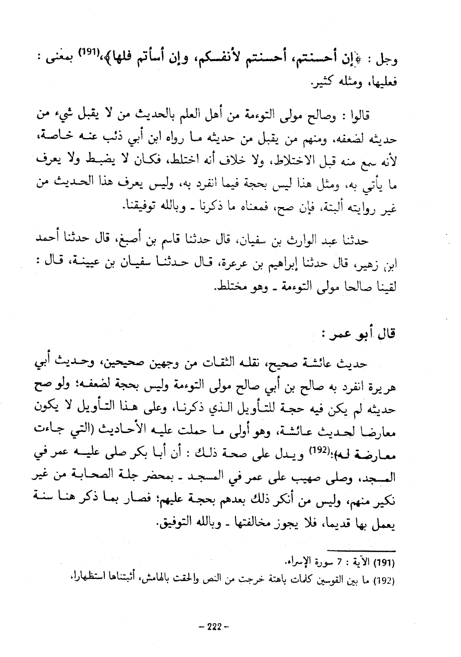 وَجَلَّ إِنْ أَحْسَنْتُمْ أَحْسَنْتُمْ لِأَنْفُسِكُمْ وَإِنْ أَسَأْتُمْ فَلَهَا بِمَعْنَى فَعَلَيْهَا وَمِثْلُهُ كَثِيرٌ قَالُوا وَصَالِحٌ مولى التوءمة مِنْ أَهْلِ الْعِلْمِ بِالْحَدِيثِ مَنْ لَا يَقْبَلُ شَيْءٌ مِنْ حَدِيثِهِ لِضَعْفِهِ وَمِنْهُمْ مَنْ يَقْبَلُ مِنْ حَدِيثِهِ مَا رَوَاهُ ابْنُ أَبِي ذِئْبٍ عَنْهُ خَاصَّةً لِأَنَّهُ سَمِعَ مِنْهُ قَبْلَ الِاخْتِلَاطِ وَلَا خِلَافَ أَنَّهُ اخْتَلَطَ فَكَانَ لَا يَضْبِطُ وَلَا يَعْرِفُ مَا يَأْتِي بِهِ وَمِثْلُ هَذَا لَيْسَ بِحُجَّةٍ فِيمَا انْفَرَدَ بِهِ وَلَيْسَ يُعْرَفُ هَذَا الْحَدِيثُ مِنْ غَيْرِ رِوَايَتِهِ الْبَتَّةَ فَإِنْ صَحَّ فَمَعْنَاهُ مَا ذَكَرْنَا وَبِاللَّهِ تَوْفِيقُنَا حَدَّثَنَا عَبْدُ الْوَارِثِ بْنُ سُفْيَانَ قَالَ حَدَّثَنَا قَاسِمُ بْنُ أَصْبَغَ قَالَ حَدَّثَنَا أَحْمَدُ ابْنُ زُهَيْرٍ قَالَ حَدَّثَنَا إِبْرَاهِيمُ بْنُ عَرْعَرَةَ قَالَ حَدَّثَنَا سُفْيَانُ بْنُ عيينة قال لقينا صالحا مولى التوءمة وَهُوَ مُخْتَلِطٌ قَالَ أَبُو عُمَرَ حَدِيثُ عَائِشَةَ صَحِيحٌ نَقَلَهُ الثِّقَاتُ مِنْ وَجْهَيْنِ صَحِيحَيْنِ وَحَدِيثُ أَبِي هُرَيْرَةَ انْفَرَدَ بِهِ صَالِحُ بْنُ أَبِي صالح مولى التوءمة وَلَيْسَ بِحُجَّةٍ لِضَعْفِهِ وَلَوْ صَحَّ حَدِيثُهُ لَمْ يَكُنْ فِيهِ حُجَّةٌ لِلتَّأْوِيلِ الَّذِي ذَكَرْنَا وَعَلَى هَذَا التَّأْوِيلِ لَا يَكُونُ مُعَارِضًا لِحَدِيثِ عَائِشَةَ وَهُوَ أَوْلَى مَا حُمِلَتْ عَلَيْهِ الْأَحَادِيثُ (الَّتِي جَاءَتْ مُعَارِضَةً لَهُ) وَيَدُلُّ عَلَى صِحَّةِ ذَلِكَ أَنَّ أَبَا بَكْرٍ صَلَّى عَلَيْهِ عُمَرُ فِي الْمَسْجِدِ وَصَلَّى صُهَيْبٌ عَلَى عُمَرَ فِي الْمَسْجِدِ بِمَحْضَرِ جِلَّةِ الصَّحَابَةِ مِنْ غَيْرِ نَكِيرٍ مِنْهُمْ وَلَيْسَ مَنْ أَنْكَرَ ذَلِكَ بَعْدَهُمْ بِحُجَّةٍ عَلَيْهِمْ فَصَارَ بِمَا ذُكِرَ هُنَا سَنَةً يَعْمَلُ بِهَا قَدِيمًا فَلَا يَجُوزُ مُخَالَفَتُهَا وَبِاللَّهِ التَّوْفِيقُ