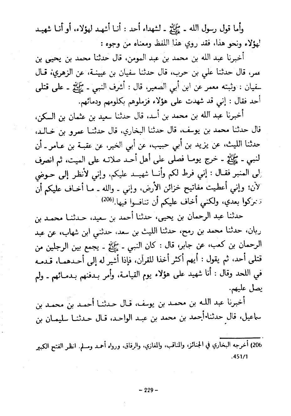 وَأَمَّا قَوْلُ رَسُولِ اللَّهِ صَلَّى اللَّهُ عَلَيْهِ وَسَلَّمَ لِشُهَدَاءِ أُحُدٍ أَنَا أَشْهَدُ لِهَؤُلَاءِ أَوْ أَنَا شَهِيدٌ لِهَؤُلَاءِ وَنَحْوِ هَذَا فَقَدْ رُوِيَ هَذَا اللَّفْظُ وَمَعْنَاهُ مِنْ وُجُوهٍ أَخْبَرَنَا عَبْدُ اللَّهِ بْنُ مُحَمَّدِ بْنِ عَبْدِ الْمُؤْمِنِ قَالَ حَدَّثَنَا مُحَمَّدُ بْنُ يَحْيَى بْنِ عُمَرَ قَالَ حَدَّثَنَا عَلِيُّ بْنُ حَرْبٍ قَالَ حَدَّثَنَا سُفْيَانُ بْنُ عُيَيْنَةَ عَنِ الزُّهْرِيِّ قَالَ سُفْيَانُ وَثَبَّتَهُ مَعْمَرٌ عَنِ ابْنِ أَبِي الصُّعَيْرِ قَالَ أَشْرَفَ النَّبِيُّ صَلَّى اللَّهُ عَلَيْهِ وَسَلَّمَ عَلَى قَتْلَى أُحُدٍ فَقَالَ إِنِّي قَدْ شَهِدْتُ عَلَى هَؤُلَاءِ فَزَمِّلُوهُمْ بِكُلُومِهِمْ وَدِمَائِهِمْ أَخْبَرَنَا عَبْدُ اللَّهِ بْنُ مُحَمَّدِ بْنِ أَسَدٍ قَالَ حَدَّثَنَا سَعِيدُ بْنُ عُثْمَانَ بْنِ السَّكَنِ قَالَ حَدَّثَنَا مُحَمَّدُ بْنُ يُوسُفَ قَالَ حَدَّثَنَا الْبُخَارِيُّ قَالَ حَدَّثَنَا عَمْرُو بْنُ خَالِدٍ حَدَّثَنَا اللَّيْثُ عَنْ يَزِيدَ بْنِ أَبِي حَبِيبٍ عَنْ أَبِي الْخَيْرِ عَنْ عُقْبَةَ بْنِ عَامِرٍ أَنَّ النَّبِيَّ صَلَّى اللَّهُ عَلَيْهِ وَسَلَّمَ خَرَجَ يَوْمًا فَصَلَّى عَلَى أَهْلِ أُحُدٍ صَلَاتَهُ عَلَى الْمَيِّتِ ثُمَّ انْصَرَفَ إِلَى الْمِنْبَرِ فَقَالَ إِنِّي فَرَطٌ لَكُمْ وَأَنَا شَهِيدٌ عَلَيْكُمْ وَإِنِّي لَأَنْظُرُ إِلَى حَوْضِي الْآنَ وَإِنِّي أُعْطِيتُ مَفَاتِيحَ خَزَائِنِ الْأَرْضِ وَإِنِّي وَاللَّهِ مَا أَخَافُ عَلَيْكُمْ أَنْ تُشْرِكُوا بَعْدِي وَلَكِنِّي أَخَافُ عَلَيْكُمْ أن تنافسوا فيها حدثنا عبد الرحمان بْنُ يَحْيَى حَدَّثَنَا أَحْمَدُ بْنُ سَعِيدٍ حَدَّثَنَا مُحَمَّدُ بْنُ رُبَّانَ حَدَّثَنَا مُحَمَّدُ بْنُ رُمْحٍ حَدَّثَنَا اللَّيْثُ بْنُ سَعْدٍ حَدَّثَنِي ابْنُ شِهَابٍ عن عبد الرحمان بْنِ كَعْبٍ عَنْ جَابِرٍ قَالَ كَانَ النَّبِيُّ صَلَّى اللَّهُ عَلَيْهِ وَسَلَّمَ يَجْمَعُ بَيْنَ الرَّجُلَيْنِ مِنْ قَتْلَى أُحُدٍ ثُمَّ يَقُولُ أَيَهُمُّ أَكْثَرُ أَخْذًا لِلْقُرْآنِ فَإِذَا أُشِيرَ لَهُ إِلَى أَحَدِهِمَا قَدَّمَهُ فِي اللَّحْدِ وَقَالَ أَنَا شَهِيدٌ عَلَى هَؤُلَاءِ يَوْمَ الْقِيَامَةِ وَأَمَرَ بِدَفْنِهِمْ بِدِمَائِهِمْ وَلَمْ يُصَلِّ عَلَيْهِمْ أَخْبَرَنَا عَبْدُ اللَّهِ بْنُ مُحَمَّدِ بْنِ يُوسُفَ قَالَ حَدَّثَنَا أَحْمَدُ بْنُ مُحَمَّدِ بْنِ إِسْمَاعِيلَ قَالَ حَدَّثَنَا أَحْمَدُ بْنُ مُحَمَّدِ بْنِ عَبْدِ الْوَاحِدِ قَالَ حَدَّثَنَا سُلَيْمَانُ بْنُ