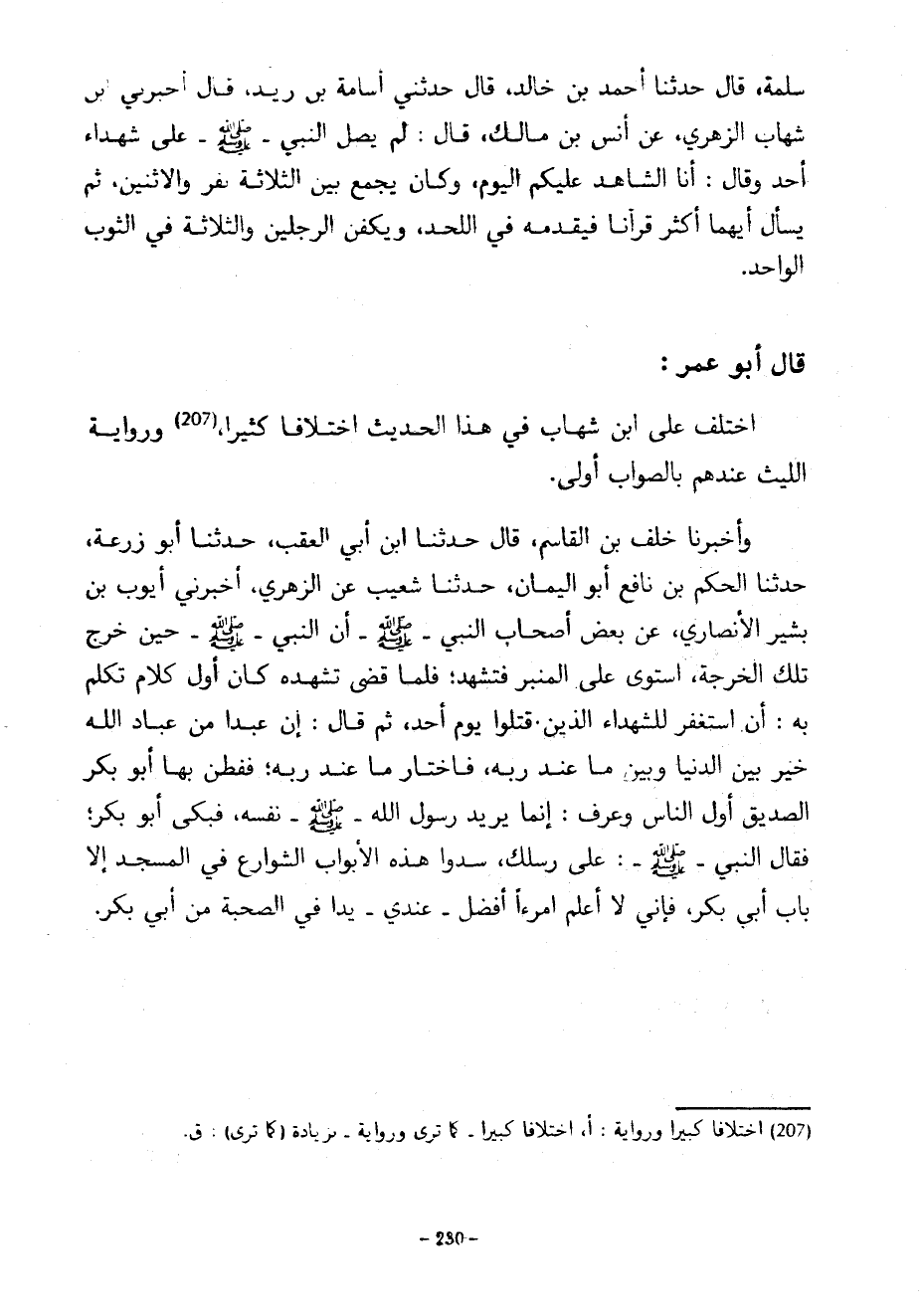 سَلَمَةَ قَالَ حَدَّثَنَا أَحْمَدُ بْنُ خَالِدٍ قَالَ حَدَّثَنِي أُسَامَةُ بْنُ زَيْدٍ قَالَ أَخْبَرَنِي ابْنِ شِهَابٍ الزُّهْرِيِّ عَنْ أَنَسِ بْنِ مَالِكٍ قَالَ لَمْ يُصَلِّ النَّبِيُّ صَلَّى اللَّهُ عَلَيْهِ وَسَلَّمَ عَلَى شُهَدَاءِ أُحُدٍ وَقَالَ أَنَا الشَّاهِدُ عَلَيْكُمُ الْيَوْمَ وَكَانَ يَجْمَعُ بَيْنَ الثَّلَاثَةِ نَفَرٍ وَالِاثْنَيْنِ ثُمَّ يَسْأَلُ أَيُّهُمَا أَكْثَرُ قُرْآنًا فَيُقَدِّمُهُ فِي اللَّحْدِ وَيُكَفِّنُ الرَّجُلَيْنِ وَالثَّلَاثَةِ فِي الثَّوْبِ الْوَاحِدِ قَالَ أَبُو عُمَرَ اخْتُلِفَ عَلَى ابْنِ شِهَابٍ فِي هَذَا الْحَدِيثِ اخْتِلَافًا كَثِيرًا وَرِوَايَةُ اللَّيْثِ عِنْدَهُمْ بِالصَّوَابِ أَوْلَى وَأَخْبَرَنَا خَلَفُ بْنُ الْقَاسِمِ قَالَ حَدَّثَنَا ابْنُ أَبِي الْعَقِبِ حَدَّثَنَا أَبُو زُرْعَةَ حَدَّثَنَا الْحَكَمُ بْنُ نَافِعٍ أَبُو الْيَمَانِ حدثنا شعيب عن الزهري أخبرني أيوب من بَشِيرٍ الْأَنْصَارِيُّ عَنْ بَعْضِ أَصْحَابِ النَّبِيِّ صَلَّى اللَّهُ عَلَيْهِ وَسَلَّمَ أَنَّ النَّبِيَّ صَلَّى اللَّهُ عَلَيْهِ وَسَلَّمَ حِينَ خَرَجَ تِلْكَ الْخَرْجَةَ اسْتَوَى عَلَى الْمِنْبَرِ فَتَشَهَّدَ فَلَمَّا قَضَى تَشْهُدَهُ كَانَ أَوَّلُ كَلَامٍ تَكَلَّمَ بِهِ أَنِ اسْتَغْفَرَ لِلشُّهَدَاءِ الَّذِينَ قَتَلُوا يَوْمَ أُحُدٍ ثُمَّ قَالَ إِنَّ عَبْدًا مِنْ عِبَادِ اللَّهِ خُيِّرَ بَيْنَ الدُّنْيَا وَبَيْنَ مَا عِنْدَ رَبِّهِ فَاخْتَارَ مَا عِنْدَ رَبِّهِ فَفَطِنَ بِهَا أَبُو بَكْرٍ الصِّدِّيقُ أَوَّلَ النَّاسِ وَعَرَفَ إِنَّمَا يُرِيدُ رَسُولُ اللَّهِ صَلَّى اللَّهُ عَلَيْهِ وَسَلَّمَ نَفْسَهُ فَبَكَى أَبُو بَكْرٍ فَقَالَ النَّبِيُّ صَلَّى اللَّهُ عَلَيْهِ وَسَلَّمَ عَلَى رِسْلِكَ سُدُّوا هَذِهِ الْأَبْوَابَ الشَّوَارِعَ فِي الْمَسْجِدِ إِلَّا بَابَ أَبِي بَكْرٍ فَإِنِّي لَا أَعْلَمُ امرءا أفضل عندي يدا فِي الصُّحْبَةِ مِنْ أَبِي بَكْرٍ