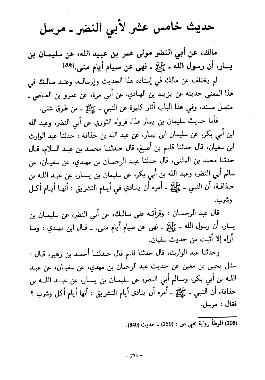 حَدِيثُ خَامِسَ عَشَرَ لِأَبِي النَّضْرِ مُرْسَلٌ مَالِكٌ عَنْ أَبِي النَّضْرِ مَوْلَى عُمَرَ بْنِ عُبَيْدِ اللَّهِ عَنْ سُلَيْمَانَ بْنِ يَسَارٍ أَنَّ رَسُولَ اللَّهِ صَلَّى اللَّهُ عَلَيْهِ وَسَلَّمَ نَهَى عَنْ صِيَامِ أَيَّامِ مِنًى لَمْ يُخْتَلَفْ عَنْ مَالِكٍ فِي إِسْنَادِهِ هَذَا الْحَدِيثِ وَإِرْسَالِهِ وَعِنْدَ مَالِكٍ فِي هَذَا الْمَعْنَى حَدِيثُهُ عَنْ يَزِيدَ بْنِ الْهَادِي عَنْ أَبِي مُرَّةَ عَنْ عَمْرِو بْنِ الْعَاصِي مُتَّصِلٌ مُسْنَدٌ وَفِي هَذَا الْبَابِ آثَارٌ كَثِيرَةٍ عَنِ النَّبِيِّ صَلَّى اللَّهُ عَلَيْهِ وَسَلَّمَ مِنْ طُرُقٍ شَتَّى فَأَمَّا حَدِيثُ سُلَيْمَانَ بْنِ يَسَارٍ هَذَا فَرَوَاهُ الثَّوْرِيُّ عَنْ أَبِي النَّضْرِ وعبد الله ابن أبي بكر عن سليمان ابن يَسَارٍ عَنْ عَبْدِ اللَّهِ بْنِ حُذَافَةَ حَدَّثَنَا عَبْدُ الْوَارِثِ بْنُ سُفْيَانَ قَالَ حَدَّثَنَا قَاسِمُ بْنُ أَصْبَغَ قَالَ حَدَّثَنَا مُحَمَّدُ بْنُ عَبْدِ السَّلَامِ قَالَ حَدَّثَنَا مُحَمَّدُ بْنُ الْمُثَنَّى قَالَ حَدَّثَنَا عبد الرحمان بْنُ مَهْدِيٍّ عَنْ سُفْيَانَ عَنْ سَالِمٍ أَبِي النَّضْرِ وَعَبْدِ اللَّهِ بْنِ أَبِي بَكْرٍ عَنْ سُلَيْمَانَ بْنِ يَسَارٍ عَنْ عَبْدِ اللَّهِ بْنِ حُذَافَةَ أَنَّ النَّبِيَّ صَلَّى اللَّهُ عَلَيْهِ وَسَلَّمَ أَمَرَهُ أَنْ يُنَادِيَ فِي أَيَّامِ التَّشْرِيقِ أَنَّهَا أَيَّامُ أَكْلٍ وَشُرْبٍ قال عبد الرحمان وَقَرَأْتُهُ عَلَى مَالِكٍ عَنْ أَبِي النَّضْرِ عَنْ سُلَيْمَانَ بْنِ يَسَارٍ أَنَّ رَسُولَ اللَّهِ صَلَّى اللَّهُ عَلَيْهِ وَسَلَّمَ نَهَى عَنْ صِيَامِ أَيَّامِ مِنًى قَالَ ابْنُ مَهْدِيٍّ وَمَا أَرَاهُ إِلَّا أَثْبَتَ مِنْ حَدِيثِ سُفْيَانَ وَحَدَّثَنَا عَبْدُ الْوَارِثِ قَالَ حَدَّثَنَا قَاسِمٌ قَالَ حَدَّثَنَا أَحْمَدُ بْنُ زُهَيْرٍ قَالَ سُئِلَ يَحْيَى بْنُ مَعِينٍ عَنْ حديث عبد الرحمان بْنِ مَهْدِيٍّ عَنْ سُفْيَانَ عَنْ عَبْدِ اللَّهِ بْنِ أَبِي بَكْرٍ وَسَالِمِ أَبِي النَّضْرِ عَنْ سُلَيْمَانَ بْنِ يَسَارٍ عَنْ عَبْدِ اللَّهِ بْنِ حُذَافَةَ أَنَّ النَّبِيَّ صَلَّى اللَّهُ عَلَيْهِ وَسَلَّمَ أَمَرَهُ أَنْ يُنَادِيَ أَيَّامَ التَّشْرِيقِ أَنَّهَا أَيَّامُ أَكْلٍ وَشُرْبٍ فَقَالَ مُرْسَلٌ