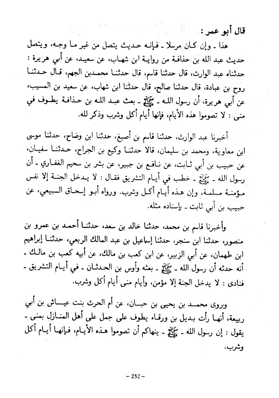 قَالَ أَبُو عُمَرَ هَذَا وَإِنْ كَانَ مُرْسَلًا فَإِنَّهُ حَدِيثٌ يَتَّصِلُ مِنْ غَيْرِ مَا وَجْهٍ وَيَتَّصِلُ حَدِيثُ عَبْدِ اللَّهِ بْنِ حُذَافَةَ مِنْ رِوَايَةِ ابْنِ شِهَابٍ عَنْ سَعِيدٍ عَنْ أَبِي هُرَيْرَةَ حَدَّثَنَا عَبْدُ الْوَارِثِ قَالَ حَدَّثَنَا قَاسِمٌ قَالَ حَدَّثَنَا مُحَمَّدُ بْنُ الْجَهْمِ قَالَ حَدَّثَنَا رَوْحُ بْنُ عُبَادَةَ قَالَ حَدَّثَنَا صَالِحٌ قَالَ حَدَّثَنَا ابْنِ شِهَابٍ عَنْ سَعِيدِ بْنِ الْمُسَيَّبِ عَنْ أَبِي هُرَيْرَةَ أَنَّ رَسُولَ اللَّهِ صَلَّى اللَّهُ عَلَيْهِ وَسَلَّمَ بَعَثَ عَبْدَ اللَّهِ بْنَ حُذَافَةَ يَطُوفُ فِي مِنًى لَا تَصُومُوا هَذِهِ الْأَيَّامَ فَإِنَّهَا أَيَّامُ أَكْلٍ وَشُرْبٍ وَذِكْرٍ لِلَّهِ أَخْبَرَنَا عَبْدُ الْوَارِثِ حَدَّثَنَا قَاسِمُ بْنُ أَصْبَغَ حَدَّثَنَا ابْنُ وَضَّاحٍ حدثنا موسى ابن مُعَاوِيَةَ وَمُحَمَّدُ بْنُ سُلَيْمَانَ قَالَا حَدَّثَنَا وَكِيعُ بْنُ الْجَرَّاحِ حَدَّثَنَا سُفْيَانُ عَنْ حَبِيبِ بْنِ أَبِي ثَابِتٍ عَنْ نَافِعِ بْنِ جُبَيْرٍ عَنْ بِشْرِ بْنِ سُحَيْمٍ الْغِفَارِيِّ أَنَّ رَسُولَ اللَّهِ صَلَّى اللَّهُ عَلَيْهِ وَسَلَّمَ خَطَبَ فِي أَيَّامِ التَّشْرِيقِ فَقَالَ لَا يَدْخُلُ الْجَنَّةَ إِلَّا نَفْسٌ مُؤْمِنَةٌ مُسْلِمَةٌ وَإِنَّ هَذِهِ أَيَّامُ أَكْلٍ وَشُرْبٍ وَرَوَاهُ أَبُو إِسْحَاقَ السَّبِيعِيُّ عَنْ حَبِيبِ بْنِ أَبِي ثَابِتٍ بِإِسْنَادِهِ مِثْلِهِ وَأَخْبَرَنَا قَاسِمُ بْنُ مُحَمَّدٍ حَدَّثَنَا خَالِدُ بْنُ سَعْدٍ حَدَّثَنَا أَحْمَدُ بْنُ عَمْرِو بْنِ مَنْصُورٍ حَدَّثَنَا ابْنُ سَنْجَرَ حَدَّثَنَا إِسْمَاعِيلُ بْنُ عَبْدِ الْمَالِكِ الرَّبَعِيُّ حَدَّثَنَا إبراهيم ابن طَهْمَانَ عَنْ أَبِي الزُّبَيْرِ عَنِ ابْنِ كَعْبِ بْنِ مَالِكٍ عَنْ أَبِيهِ كَعْبِ بْنِ مَالِكٍ أَنَّهُ حَدَّثَهُ أَنَّ رَسُولَ اللَّهِ صَلَّى اللَّهُ عَلَيْهِ وَسَلَّمَ بَعْثَهُ وَأَوْسَ بْنَ الْحَدَثَانِ فِي أَيَّامِ التَّشْرِيقِ فَنَادَى لَا يَدْخُلُ الْجَنَّةَ إِلَّا مُؤْمِنٌ وَأَيَّامُ مِنًى أَيَّامُ أَكْلٍ وَشُرْبٍ وَرَوَى مُحَمَّدُ بْنُ يَحْيَى بْنُ حِبَّانَ عَنْ أُمِّ الحرث بِنْتِ عَيَّاشِ بْنِ أَبِي رَبِيعَةَ أَنَّهَا رَأَتْ بُدَيْلِ بْنِ وَرْقَاءَ يَطُوفُ عَلَى جَمَلٍ عَلَى أَهْلِ الْمَنَازِلِ بِمِنًى يَقُولُ إِنَّ رَسُولَ اللَّهِ صَلَّى اللَّهُ عَلَيْهِ وَسَلَّمَ يَنْهَاكُمْ أَنْ تَصُومُوا هَذِهِ الْأَيَّامَ فَإِنَّهَا أَيَّامُ أَكْلٍ وَشُرْبٍ