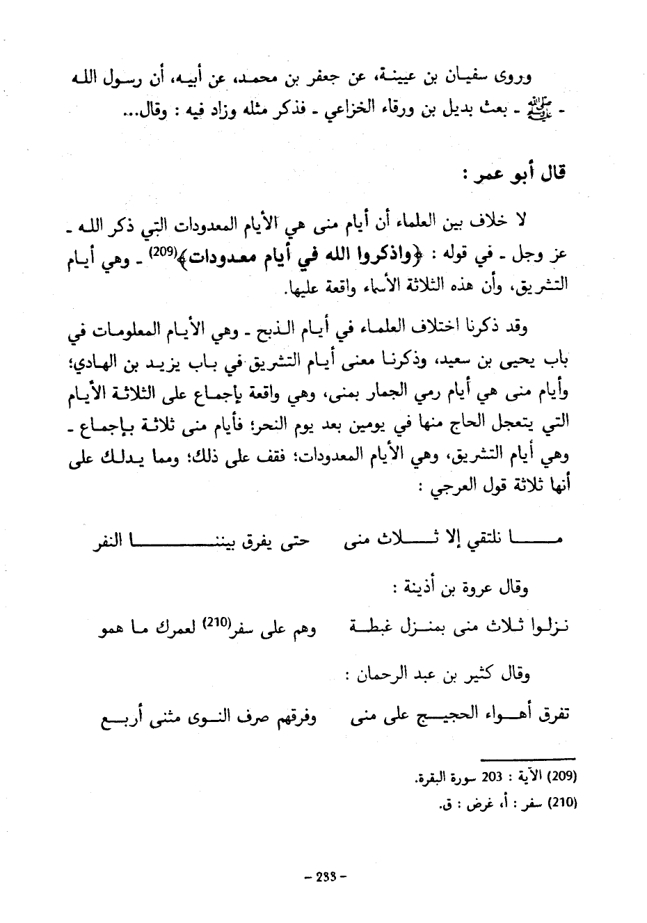 وَرَوَى سُفْيَانُ بْنُ عُيَيْنَةَ عَنْ جَعْفَرِ بْنِ مُحَمَّدٍ عَنْ أَبِيهِ أَنَّ رَسُولَ اللَّهِ صَلَّى اللَّهُ عَلَيْهِ وَسَلَّمَ بَعَثَ بُدَيْلَ بْنَ وَرْقَاءَ الْخُزَاعِيَّ فَذَكَرَ مِثْلَهُ وَزَادَ فِيهِ وَقَالَ قَالَ أَبُو عُمَرَ لَا خِلَافَ بَيْنِ الْعُلَمَاءِ أَنْ أَيَّامَ مِنًى هِيَ الْأَيَّامُ الْمَعْدُودَاتُ الَّتِي ذَكَرَ اللَّهُ عَزَّ وَجَلَّ فِي قَوْلِهِ وَاذْكُرُوا اللَّهَ فِي أَيَّامٍ مَعْدُودَاتٍ وَهِيَ أَيَّامُ التَّشْرِيقِ وَأَنَّ هَذِهِ الثَّلَاثَةَ الْأَسْمَاءَ وَاقِعَةٌ عَلَيْهَا وَقَدْ ذَكَرْنَا اخْتِلَافَ الْعُلَمَاءِ فِي أَيَّامِ الذَّبْحِ وَهِيَ الْأَيَّامُ الْمَعْلُومَاتُ فِي بَابِ يَحْيَى بْنِ سَعِيدٍ وَذَكَرْنَا مَعْنَى أَيَّامِ التَّشْرِيقِ فِي بَابِ يَزِيدَ بْنِ الْهَادِي وَأَيَّامُ مِنًى هِيَ أَيَّامُ رَمْيِ الْجِمَارِ بمنى وهي واقعة بإجماع علىالثلاثة الْأَيَّامَ الَّتِي يَتَعَجَّلُ الْحَاجُّ مِنْهَا فِي يَوْمَيْنِ بَعْدَ يَوْمِ النَّحْرِ فَأَيَّامُ مِنًى ثَلَاثَةٌ بِإِجْمَاعٍ وَهِيَ أَيَّامُ التَّشْرِيقِ وَهِيَ الْأَيَّامُ الْمَعْدُودَاتُ فَقِفْ عَلَى ذَلِكَ وَمِمَّا يَدُلُّكَ عَلَى أَنَّهَا ثَلَاثَةٌ قَوْلُ الْعَرْجِيِّ ... مَا نَلْتَقِي إِلَّا ثَلَاثَ مِنًى ... حَتَّى يُفِرِّقَ بَيْنَنَا النَّفَرُ ... وَقَالَ عُرْوَةُ بْنُ أُذَيْنَةَ ... ... نَزَلُوا ثَلَاثَ مِنًى بِمَنْزِلِ غِبْطَةٍ ... وَهُمُ عَلَى سَفَرٍ لِعَمْرِكَ مَا هُمُو ... وَقَالَ كَثِيرُ بن عبد الرحمان ... ... تُفَرَّقُ أَهْوَاءُ الْحَجِيجِ عَلَى مِنًى ... وَفَرَّقَهُمْ صَرْفُ النَّوَى مَثْنَى أَرْبَعُ