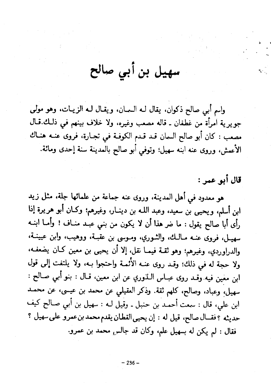 سُهَيْلُ بْنُ أَبِي صَالِحٍ وَاسْمُ أَبِي صَالِحٍ ذَكْوَانُ يُقَالُ لَهُ السَّمَّانُ وَيُقَالُ لَهُ الزَّيَّاتُ وَهُوَ مَوْلَى جُوَيْرِيَةَ امْرَأَةٍ مِنْ غَطَفَانَ قَالَهُ مُصْعَبٌ وَغَيْرُهُ وَلَا خِلَافَ بَيْنِهِمْ فِي ذَلِكَ قَالَ مُصْعَبٌ كَانَ أَبُو صَالِحٍ السَّمَّانُ قَدْ قَدِمَ الْكُوفَةَ فِي تِجَارَةٍ فَرَوَى عَنْهُ هُنَاكَ الْأَعْمَشُ وَرَوَى عَنْهُ ابْنُهُ سُهَيْلٌ وَتُوفِي أَبُو صَالِحٍ بِالْمَدِينَةِ سَنَةَ إِحْدَى وَمِائَةٍ قَالَ أَبُو عُمَرَ هُوَ مَعْدُودٌ فِي أَهْلِ الْمَدِينَةِ وَرَوَى عَنْهُ جَمَاعَةٌ مِنْ عُلَمَائِهَا جُلَّةٌ مِثْلُ زَيْدِ ابن أَسْلَمَ وَيَحْيَى بْنِ سَعِيدٍ وَعَبْدِ اللَّهِ بْنِ دِينَارٍ وَغَيْرِهِمْ وَكَانَ أَبُو هُرَيْرَةَ إِذَا رَأَى أَبَا صَالِحٍ يَقُولُ مَا ضَرَّ هَذَا أَنْ لَا يَكُونَ مِنْ بَنِي عَبْدِ مَنَافٍ وَأَمَّا ابْنُهُ سُهَيْلٌ فَرَوَى عَنْهُ مَالِكٌ وَالثَّوْرِيُّ وَمُوسَى بْنُ عُقْبَةَ وَوُهَيْبٌ وَابْنُ عُيَيْنَةَ وَالدَّرَاوَرْدِيُّ وَغَيْرُهُمْ وَهُوَ ثِقَةٌ فِيمَا نَقَلَ إِلَّا أَنَّ يَحْيَى بْنَ مَعِينٍ كَانَ يُضَعِّفُهُ وَلَا حُجَّةَ لَهُ فِي ذَلِكَ وَقَدْ رَوَى عَنْهُ الْأَئِمَّةُ وَاحْتَجُّوا بِهِ وَلَا يُلْتَفَتُ إِلَى قَوْلِ ابْنِ مَعِينٍ فِيهِ وَقَدْ رَوَى عَبَّاسٌ الثَّوْرِيُّ عَنِ ابْنِ مَعِينٍ قَالَ بَنُو أَبِي صَالِحٍ سُهَيْلٌ وَعَبَّادٌ وَصَالِحٌ كُلُّهُمْ ثِقَةٌ وَذَكَرَ الْعُقَيْلِيُّ عَنْ مُحَمَّدِ بْنِ عِيسَى عَنْ مُحَمَّدِ بْنِ عَلِيٍّ قَالَ سَمِعْتُ أَحْمَدَ بْنَ حَنْبَلٍ وَقِيلَ لَهُ سُهَيْلُ بْنُ أَبِي صَالِحٍ كَيْفَ حَدِيثُهُ فَقَالَ صَالِحٌ قِيلَ لَهُ إِنَّ يَحْيَى الْقَطَّانَ يُقَدِّمُ مُحَمَّدَ بْنَ عَمْرٍو عَلَى سُهَيْلٍ فَقَالَ لَمْ يَكُنْ لَهُ بِسُهَيْلٍ عِلْمٌ وَكَانَ قَدْ جَالَسَ مُحَمَّدَ بن عمرو