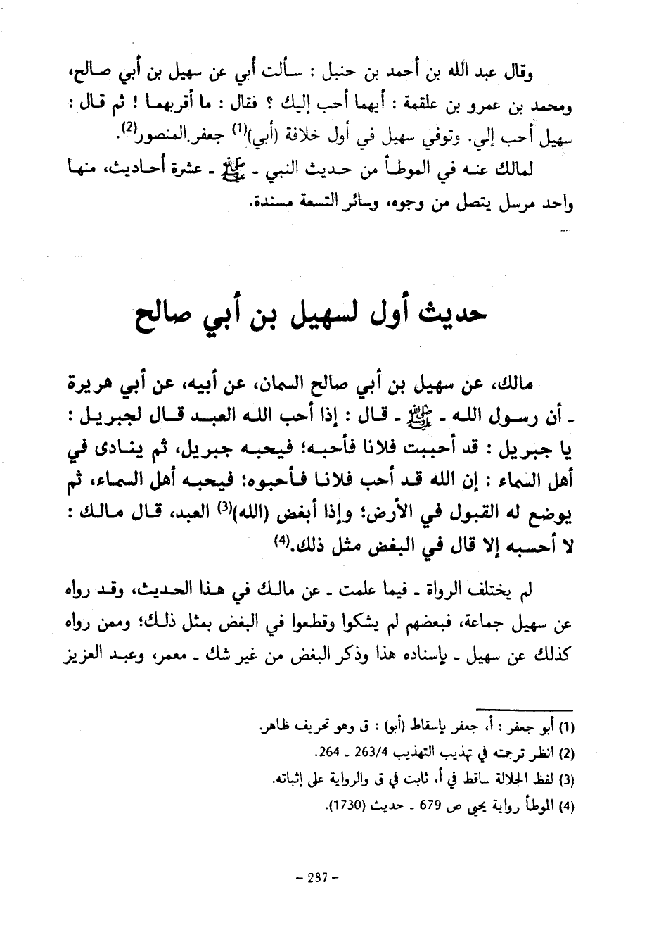 حَدِيثٌ أَوَّلٌ لِسُهَيْلِ بْنِ أَبِي صَالِحٍ مَالِكٌ عَنْ سُهَيْلِ بْنِ أَبِي صَالِحٍ السَّمَّانِ عَنْ أَبِيهِ عَنْ أَبِي هُرَيْرَةَ أَنَّ رَسُولَ اللَّهِ صَلَّى اللَّهُ عَلَيْهِ وَسَلَّمَ قَالَ إِذَا أَحَبَّ اللَّهُ الْعَبْدَ قَالَ لِجِبْرِيلَ يَا جِبْرِيلُ قَدْ أَحْبَبْتُ فُلَانًا فَأَحِبَّهُ فَيُحِبُّهُ جِبْرِيلُ ثُمَّ يُنَادِي فِي أَهْلِ السَّمَاءِ إِنِ اللَّهَ قَدْ أَحَبَّ فُلَانًا فَأَحِبُّوهُ فَيُحِبُّهُ أَهْلُ السَّمَاءِ ثُمَّ يُوضَعُ لَهُ الْقَبُولُ فِي الْأَرْضِ وَإِذَا أَبْغَضَ (اللَّهُ) الْعَبْدَ قَالَ مَالِكٌ لَا أَحْسَبُهُ إِلَّا قَالَ فِي الْبُغْضِ مِثْلَ ذَلِكَ لَمْ يَخْتَلِفِ الرُّوَاةُ فِيمَا عَلِمْتُ عَنْ مَالِكٍ فِي هَذَا الْحَدِيثِ وَقَدْ رَوَاهُ عَنْ سُهَيْلٍ جَمَاعَةٌ فَبَعْضُهُمْ لَمْ يَشُكُّوا وَقَطَعُوا فِي الْبُغْضِ بِمِثْلِ ذَلِكَ وَمِمَّنْ رَوَاهُ كَذَلِكَ عَنْ سُهَيْلٍ بِإِسْنَادِهِ هَذَا وَذَكَرَ الْبُغْضَ مِنْ غَيْرِ شك معمر وعبد العزيز